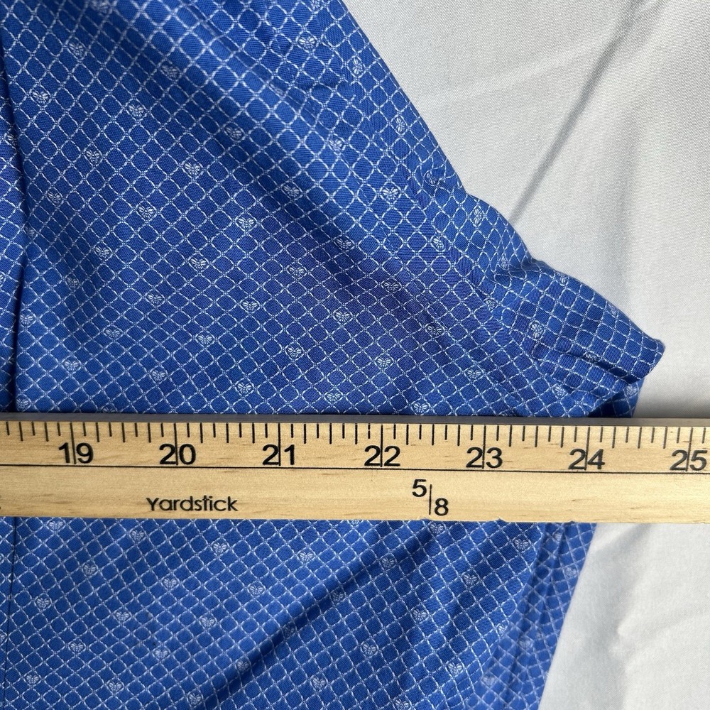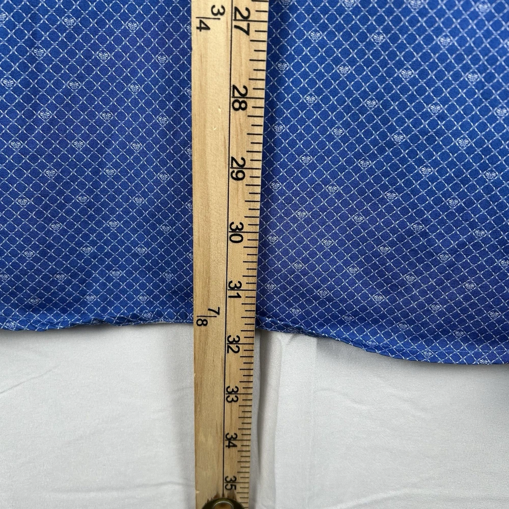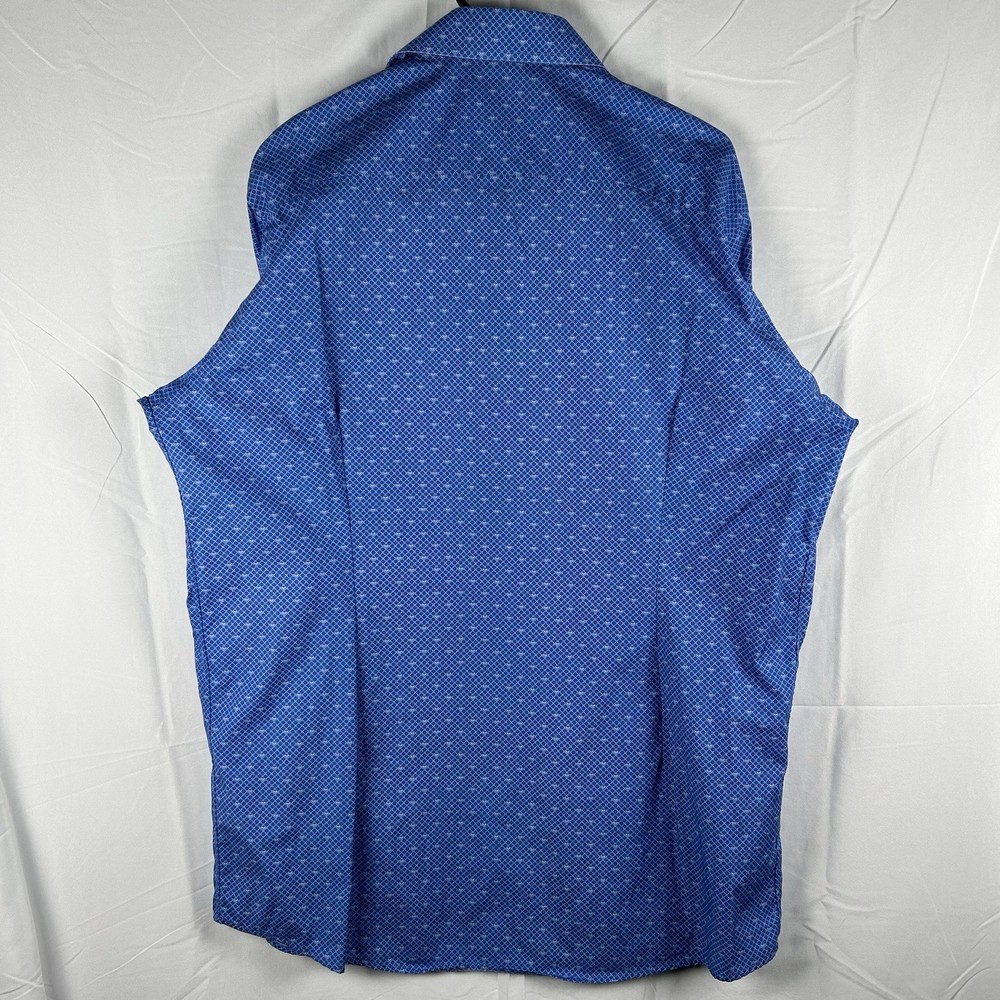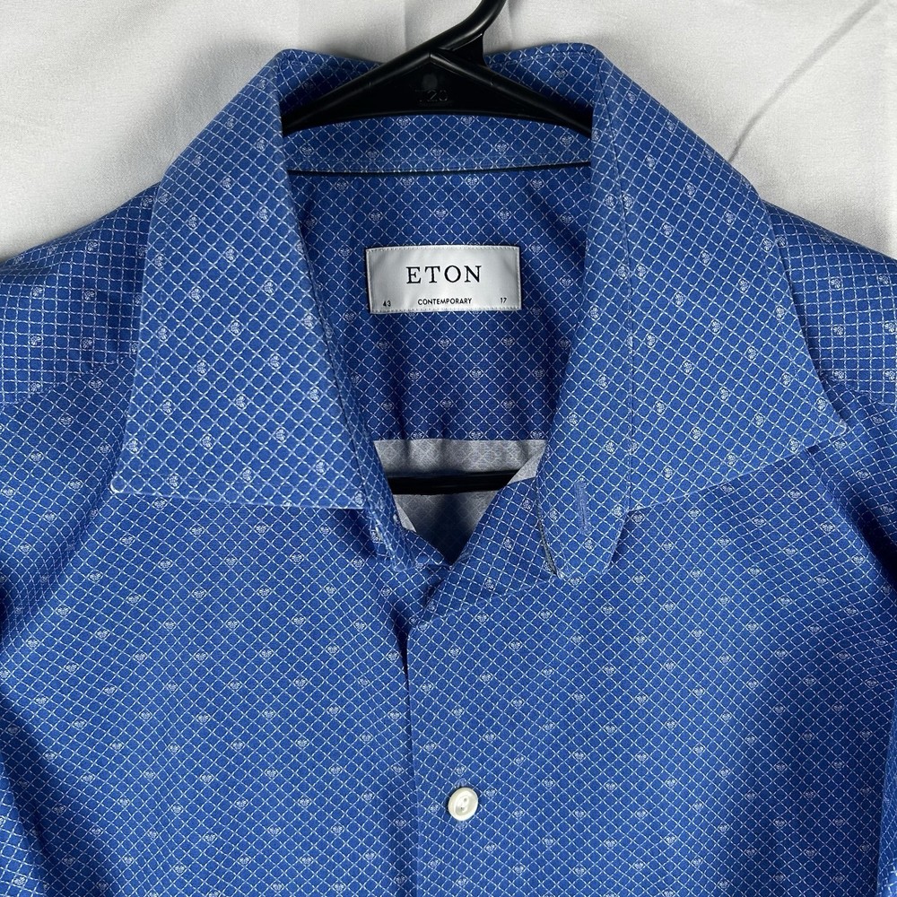 The ETON Contemporary Luxury Cotton Long Sleeve Button Up Dress Shirt in XL size is a sophisticated and stylish option for men. Made from high-quality cotton material, this shirt features a geometric pattern in blue color, making it suitable for casual, formal, and business occasions. The shirt has a collared neckline with a spread collar style and barrel cuff top cuff style, adding a touch of classic and designer flair. With its regular fit and easy care instructions, this shirt is a versatile and timeless addition to any man's wardrobe.