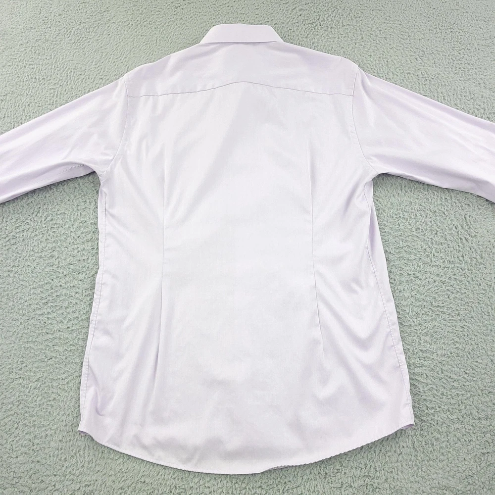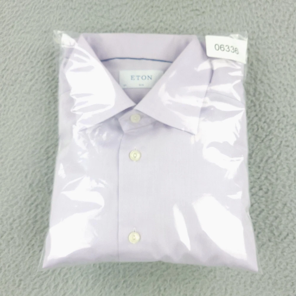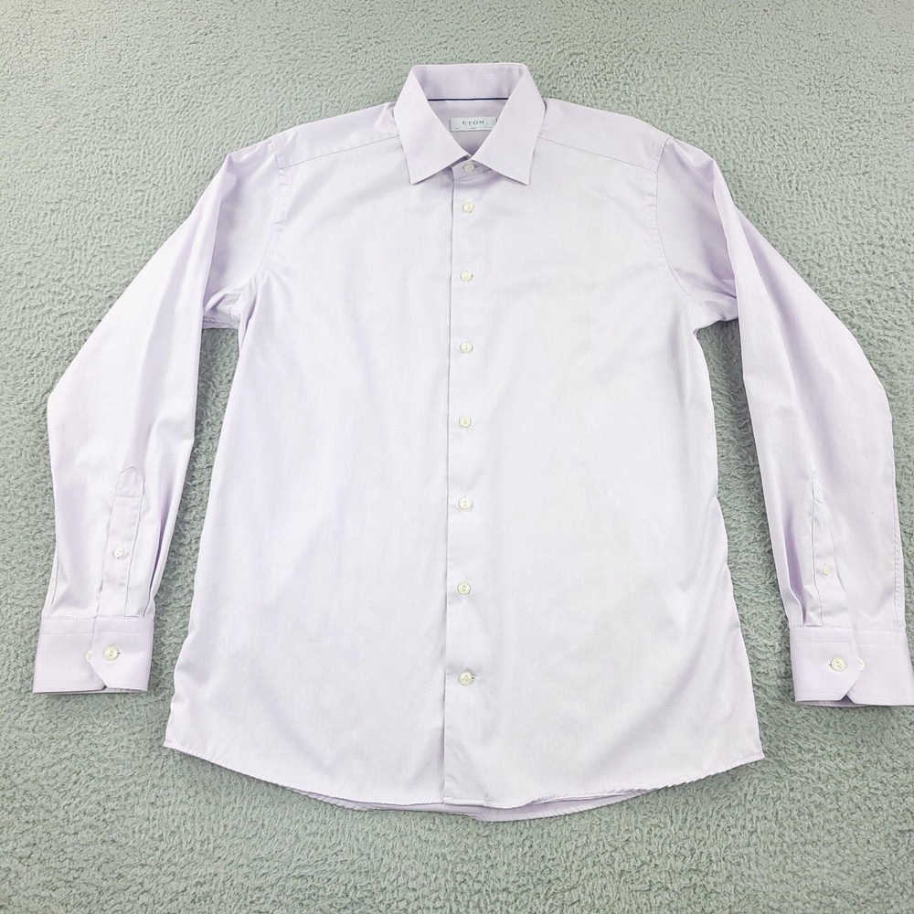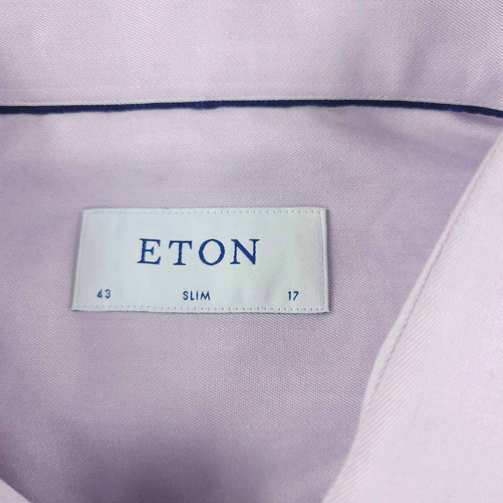 Brand: ETON Item: Mens long sleeve dress shirt with button front and barrel cuffs. Color: Light purple/lavender. Fit: Slim fit tailoring. Size on tag: 43 / 17 (neck 17, approximate EU 43). Material: 100% cotton (per care tag). Country of origin: Made in Romania. Design details: Classic spread collar, front button closure, double-button barrel cuffs, curved hem, smooth solid fabric suitable for business or formal wear. Washed and dried with Fragrance Free Detergent & Dryer Sheets. Measurements are included in the photos, compare measurements with your item to ensure proper fit. (Measurements are done with the item lying flat). I ship next business day and all items include tracking. Items are added daily to my store Visit My Store Buy More & Save! Combined shipping for US customers - $1.99 for each additional item (Add items to shopping cart and discounts will automatically calculate during checkout)