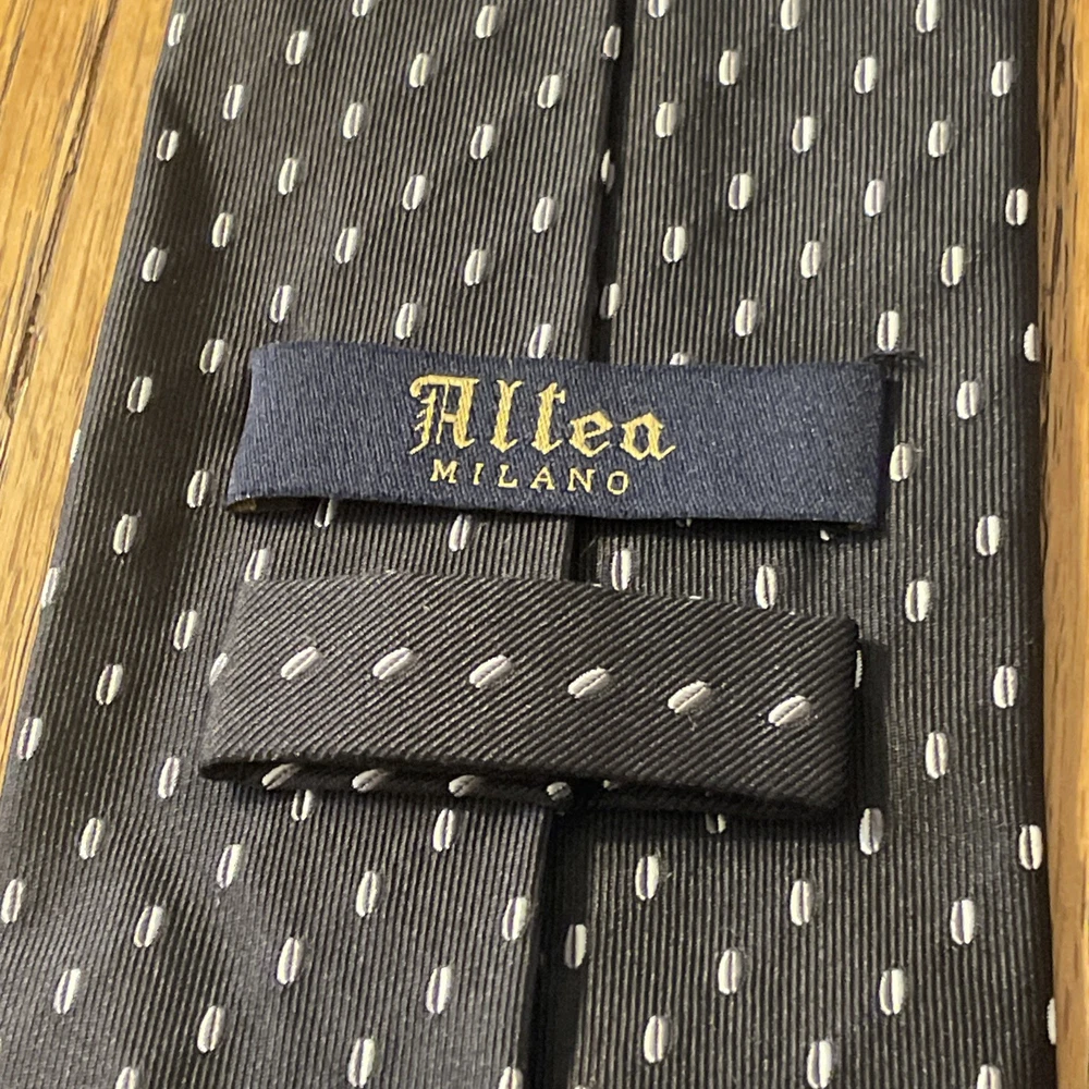 The EUC Altea Milano Woven Geometric Silk Tie is a luxurious men's necktie made in Italy. Crafted from 100% silk fabric with a classic width, this designer tie features a multicolor geometric pattern that exudes a preppy and sophisticated style. The brand's reputation for quality and elegance is evident in this exquisite accessory, perfect for adding a touch of refinement to any formal or professional outfit. Made in Italy, this tie is a standout piece for those who appreciate fine craftsmanship and timeless design.