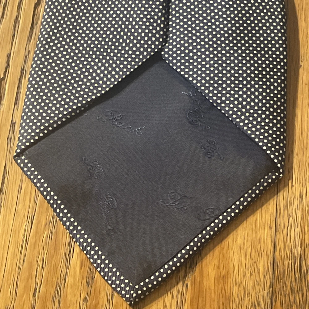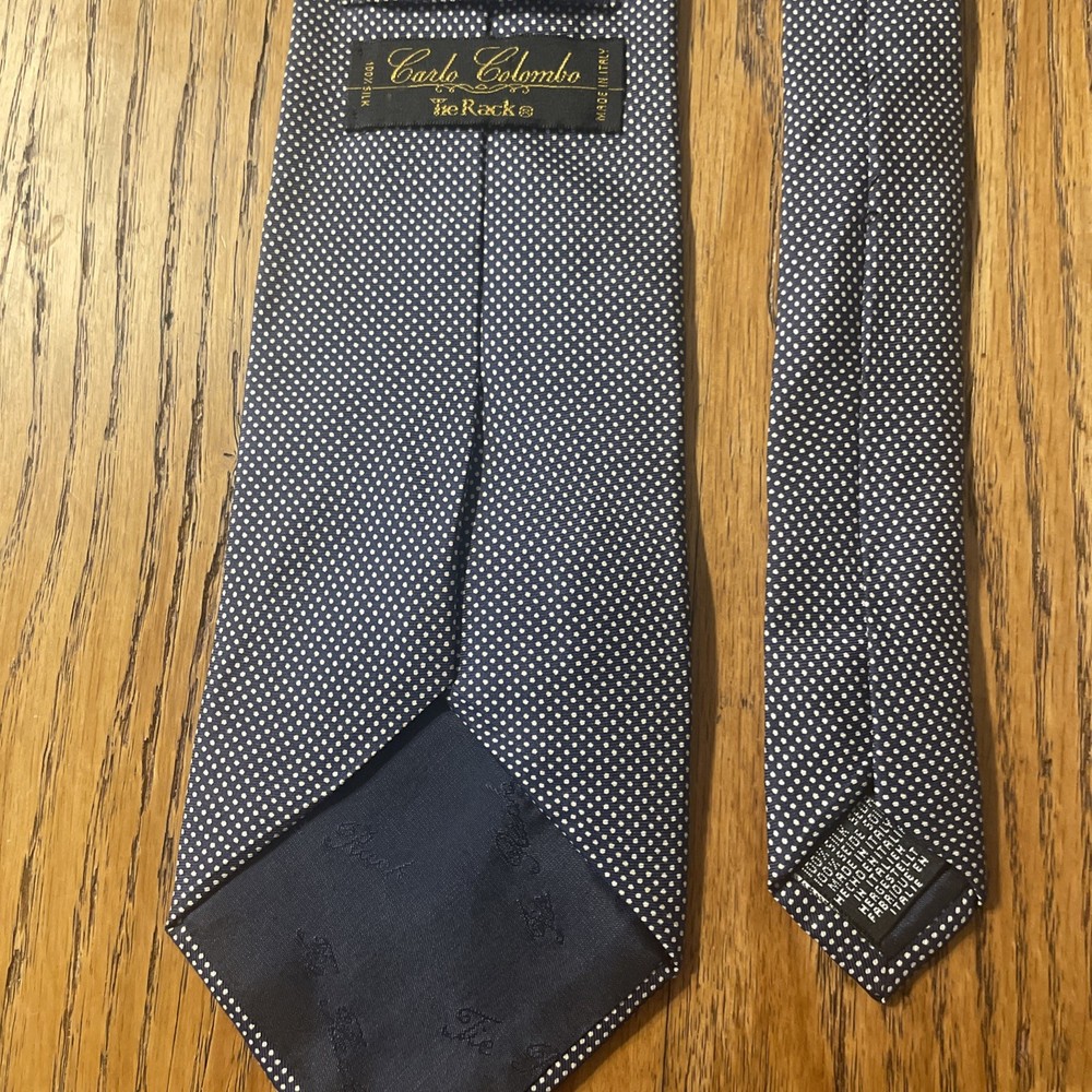 The EUC Carlo Colombo For Tie Rack Silk Fine Dot Pattern Necktie is a designer tie made in Italy from 100% silk. Featuring a classic width and a preppy style, this multicolor tie is crafted with a satin fabric and a fine dot pattern, making it a stylish addition to any man's accessory collection. The Carlo Colombo / Tie Rack brand ensures quality and sophistication in this timeless piece.