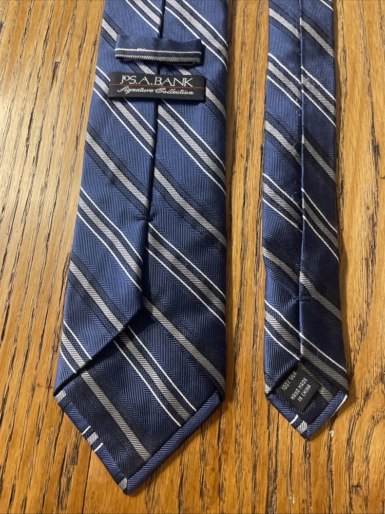The EUC Jos. A. Bank Signature Thick Woven Striped Silk Tie is a high-quality men's accessory designed for the preppy and sophisticated individual. Handmade from 100% silk in a classic width, this designer tie features a multicolor striped pattern that adds a touch of elegance to any outfit. The Jos. A. Bank brand is synonymous with quality and style, making this necktie a versatile and timeless addition to any man's wardrobe.