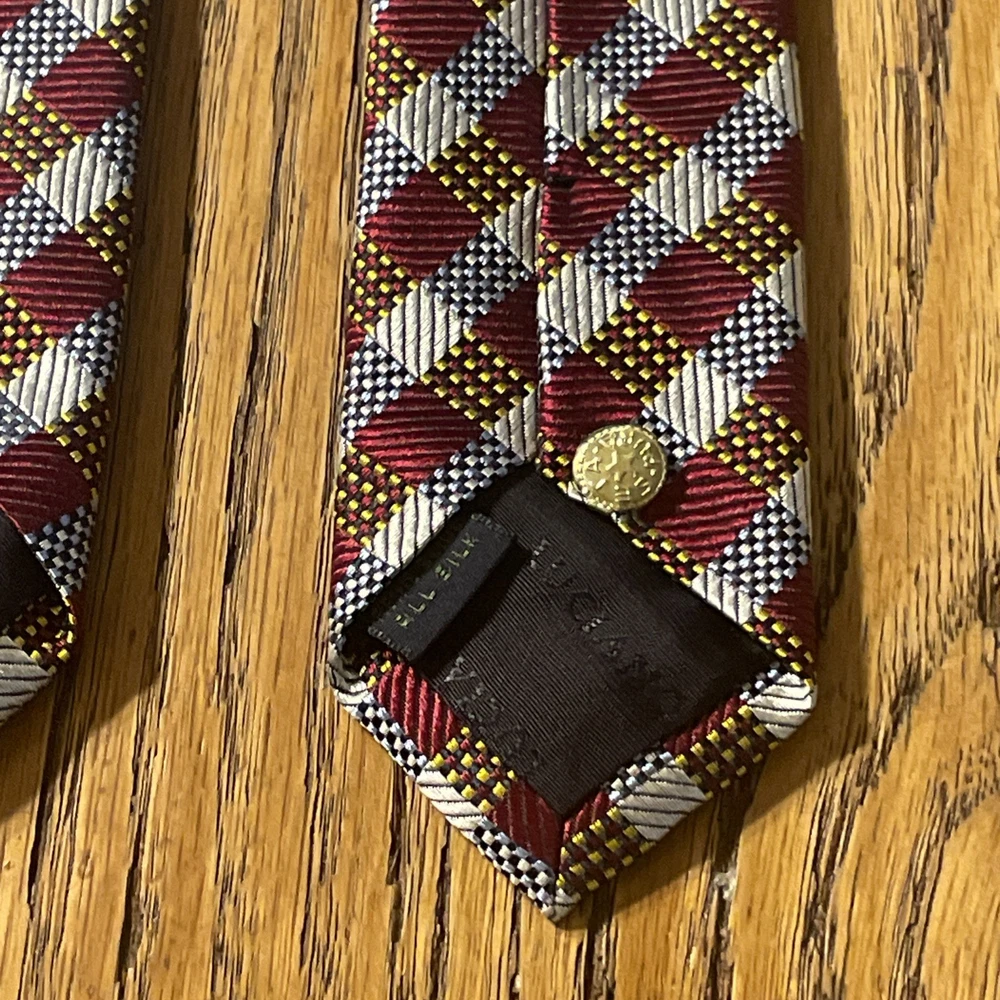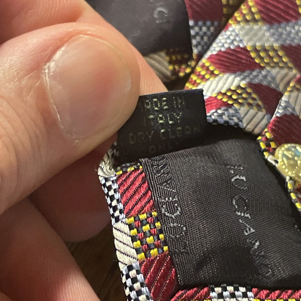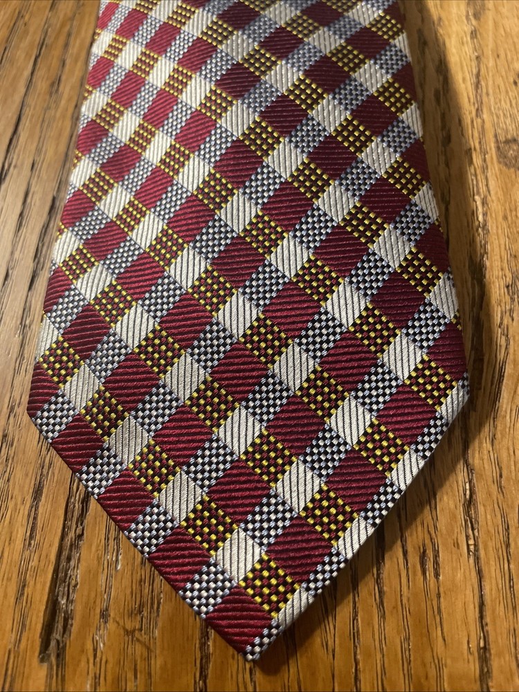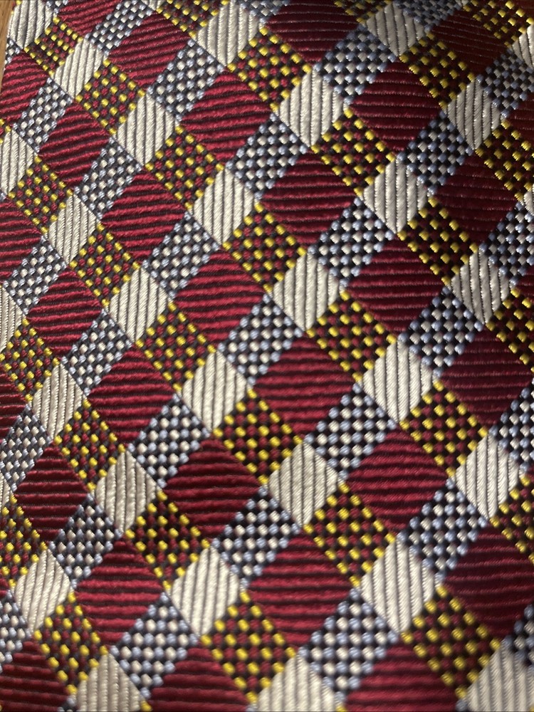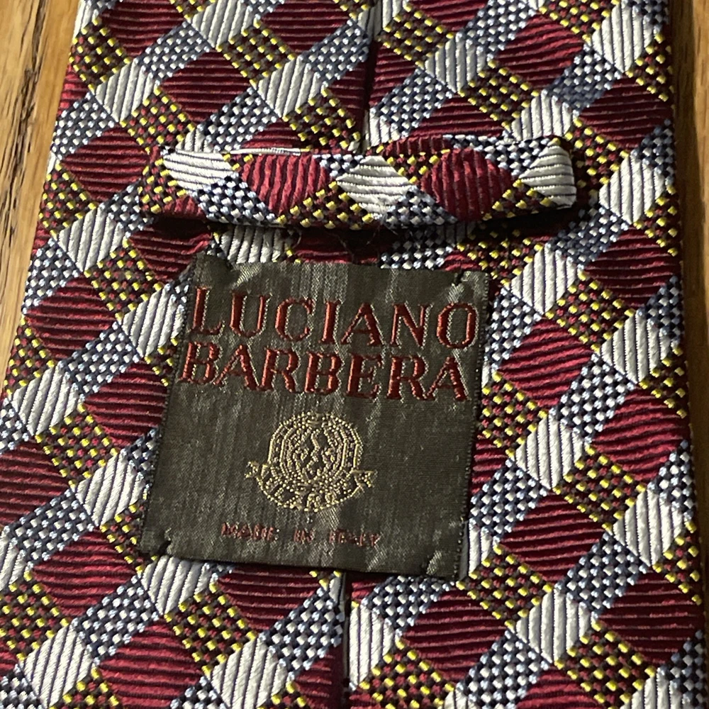 The EUC Luciano Barbera Shiny Thick Silk Geometric Tie is a luxurious men's accessory crafted in Italy. Made from 100% silk fabric, this designer tie features a classic width and a vibrant multicolor geometric pattern, perfect for adding a touch of preppy style to any outfit. The intricate woven design and high-quality material make it a timeless and sophisticated choice for any occasion.