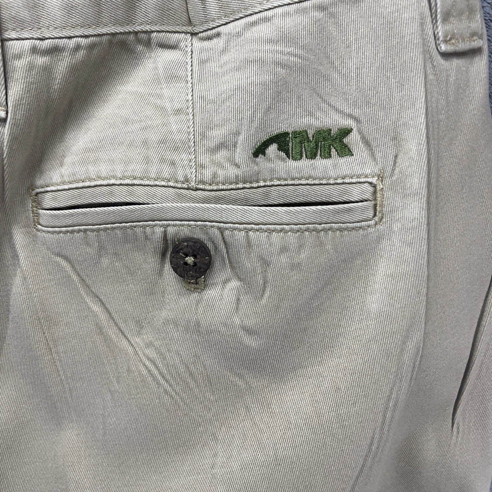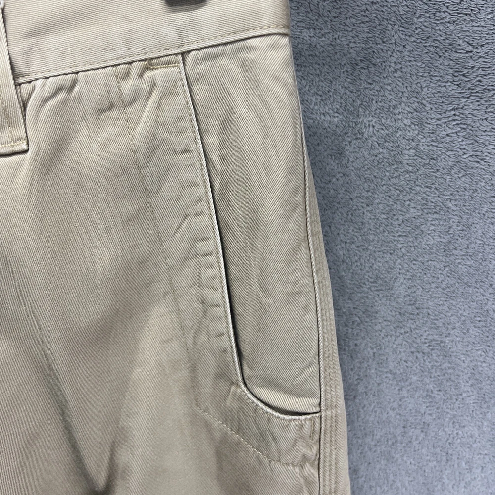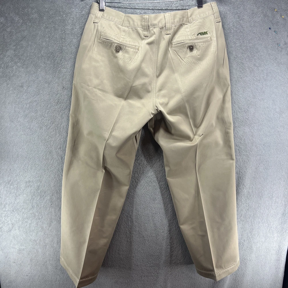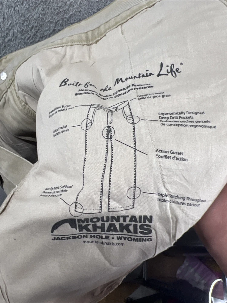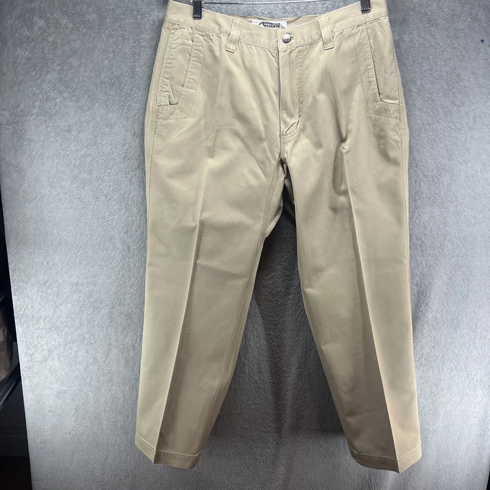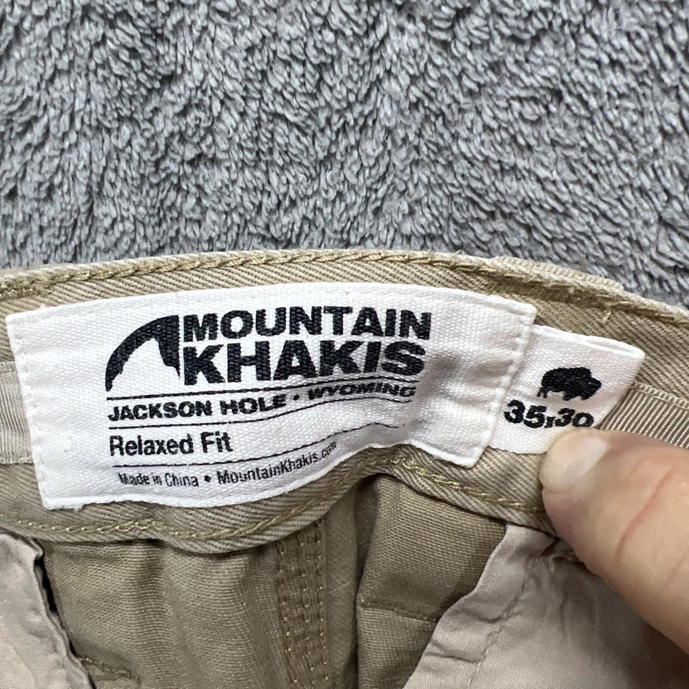 These Mountain Khakis pants are designed for outdoor activities like hiking. Made of durable cotton canvas in a brown color, they feature a solid pattern with a flat front and a mid-rise fit. The pants have a zip and button closure, with a waist size of 35 inches and inseam of 30 inches. They are machine washable and offer comfort and practicality with pockets, making them ideal for travel, casual wear, or workwear in various seasons.