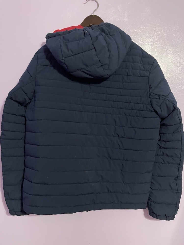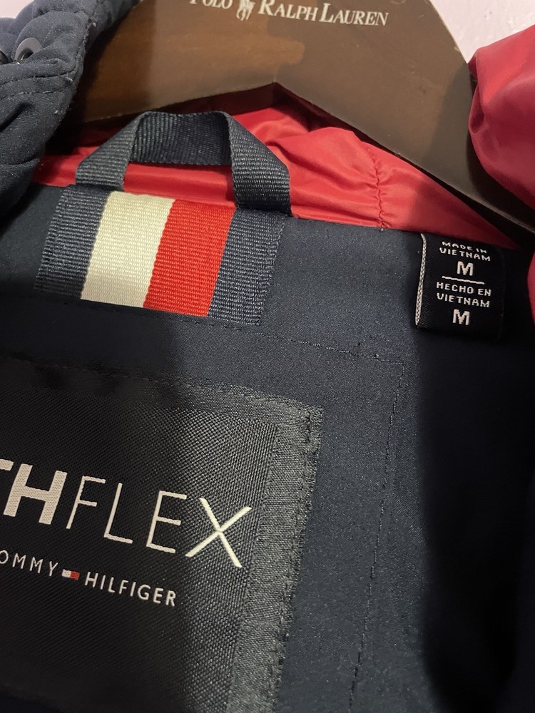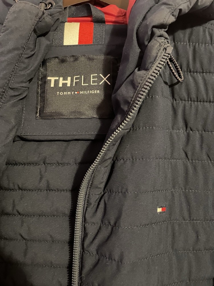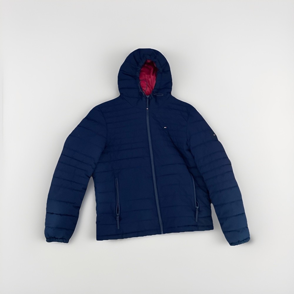 EUC Tommy Hilfiger Men's Med Midnight Navy TH Flex Quilted Puffer Hooded Jacket
