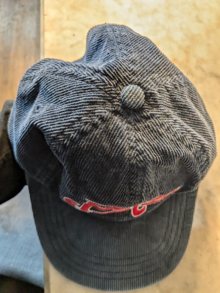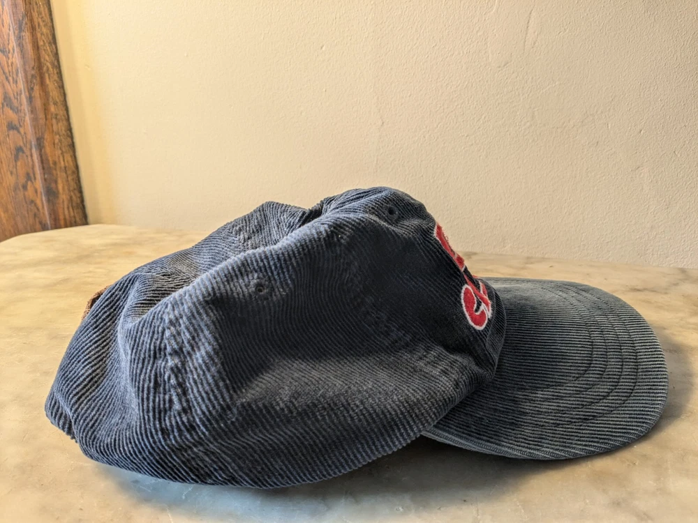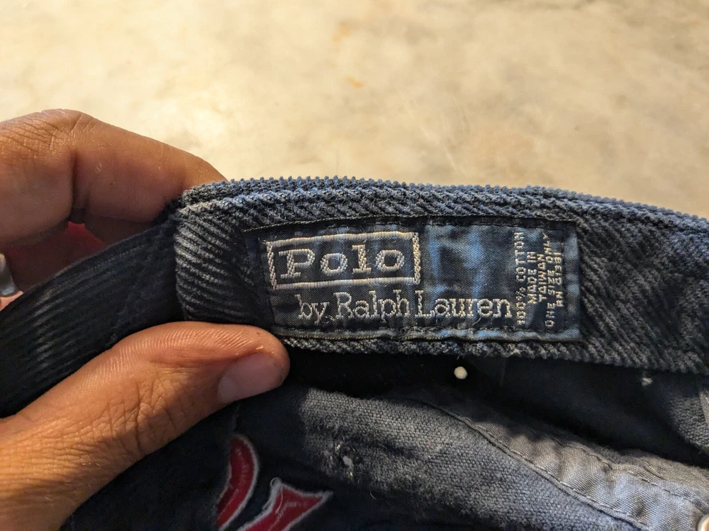EUC Vintage POLO Ralph Lauren corduroy polo script hat Embroidered Logo Navy Red