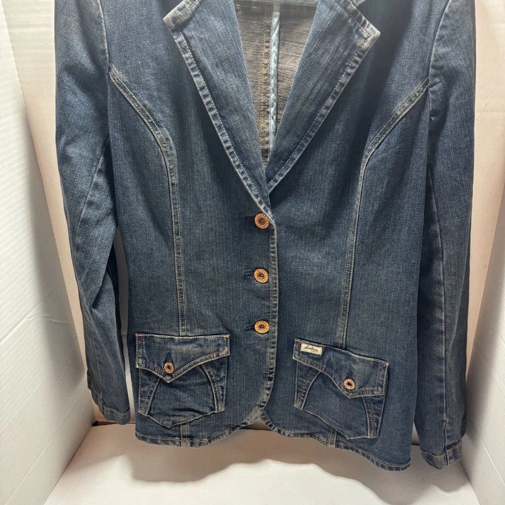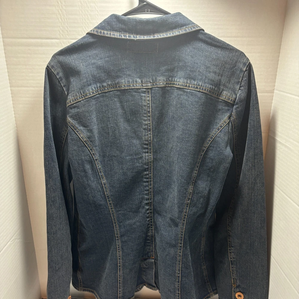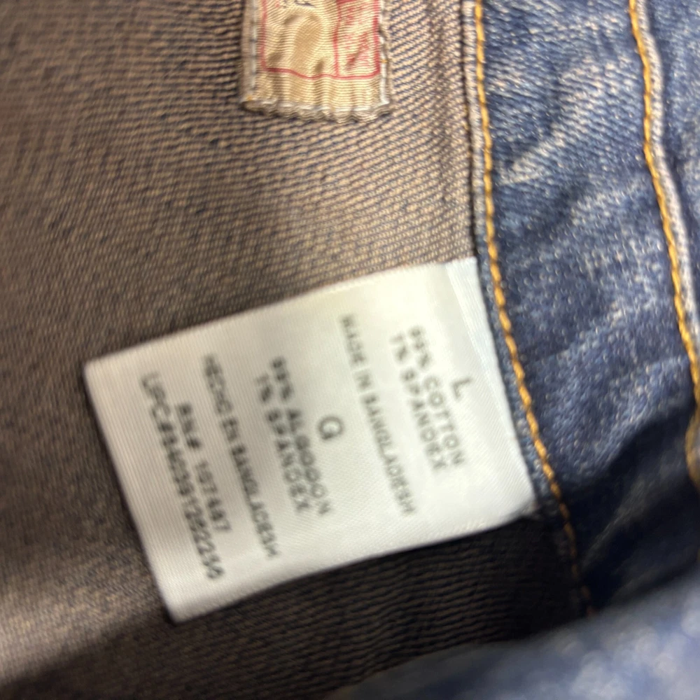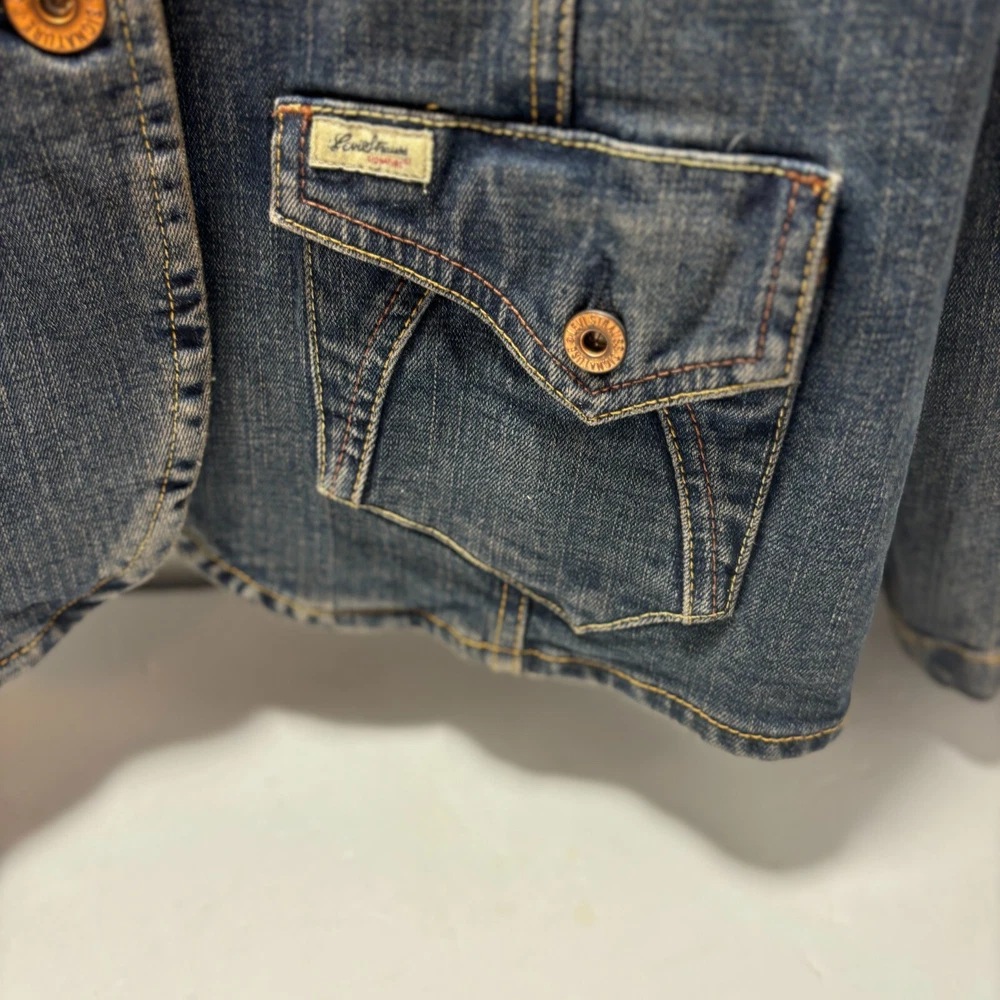 This Levi's Signature Denim Jean Jacket is a must-have for any fashion-forward woman. The jacket features copper buttons, a notch collar, and single-breasted closure. The mid-length coat is made of high-quality cotton denim and is machine washable for easy care. The jacket comes in a beautiful blue color and has long sleeves, making it perfect for winter, fall, and spring seasons. It has pockets for added convenience and is unlined, which makes it ideal for casual occasions. This jacket is a regular fit and is available in size L. Get this Levi's Signature Denim Jean Jacket now and add a touch of style to your wardrobe! Bust measures 40"