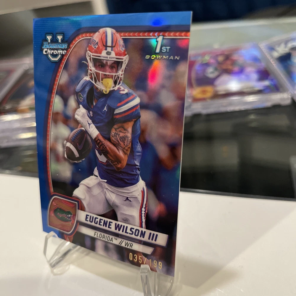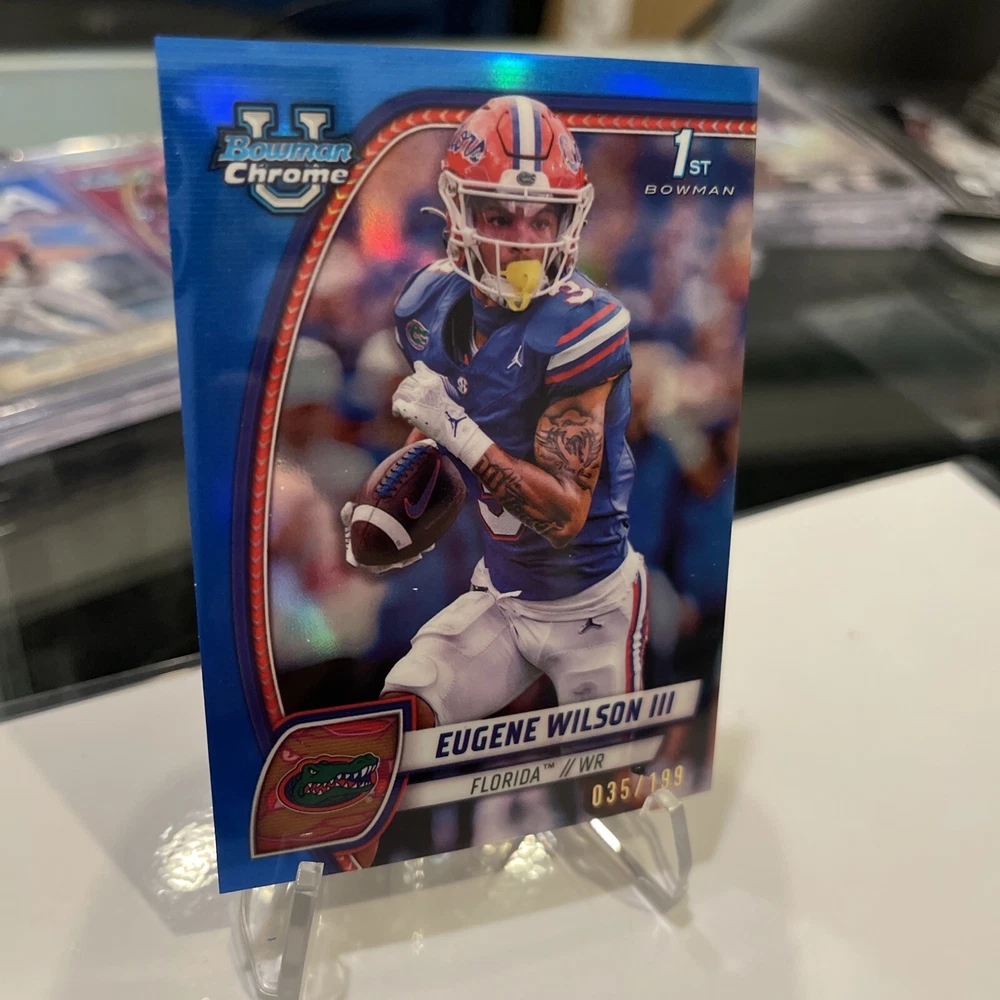 Elevate your collection with the EUGENE WILSON III 2024 Bowman Chrome U Color Match Blue Refractor, limited to just 199 prints. This trading card is a standout piece, featuring the Florida Gators' standout player in a highly sought-after rookie card. The serial numbered card ensures uniqueness and exclusivity for collectors. Crafted by Topps, a trusted name in sports memorabilia, this card belongs to the 2024 Bowman series and boasts the True Blue Refractor parallel, adding a layer of brilliance and rarity. It's a must-have for fans of NCAA football and especially for those who follow the athletic prowess of Eugene Wilson. This card is a tangible piece of football history in the making.