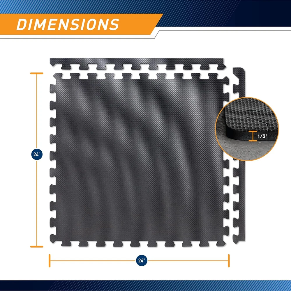 EVA Foam Interlocking Flooring Mat High Density Non-Slip Tiles for Fitness New FOAM FLOORING –This floor mat is built to precision with premium-quality materials. Featuring a lightweight and waterproof surface that is effortless to clean, the non-slip, anti-fatigue ½ thick foam is convenient, durable, and perfect for home use QUALITY UNCOMPROMISED – Each piece of mat is manufactured for long-lasting durability. Unlike other floor mats, Marcy floor mat does not compromise on quality or performance INTERLOCKING COVERAGE MATS – This high-performing gym accessory comes in units of 2 x 2 feet with interlocking edges for easy assembly. It can cover up to 24 square feet of floor space – making it the perfect workout and training accessory HIGH-IMPACT – This anti-fatigue foam flooring offers maximum space, comfort, and protection. Its durable non-slip foam padding will protect and provide comfort to any surface, including your athletic equipment. 26.5 inches x 26.7 inches x 3.83 inches. Weight: 2.74 kg Warranty Description 2-year limited warranty. Number of Items 1 Item Weight 5 Pounds Pattern Solid Country of Origin China Style 1/2" Thick 6 Tiles (24 Sqft) Package Weight 2.74 Kilograms Suggested Users unisex-adult Model Name MAT-20 Item Package Dimensions L x W x H 26.7 x 26.5 x 3.83 inches Included Components six 24"x24" square tiles Item Thickness 0.5 Inches Sport Type Exercise and Fitness Material Type Free Ethylene Vinyl Acetate (EVA), Free of Polyvinyl Chloride (PVC), Free of Lead, Free of Silicone, Free of Bisphenol-A (BPA), Free of Phthalate, Free of Latex Special Feature Non-slipAnti-Fatigue Part Number MAT-20 Item Dimensions LxWxH 72 x 48 x 0.5 inches Color Black - 0.5 Inch - 6 Tiles (24 Sq Ft) Material Ethylene Vinyl Acetate (EVA) Shape Square Global Trade Identification Number 00096362958004 Model Year 2007 Product Dimensions 72"L x 48"W x 0.5"Th Size 72"L x 48"W x 0.5"Th