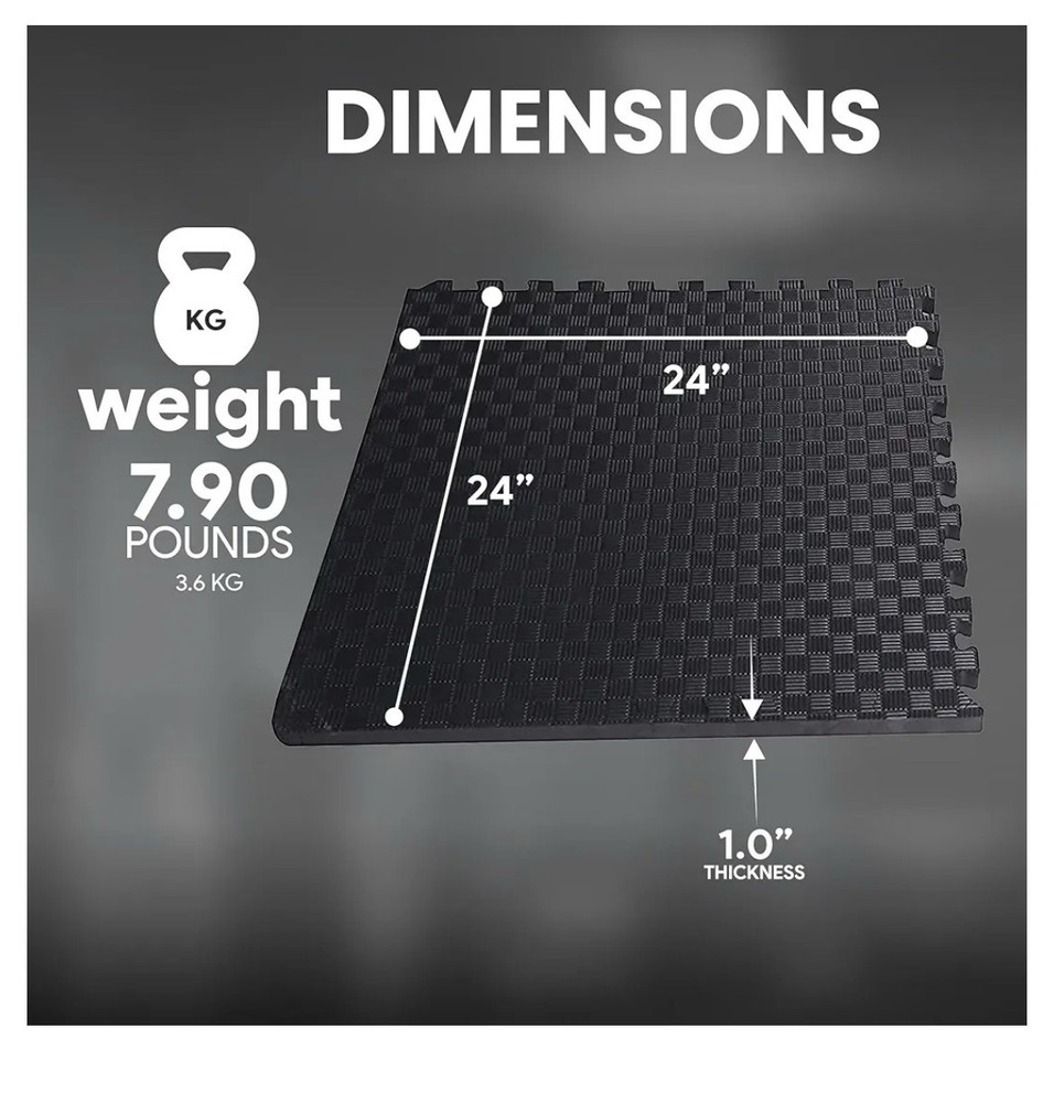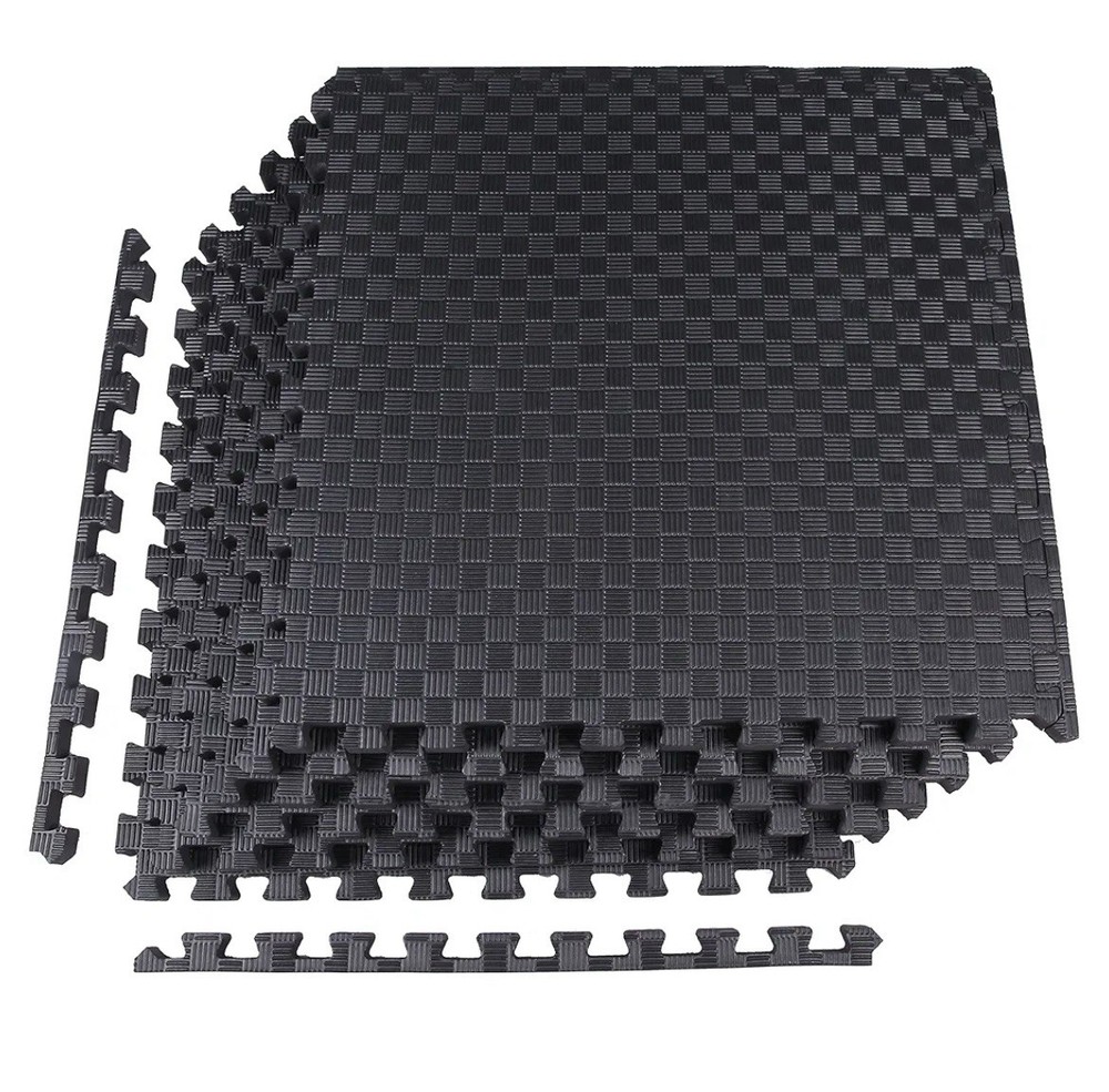 The EVA Foam Puzzle Tiles are 0.75 inches thick, square-shaped exercise flooring mats designed for MMA, gym, and other fitness activities. Made of durable EVA foam material, these non-slip tiles come in a set of 6, each measuring 24 inches in length and width. The black tiles are easy to clean with water and soap, making them ideal for use in home gyms, training studios, and other fitness spaces. Perfect for both men and women, these floor mats provide a comfortable and protective surface for various exercises and activities.