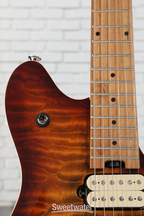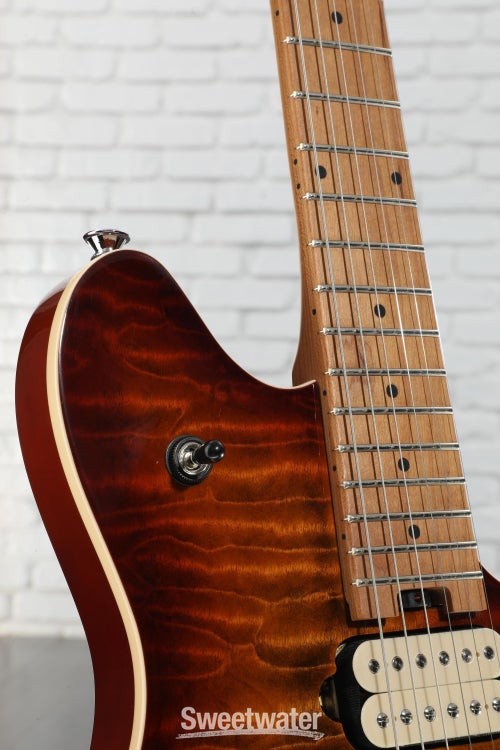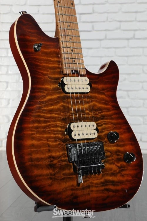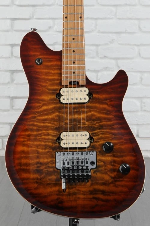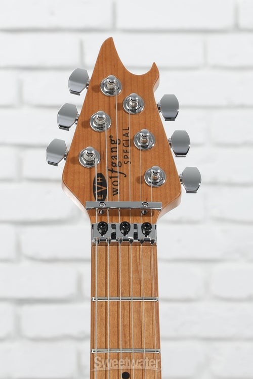 The Spirit of Van Halen Lives on Edward Van Halen’s contributions to the electric guitar are undeniable, and the EVH Wolfgang Special QM Electric Guitar delivers the massive sound and road-tested durability befitting of its legendary namesake. EVH humbuckers in the bridge and neck unleash a blistering yet clear sound, with upgraded volume and tone pots producing smoother swells and clearer tone. The basswood body topped with quilted maple and quartersawn baked maple neck combine for excellent sustain and durability, with a silky baked maple fingerboard ideal for finger-twisting runs and searing leads. Designed to his exact specifications and intentionally positioned against the body, the dive-bomb-only D-Tuna-equipped Floyd Rose lets you mimic Eddie’s signature trem work with ease, along with giving you instant access to Drop D tuning. The EVH Wolfgang Special QM is on fire — pick one up and unleash your creativity while channeling the spirit of a Sweetwater is an Authorized EVH Dealer Genuine Open Box Item Sweetwater's 2-year warranty and 55 point inspection EVH Wolfgang Special QM Electric Guitar - Tiger Eye Glow Solidbody Electric Guitar with Maple Top, Basswood Body, Maple Neck, Maple Fingerboard, Floyd Rose Tremolo, and 2 Humbucking Pickups - Tiger Eye Glow The Spirit of Van Halen Lives on Edward Van Halen’s contributions to the electric guitar are undeniable, and the EVH Wolfgang Special QM Electric Guitar delivers the massive sound and road-tested durability befitting of its legendary namesake. EVH humbuckers in the bridge and neck unleash a blistering yet clear sound, with upgraded volume and tone pots producing smoother swells and clearer tone. The basswood body topped with quilted maple and quartersawn baked maple neck combine for excellent sustain and durability, with a silky baked maple fingerboard ideal for finger-twisting runs and searing leads. Designed to his exact specifications and intentionally positioned against the body, the dive-bomb-only D-Tuna-equipped Floyd Rose lets you mimic Eddie’s signature trem work with ease, along with giving you instant access to Drop D tuning. The EVH Wolfgang Special QM is on fire — pick one up and unleash your creativity while channeling the spirit of a true rock icon. World-class electronics worthy of a guitar legend Run through the wringer and approved by the man himself, EVH humbuckers are a standard in all Wolfgang Special QM guitars. Alnico 2 humbuckers in the bridge and neck go from singing highs to screaming leads with ease, courtesy of a 3-way toggle. Achieving that perfect Van Halen tone requires more than just high-quality pickups, and the Wolfgang Special QM is outfitted with several top-of-the-line components to round out its authentic EVH-inspired sound. Volume swells are smoother than ever with the 500K EVH Bourns low-friction pot, and a 250K Bourns high-friction pot on the tone knob prevents unwanted tone shifts. Top-quality construction made for heavy use To deliver his virtuosic performances on arena stages the world over, Eddie Van Halen demanded a lot from his instruments. This expectation for high quality is built directly into the Wolfgang Special QM series, which is crafted with resonant tonewoods and additional reinforcement for superior playability and rock-solid durability. Sweetwater guitarists love the Wolfgang Special QM’s comfortable, lightweight basswood body and striking quilt maple top, offering a well-balanced tone and extra beefiness in the midrange. If you’re in the market for incredible resonance and sustain, the Wolfgang Special QM’s quartersawn baked maple neck more than delivers, with graphite reinforcement adding additional stability. With its smooth feel and player-friendly comfort, the baked maple fingerboard is primed for a sonic eruption across all 22 jumbo frets. Bend your tone to oblivion with a Floyd Rose locking trem It’s nearly impossible to play any of EVH’s legendary solos without the use of a dependable, heavy-duty tremolo. Appropriately, the Wolfgang Special QM comes stock with a tried-and-true Floyd Rose locking trem — perfect for dive-bombs, squeals, and bends all while keeping your strings in tune. The addition of an EVH D-Tuna allows you to tune down to Drop D and back with the simple flick of a finger, adding even more versatility to this hard-rocking machine. EVH Wolfgang Special QM Electric Guitar Features: Designed and approved by Eddie Van Halen himself Alnico 2 humbuckers produce searing Van Halen tone Lightweight basswood body and quilt maple top adds sustain and resonance Graphite-reinforced quartersawn baked maple neck for increased durability Fast-playing baked maple fingerboard Upgraded volume and tone pots EVH-branded Floyd Rose tremolo allows for twisting, bending, and dive-bombing EVH D-Tuna for instant Drop D tuning Specification Detail Number of Strings 6 Left-/Right-handed Right-handed Body Type Solidbody Body Shape Wolfgang Special Body Material Basswood Top Material Quilted Maple Color Tiger Eye Glow Body Finish Gloss Polyester Neck Material Quartersawn Baked Maple Neck Shape Wolfgang Neck Joint Bolt-on Radius 12"-16" Compound Fingerboard Material Baked Maple Fingerboard Inlay Dots Number of Frets 22, Jumbo Scale Length 25.5" Nut Width 1.625" Nut Material Floyd Rose R2 Locking Bridge/Tailpiece EVH-Branded Floyd Rose Special Locking Tremolo Tuners EVH-branded Neck Pickup EVH Wolfgang Humbucker Bridge Pickup EVH Wolfgang Humbucker Controls 1 x volume, 1 x tone Strings Nickel Plated Steel, .009-.042 Case/Gig Bag Sold Separately RETURN INFORMATION We want you to be completely happy with your purchase from Sweetwater. If you are not satisfied with your product, you may return it for a refund of the purchase price within 30 days. If your purchase was eligible for Free Shipping, the shipping cost will be deducted from your credit or refund. Returns must be in the complete and original packaging with all accessories and complete documentation (O
