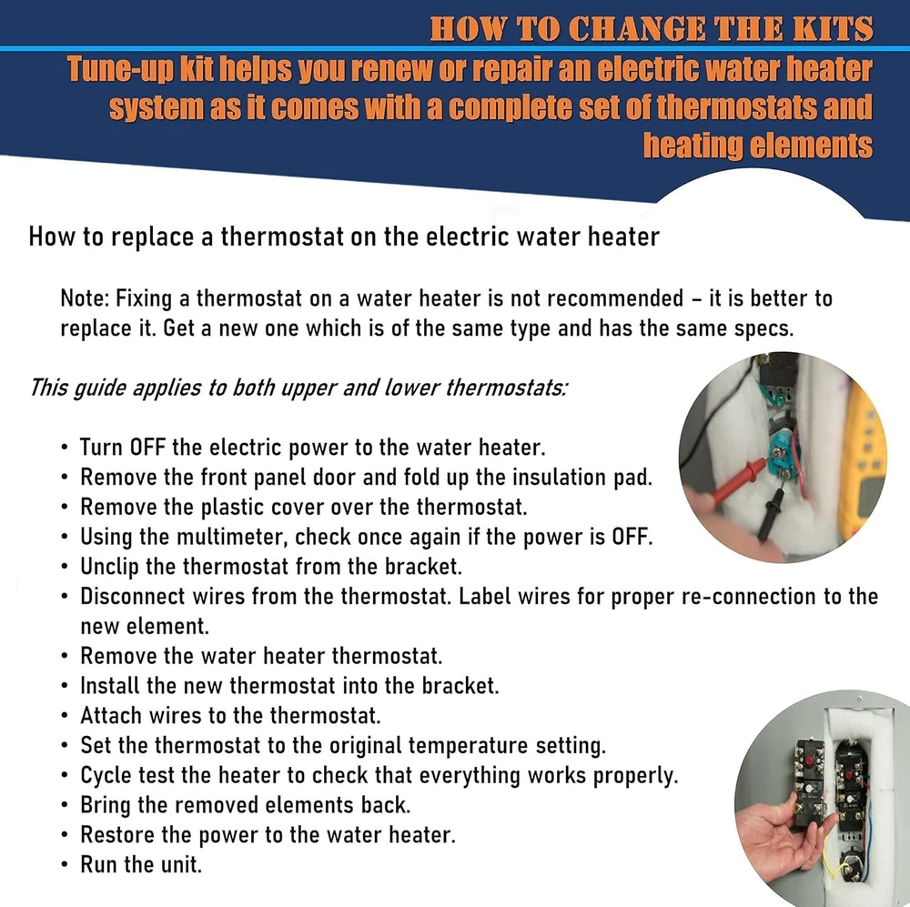 EWH-00 Electric Water Heater Thermostat for double element Heater, ENJOY THE FEATURES 【Contains】 1 x Upper water heater Thermostat and 1 x Lower water heater Thermostat , Non-Simultaneous, 120V ~ 480V Temperature Adjustment Range: 90F ~ 150F. Thermo-O-Disc(TOD) Style, can exchangeable with Apcom Style KST series controls are designed to meet the high electrical capacity requirements of electric water heaters, using a temperature sensitive bimetal disc to deliver snap-action to the contacts. It has a long use time. The Electric Water Heater thermostats( tune-up kit/ Repair Kit/ Plumber'S Pack),FIT MOST MODELS OF WATER HEATERS: Whirlpool, BRADFORD WHITE; CRAFTMASTER; GENERAL ELECTRIC; GS WOOD; KENMORE; LOCHINVAR; A O SMITH; RELIANCE; RHEEM; RICHMOND; RUUD; STATE; MOR-FLO; APCOM 2B Trading, LLC 2B Trading, LLC has been formed in 2022 with the mission of offering high quality products to customers at low prices. It operates on various categories products in the e-commerce sector in USA. It sells products in many categories. With its experienced team, it continues to work in order to offer high quality products to customers at low prices. Our Mission is to ensure that each of our customers is satisfied with their shopping. Our Vision is to become a well-known brand with a wide product portfolio in the e-commerce sector. * Customer satisfaction is our first priority We believe that we will grow with your good shopping experiences together. We work every day to provide you better service. * We are always with our customers. We are happy to help you if you have any problem about your shopping. We are always ready to listen to your feedback in order to provide better service to you. SHIPPING We are committed to ensuring your package arrives as quickly as possible. However, please understand that factors such as weather, high postal traffic, or carrier performance may occasionally cause delays that are beyond our control. We proudly offer free shipping and aim to ship your order within 2 business days. Please note: We are unable to deliver to P.O. Boxes, so kindly provide a physical address to avoid any delays. Thank you for your understanding and for choosing us!