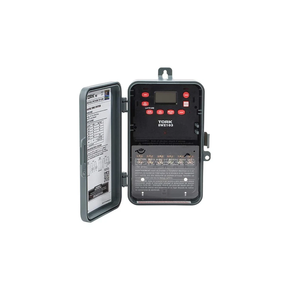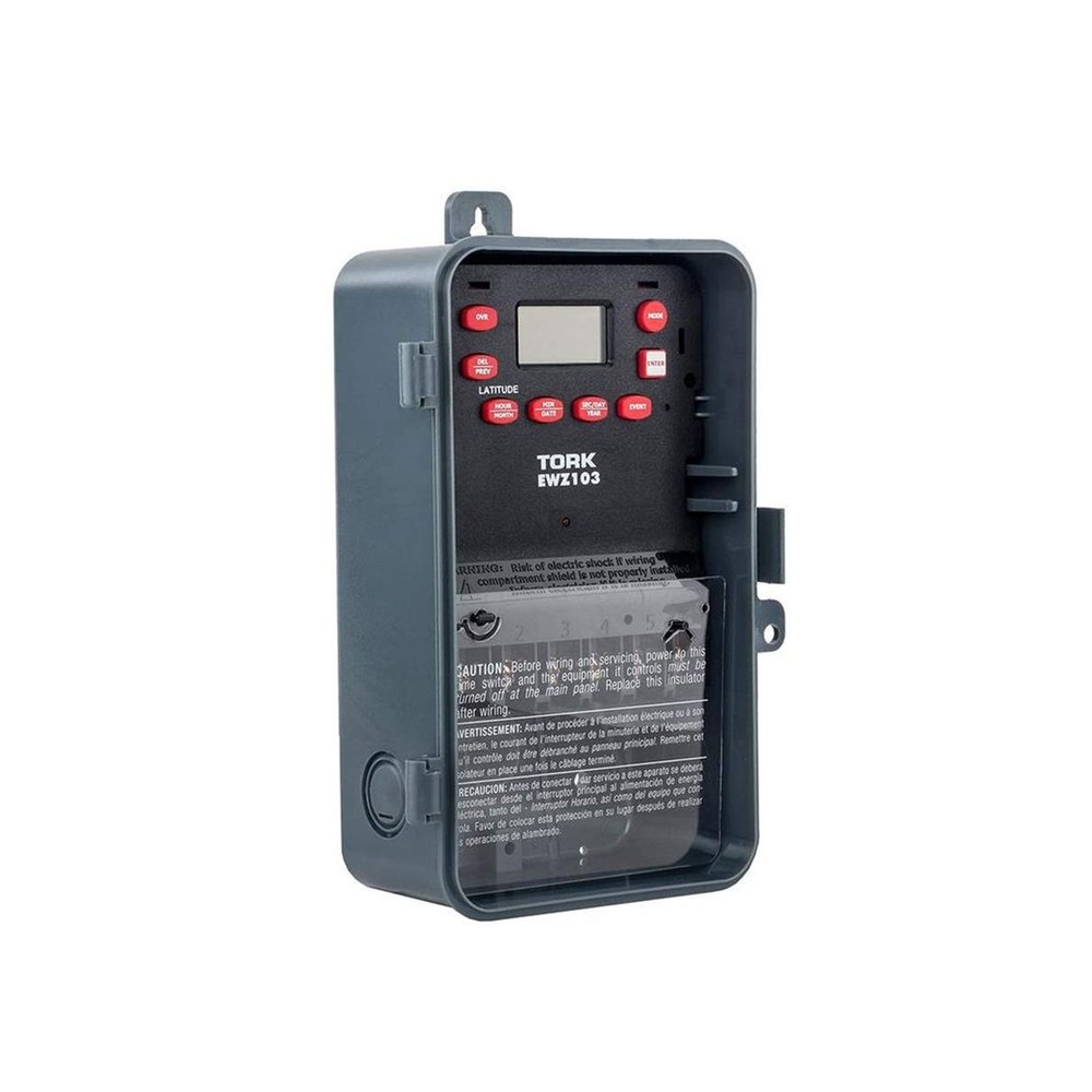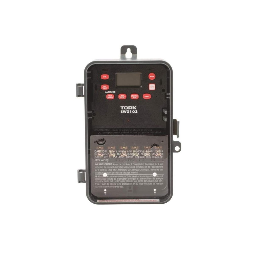 EWZ Series Multipurpose Control Astronomic 7 Day Time Switch, 120-277 VAC Input Supply, 1 Channel, DPST Output Dry Contact Description This NSi Industries EWZ103 digital time switch accepts 120-277 VAC input and its DPST output contacts can activate a 40 amp load or 2 hp motor. The switch automatically detects the input voltage and does not require manual voltage setting. This timer includes 20 pairs of on/off set points, has a minimum cycle time of one minute, and is suitable for individualized daily operation. A rechargeable super capacitor provides four days of backup power to maintain time and schedule settings. This timer can adjust for daylight saving time and leap year and compensate for sunrise and sunset variation based on Earth's latitude. The double-pole single-throw (DPST) contacts are housed within a Noryl plastic alloy enclosure that meets NEMA-3R standards for water resistance and has a lockable hasp. The enclosure is suitable for both indoor and outdoor use and mounts to an external surface. This digital timer is Underwriter Laboratories (UL) Listed and Canadian Standards Association (CSA) certified for quality assurance and is suitable for controlling lighting, heaters, and equipment motors.SpecificationsSwitch typeDigital 7-day, 24-hour timer with 20 unique set points each dayInput power supply120-277 VAC, 50/60 Hz, 6 W power consumption, automatic voltage detection, rechargeable super capacitor backupOutput contactsDPST contacts, 40 amp load rating, 2 hp motor load ratingOn/off controlOne-minute minimum on/off cycle, up to 20 cycles per 24 hoursEnclosureNEMA-3R Noryl plastic alloy enclosure with clear plastic cover, indoor/outdoor use, external surface mountTerminal wire size range8 to 16 AWG (American wire gauge)Operating temperature range-40 to +149 degrees F (-40 to +65 degrees C)Standards metUL Listed, CSA certified Automatic switches are used to turn on or off electrical devices and are activated by time, light, and motion. Time activated switches (also known as timers) operate at preset time intervals during a daily or weekly period and can be either mechanical or electronic. Mechanical timers feature a dial with multiple pins to set the on/off time intervals. Electronic timers feature an LCD display and pushbuttons to set the time intervals. Light activated switches (also known as optical or photo) operate when ambient light levels reach preset values, generally measured in foot candles. Motion-activated switches (also known as motion sensors) operate when an electronic field of a preset range is interrupted. These switches can include energy saving logic that uses combinations of time, light, and motion to operate and can include one or more device outlets or circuit contacts. Automatic switches are used to control indoor lights, outdoor lights, appliances, and small equipment motors.NSi Industries manufactures electrical components and sensors, lighting products, and energy management products. The company, founded in 1975, is headquartered in Huntersville, NC. Features: Automatic on/off control for individualized daily operation Digital 7-day, 24-hour display with 20 on/off cycles each day, one-minute minimum cycle, manual override switch Automatic compensation for daylight saving time, leap year, and sunrise and sunset variation based on Earth's latitude 120-277 VAC input voltage for multiple uses Noryl plastic alloy indoor/outdoor enclosure with locking hasp Product Details: Operation Mode: Automatic Current Rating: 4 Amps Operating Voltage: 120 Volts (AC) Contact Type: Normally Open Connector Type: Dpst Brand: NSI Switch Type: Digital Terminal: Dpst Material: Plastic Item dimensions L x W x H: 10 x 10 x 10 inches Operation Mode: Automatic Current Rating: 4 Amps Operating Voltage: 120 Volts (AC) Contact Type: Normally Open Connector Type: Dpst Switch Type: Digital Terminal: Dpst Circuit Type: 2-way Mounting Type: Wall Mount Actuator Type: Push Button Number of Positions: 20 Controller Type: Push Button Control Method: Touch Connectivity Protocol: X-10 Wattage: 6 watts Color: color Item Dimensions: 10 x 10 x 10 inches Unit Count: 1.0 Count Number of Items: 1 Material Type: Plastic Contact Material: Brass International Protection Rating: IP54 Brand Name: NSI Model: EWZ103 Global Trade Identification Number: 38 Manufacturer: NSi Industries UPC: 786261824738 Included Components: EWZ103 Delivery We Do Not Ship Outside of the Continental US. Return Policy All items qualify for returns within 30 days of receipt. Seller is responsible for return shipping on any item that is not damaged. Feedback We take our reputation seriously, we buy and sell online, so we understand the value of trust. If you are unsatisfied with your order, please contact us and we will work with you to resolve it to your satisfaction.