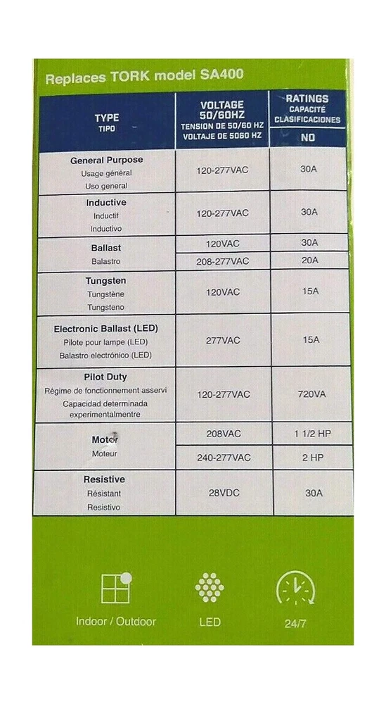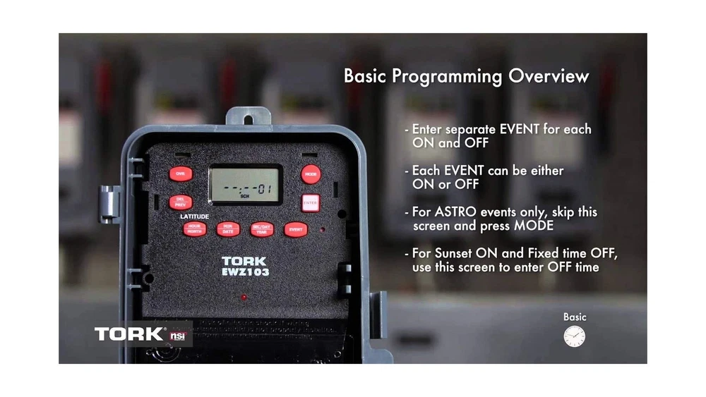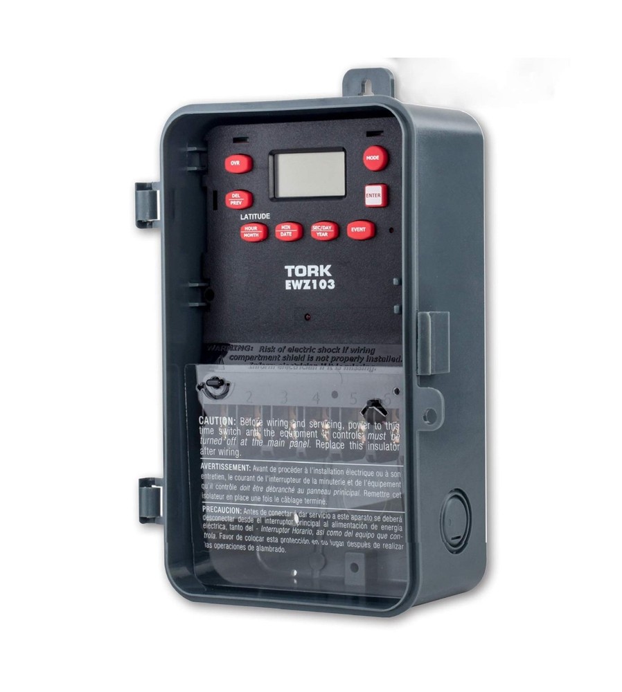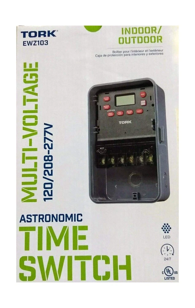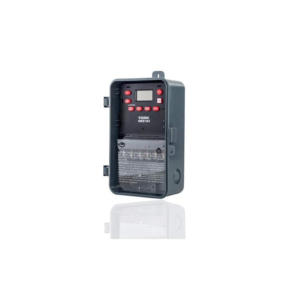 EWZ Series Multipurpose Control Astronomic 7 Day Time Switch, 120-277 VAC Input Supply, 1 Channel, DPST Output Dry Contact Description This NSi Industries EWZ103 digital time switch accepts 120-277 VAC input and its DPST output contacts can activate a 40 amp load or 2 hp motor. The switch automatically detects the input voltage and does not require manual voltage setting. This timer includes 20 pairs of on/off set points, has a minimum cycle time of one minute, and is suitable for individualized daily operation. A rechargeable super capacitor provides four days of backup power to maintain time and schedule settings. This timer can adjust for daylight saving time and leap year and compensate for sunrise and sunset variation based on Earth's latitude. The double-pole single-throw (DPST) contacts are housed within a Noryl plastic alloy enclosure that meets NEMA-3R standards for water resistance and has a lockable hasp. The enclosure is suitable for both indoor and outdoor use and mounts to an external surface. This digital timer is Underwriter Laboratories (UL) Listed and Canadian Standards Association (CSA) certified for quality assurance and is suitable for controlling lighting, heaters, and equipment motors.SpecificationsSwitch typeDigital 7-day, 24-hour timer with 20 unique set points each dayInput power supply120-277 VAC, 50/60 Hz, 6 W power consumption, automatic voltage detection, rechargeable super capacitor backupOutput contactsDPST contacts, 40 amp load rating, 2 hp motor load ratingOn/off controlOne-minute minimum on/off cycle, up to 20 cycles per 24 hoursEnclosureNEMA-3R Noryl plastic alloy enclosure with clear plastic cover, indoor/outdoor use, external surface mountTerminal wire size range8 to 16 AWG (American wire gauge)Operating temperature range-40 to +149 degrees F (-40 to +65 degrees C)Standards metUL Listed, CSA certified Automatic switches are used to turn on or off electrical devices and are activated by time, light, and motion. Time activated switches (also known as timers) operate at preset time intervals during a daily or weekly period and can be either mechanical or electronic. Mechanical timers feature a dial with multiple pins to set the on/off time intervals. Electronic timers feature an LCD display and pushbuttons to set the time intervals. Light activated switches (also known as optical or photo) operate when ambient light levels reach preset values, generally measured in foot candles. Motion-activated switches (also known as motion sensors) operate when an electronic field of a preset range is interrupted. These switches can include energy saving logic that uses combinations of time, light, and motion to operate and can include one or more device outlets or circuit contacts. Automatic switches are used to control indoor lights, outdoor lights, appliances, and small equipment motors.NSi Industries manufactures electrical components and sensors, lighting products, and energy management products. The company, founded in 1975, is headquartered in Huntersville, NC. Features: Automatic on/off control for individualized daily operation Digital 7-day, 24-hour display with 20 on/off cycles each day, one-minute minimum cycle, manual override switch Automatic compensation for daylight saving time, leap year, and sunrise and sunset variation based on Earth's latitude 120-277 VAC input voltage for multiple uses Noryl plastic alloy indoor/outdoor enclosure with locking hasp Product Details: Operation Mode: Automatic Current Rating: 4 Amps Operating Voltage: 120 Volts (AC) Contact Type: Normally Open Connector Type: Dpst Brand: NSI Switch Type: Digital Terminal: Dpst Material: Plastic Item dimensions L x W x H: 10 x 10 x 10 inches Operation Mode: Automatic Current Rating: 4 Amps Operating Voltage: 120 Volts (AC) Contact Type: Normally Open Connector Type: Dpst Switch Type: Digital Terminal: Dpst Circuit Type: 2-way Mounting Type: Wall Mount Actuator Type: Push Button Number of Positions: 20 Controller Type: Push Button Control Method: Touch Connectivity Protocol: X-10 Wattage: 6 watts Color: color Item Dimensions: 10 x 10 x 10 inches Unit Count: 1.0 Count Number of Items: 1 Material Type: Plastic Contact Material: Brass International Protection Rating: IP54 Brand Name: NSI Model: EWZ103 Global Trade Identification Number: 38 Manufacturer: NSi Industries UPC: 786261824738 Included Components: EWZ103 Delivery We Do Not Ship Outside of the Continental US. Return Policy All items qualify for returns within 30 days of receipt. Seller is responsible for return shipping on any item that is not damaged. Feedback We take our reputation seriously, we buy and sell online, so we understand the value of trust. If you are unsatisfied with your order, please contact us and we will work with you to resolve it to your satisfaction.