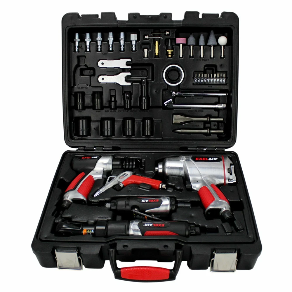 This kit has it all! Treat your air compressor with maximum torque-powered air tools and get the ultimate bang for your buck with this EXELAIR® (EX5005KIT) 50-Piece Professional Air Tool and Accessory Kit. Whether you’re looking to try out your Do-It-Yourself skills or need to tackle large industrial projects, this economical and high-performance air kit collection has what it takes to get the job done. Featured pneumatic essentials: Impact wrench (offering up to 350 ft/lbs. of power, yielding an optimal power-to-weight ratio), ratchet (160 RPM), grinder (25,000 RPM) air hammer (4,500 BPM), and blow gun. Included in this value is a range of additional handy air accessories: Impact sockets, socket extension, adaptor, M-Style® Plugs (F/M), 2 inflation needles, 5 grinding stones, chisel/point, spring retainer, 2 hand wrenches, dual air chuck, tire gauge, set of 3 blow gun nozzles, pipe threading tape,10 screwdriver bits, screwdriver bit holder/adapter, and a bottle of pneumatic oil to keep your air tools lubricated and optimized. Complete with a durable storage case. Customized with ergonomic grips and built to last, while still compact and portable enough to keep stowed away in trunks or garages in case of roadside emergencies or general auto/tire maintenance for safety. EX5005KIT PACKAGE INCLUDES: ½” Air Impact Wrench ⅜” Air Ratchet Wrench ¼” Air Die Grinder (1) 0.4” Shank Air Hammer (1) Pistol Grip Blow Gun (1) Dual Air Chuck (1) Tire Gauge (50 PSI) (5) M-Style®™ Male Plugs (1) M-Style®™ Female Plug (2) Hand Wrenches (1) Chisel (1) Point (1) Spring Retainer (5) Grinding Stones (2) Sport Inflation Needles (6) ½” Drive SAE Impact Sockets (1) 3” x 1/2” Socket Extension (1) ⅜” to ½” Socket Adaptor (1) Tapered Blow Gun Nozzle (1) Safety Blow Gun Nozzle (1) Rubber Blow Gun Nozzle (1) Bottle of Pneumatic Lubricating Oil (1) Roll of Pipe Threading Tape (10) Screwdriver Bits (1) Screwdriver Bit Holder (1) Screwdriver Bit Adapter PRODUCT SPECIFICATIONS: Impact Wrench: 350 ft. lbs. Max Torque; 6 CFM; 5.4 lbs. Weight. Air Ratchet Wrench: 60 ft. lbs. Max Torque; 4 CFM; 160 RPM Max Load Speed. Blow Gun: 8 CFM Air Consumption. 90 PSI. - Die Grinder: 25,000 RPM Max Load Speed. 4 CFM. ¼” Collet. Air Hammer: 4,500 BPM; 6 CFM. M-Style® Plugs: 1/4" NPT threads, most common standard size. ½” Drive SAE Impact Sockets: (7/16”, ½”, 9/16”, 11/16”, ⅞”, 1”) USE: For Automotive, Industrial, Home Garage, Pro Shop, and DIY pneumatic projects and maintenance. WARRANTY: 3-Year Limited on Tools This is an authentic Milton® product shipped new in packaging (NIB). Many of our products are manufactured and shipped directly from our corporate headquarters in Chicago, IL 60639, United States. For the past 70 years, Milton® has been the product of choice when it comes to pneumatic accessories. We have invented numerous industry standard products, including the classic M STYLE® “I/M” KWIK-CHANGE® Coupler and Plug, Window Inflator Gauge, Safety Blow Guns, and the iconic Driveway Signal chimes and bell. With these inventions, our portfolio has grown to over 1400 different SKU’s. These products cover a broad range of applications in various industries, such as automotive, fleet maintenance, construction, and manufacturing. To this day, Milton® continues to be the industry leader in high quality pneumatic accessories and fittings, proudly living up to our heritage of superior products and reliability.