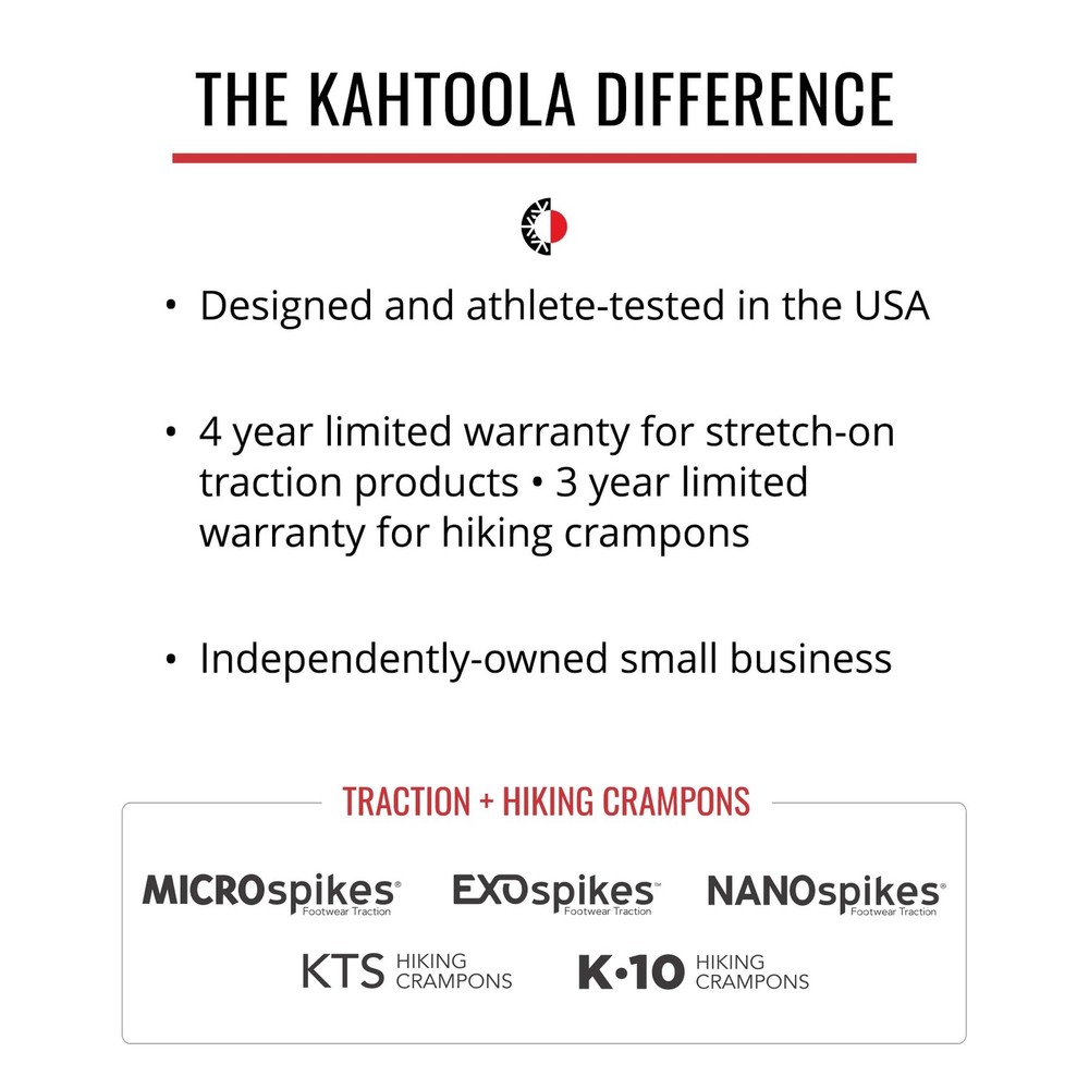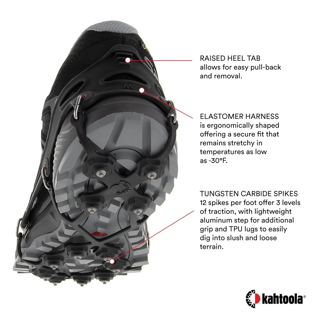 EXOspikes footwear traction sets a new standard for versatile winter traction that delivers true cross-terrain performance for trail runners and hikers. Designed to take a beating, EXOspikes introduces an industry-first TPU Traction Matrix that is more lightweight and abrasion resistant than steel and enables users to take on a mix of terrain and conditions—including frozen mountain trails, icy roads, and everything in between. EXOspikes combine more than decades of winter traction technology and experience, and embody the high performance, reliability, and safety outdoor enthusiasts expect from . BEST FOR: Winter hiking, backpacking, and trail-running. EXOspikes footwear traction are designed to be lightweight and abrasion resistant, enabling users to take on a mix of terrain and conditions—including frozen mountain trails, icy roads, and everything in between on your backcountry winter adventures! Ideal for hiking shoes and boots and to be used on mountain trails. SPIKE DESIGN: 12 spikes per foot deliver three levels of optimal traction. Tungsten carbide tips bite into icy terrain, aluminum steps grip uneven surfaces, while the TPU lugs dig into loose terrain. ADDITIONAL FEATURES: Industry-first TPU Traction Matrix is extremely durable and more abrasion resistant than steel. Open design quickly sheds snow and adapts to a wide range of flexible footwear. ELASTOMER HARNESS & REINFORCED EYELETS: Using a patented eyelet design, tough TPU inserts reinforce key points, allowing the elastomer harness to be strong yet lightweight. Constructed from a durable TPE for a secure fit that remains stretchy in cold temperatures, down to -22°F (-30°C). : Est. in 1999 is on a mission to build exceptional products that make the outdoors more accessible and rewarding. Please see sizing chart in product images. 4-year manufacturer . Shoes not included. All traction devices are manufactured in Taiwan.