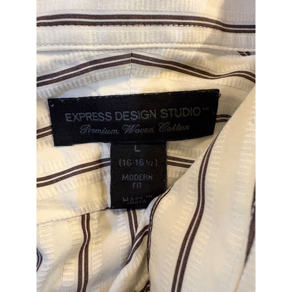 EXPRESS DESIGN STUDIO Modern Fit dress shirt in premium woven cotton. Features a classic vertical stripe pattern in white and brown with a crisp collar and button-front closure. Long sleeves with button cuffs complete this versatile shirt, perfect for business casual settings or smart evening wear. Department: Men Neck Size: 16.5 in Fit: Modern Fit Sleeve Length: Long Sleeve Pattern: Striped Type: Dress Shirt Collar Style: Point Material: Cotton Blend Top Cuff Style: Barrel Cuff Theme: Designer Features: Easy Care Neckline: Collared Keywords: Express Men, Striped Shirt, Button Up, Collared Shirt, Long Sleeve, Office Wear, Business Casual, Smart Casual, Classic Fit, Woven Cotton, Premium Fabric, Everyday Style
