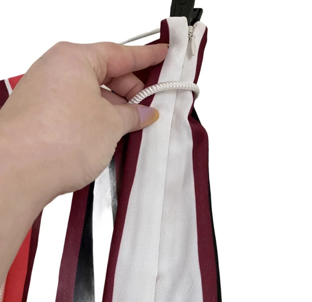 Pretty colored Express striped mini skirt with belt loops, lining & removable drawstring. You can use another belt of your choice. NWT Side zipper closure Coral - pink, burgundy, black, white Measurements: Waist: 31” Flat lay waist 15.5” Length: 20”