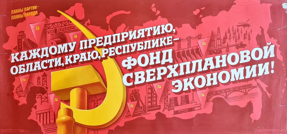 - Origianl slogan on the poster: КАЖДОМУ ПРЕДПРИЯТИЮ, ОБЛАСТИ, КРАЮ, РЕУСПУБЛИКЕ - ФОНД СВЕРХПЛАНОВОЙ ЭКОНОМИИ! Literally English translation of the main slogan: FOR EVERY ENTERPRISE, REGION, TERRITORY, REPUBLIC - THE FUND OF THE EXTRA-PLANNED ECONOMY! border-spacing POSTER ARTIST: KOGANOVSKIY I. SUBJECT: ECONOMY, INDUSTRY PRINT YEAR: 1985 LANGUAGE: RUSSIAN PRINT RUN: 80.000 SIZE: 23" x 47" = CM: 59 x 120 PUBLISHED BY: "PLAKAT", MOSCOW CONDITION: ROLLED, NEAR TO GOOD - - - Listing and template services provided by inkFrog