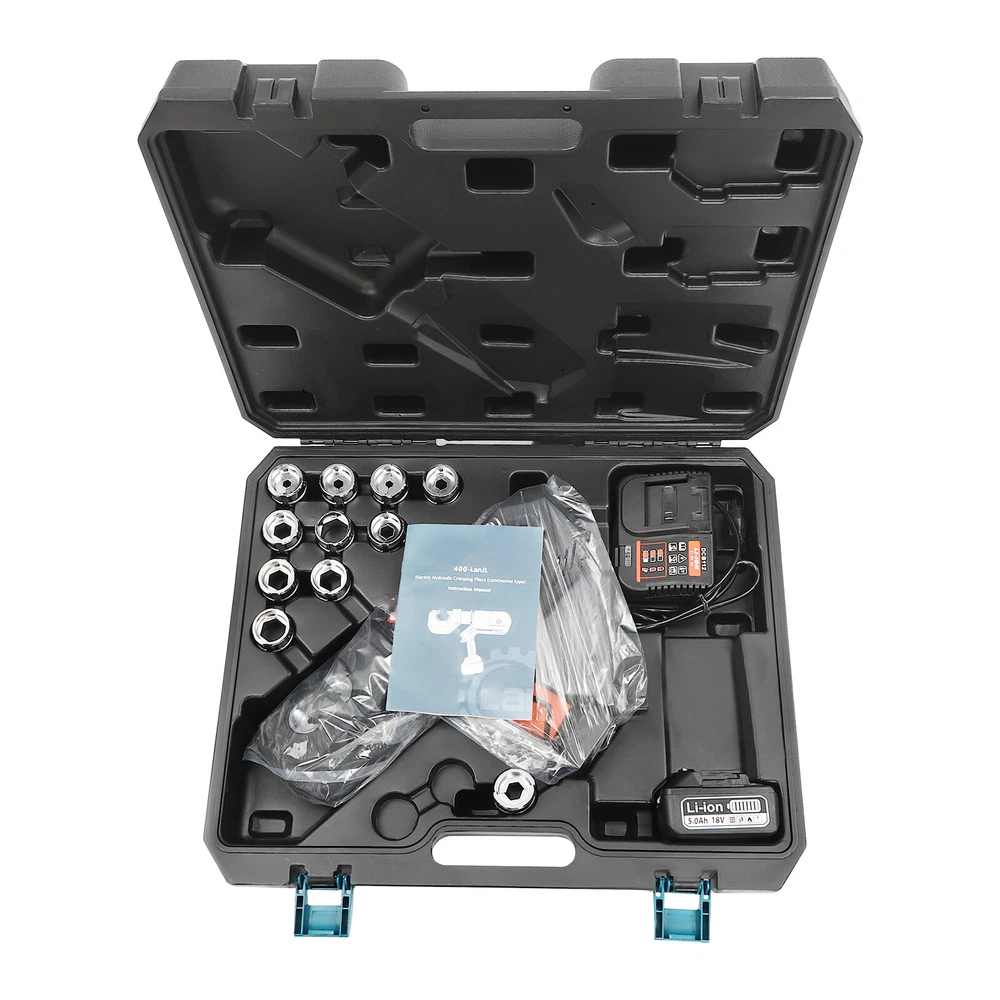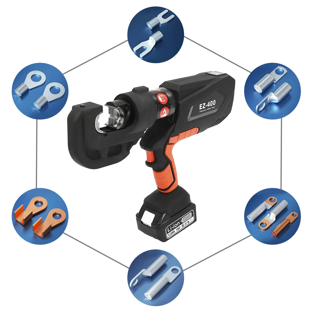 Specification Model: EZ-400 Material: 40Cr Steel, Q235 Steel, Plastic Process: Forging, Finishing, Injection Molding Color: Black, Red Style: Modern Motor Type: Pure Copper Motor Plug Type: US Standard Assembly Required: Yes Number of Battery: 1 Output Power: 400W Voltage: 110V Battery Capacity: 4.0Ah 18V Charger: 21.5V 2A Charging Time: 1.5-2h Continuous Use Time: 1.5h Maximum Output Force: 150KN Working Stroke: 42mm/ 1.65in Crimping Range: 400mm² (Copper Terminal), 300mm²(Aluminum Terminal) Die Size: 16, 25, 35, 50, 70, 95, 120, 150, 185, 240, 300, 400mm² Package Included 1* Electric Hydraulic Pliers 1* Lithium Battery 1* Battery Charger 12* Dies 1* Toolbox 1* English Manual EZ-400 Rechargeable Cable Electric Hydraulic Pliers Crimping Tool Set 18V 400mm² Description Our electric hydraulic plier is made of high-quality materials and is sturdy and durable. Its 360° rotatable head can be adapted to different working environments, the OLED display allows you to easily observe the number of crimps, remaining power, and temperature, and the 12 different die sizes allow for a wider range of crimps. In addition, the ergonomic handle is comfortable to grip and easy to operate with one hand. Our product is sure to be the ideal choice for your crimping job! Key Features Good Material: This product is made of 40Cr steel, Q235 steel, and engineering plastic, with the forging, finishing, and injection molding processes, which makes the product strong and durable, high hardness, anti-impact, anti-corrosion, and anti-rust. Humanized Design: The ergonomic handle is easy to grip without slipping and can effectively reduce hand fatigue caused by long hours of work. The 360° swivel design and LED light make your operation more flexible and can help you work well in different situations. OLED Screen: It can display the number of crimps, remaining power, and real-time temperature, which is convenient for you to operate, and also prevents the machine from burning out due to high temperature. Save Time and Effort: Compared with manual hydraulic pliers, our electric one can be controlled by only one button, and it can be automatically reset when crimping is completed, which saves both time and effort. Continuous Work: The 4.0Ah lithium-ion battery can provide longer battery life without frequent charging and worrying about insufficient electricity that affects your work. The equipped charger can help recharge the two batteries to save money and energy. Good Compatibility: The provided 12 different sizes of crimping dies(16, 25, 35, 50, 70, 95, 120, 150, 185, 240, 300, and 400mm²) can help you process different sizes of metal materials, making the product more widely used. Convenient to Carry: Equipped with a toolbox that can hold this product and its accessories, it is convenient for you to carry it to different work sites. Easy Assembly: You just need to install the suitable die on it and then install the battery and you can start using it, which is very easy. Details Pure Copper Motor: It provides strong power for the product, accelerates crimping speed, improves efficiency, and prolongs service life. Battery Lock: It secures the battery to the bottom of the product, preventing it from falling off during use and making it easy to remove the battery. Heat Dissipation Holes: They can ensure that the product can dissipate heat quickly and timely, avoiding the motor burning out due to the high temperature when working. Application It is suitable for electric power repair, construction work, copper terminal crimping, and aluminum terminal crimping. Specification Model: EZ-400 Material: 40Cr Steel, Q235 Steel, Plastic Process: Forging, Finishing, Injection Molding Color: Black, Red Style: Modern Motor Type: Pure Copper Motor Plug Type: US Standard Assembly Required: Yes Number of Battery: 1 Output Power: 400W Voltage: 110V Battery Capacity: 4.0Ah 18V Charger: 21.5V 2A Charging Time: 1.5-2h Continuous Use Time: 1.5h Maximum Output Force: 150KN Working Stroke: 42mm/ 1.65in Crimping Range: 400mm² (Copper Terminal), 300mm²(Aluminum Terminal) Die Size: 16, 25, 35, 50, 70, 95, 120, 150, 185, 240, 300, 400mm² Gross Weight: 15kg/ 33.07 lbs Package Size: 60*50*14 cm/ 23.62*19.69*5.51in Product Size: 44*8*32 cm/ 17.32*3.15*12.6 in Package Included 1* Electric Hydraulic Pliers 1* Lithium Battery 1* Battery Charger 12* Dies 1* Toolbox 1* English Manual Notes Please read the operating manual completely before use. And pay particular attention to the safety instructions included. The fully charged time is approximately 1.5-2H, and it is recommended not to charge for too long to avoid battery capacity loss. It is strictly prohibited to crimp without a crimping die to avoid damage to the clamp head. Please allow the slight color difference caused by the shooting light and the 1-3 cm error due to manual measurement, and make sure you do not mind before ordering. Payment Delivery details Terms of sales About us Contact us Payment We accept ebay payment 。 Fees such as import duties, taxes are not included in the item price or shipping costs. These charges are the buyer's responsibility. Delivery details Shipping: 2-9 working days to: USA Terms of sales We maintain high standards of excellence and strive for hundred percent customer satisfaction. Feedback is very important to us. We hope that you contact us immediately before you give neutral or negative feedback, so that we can address your concerns. It is impossible to address issues if we do not know about them! About us Your satis faction is our ultimate goal. We work hard to earn your trust and future business. Our certified technicians have tested each item before shipping. The unit comes with 1 year limited warranty on all manufacturing defects. a) If you receive a defective item, you may return it or ask for a discount. Please contact us within 14 days after you receive the package. b) What you returned must be intact and in its original packaging as re? u. Custom