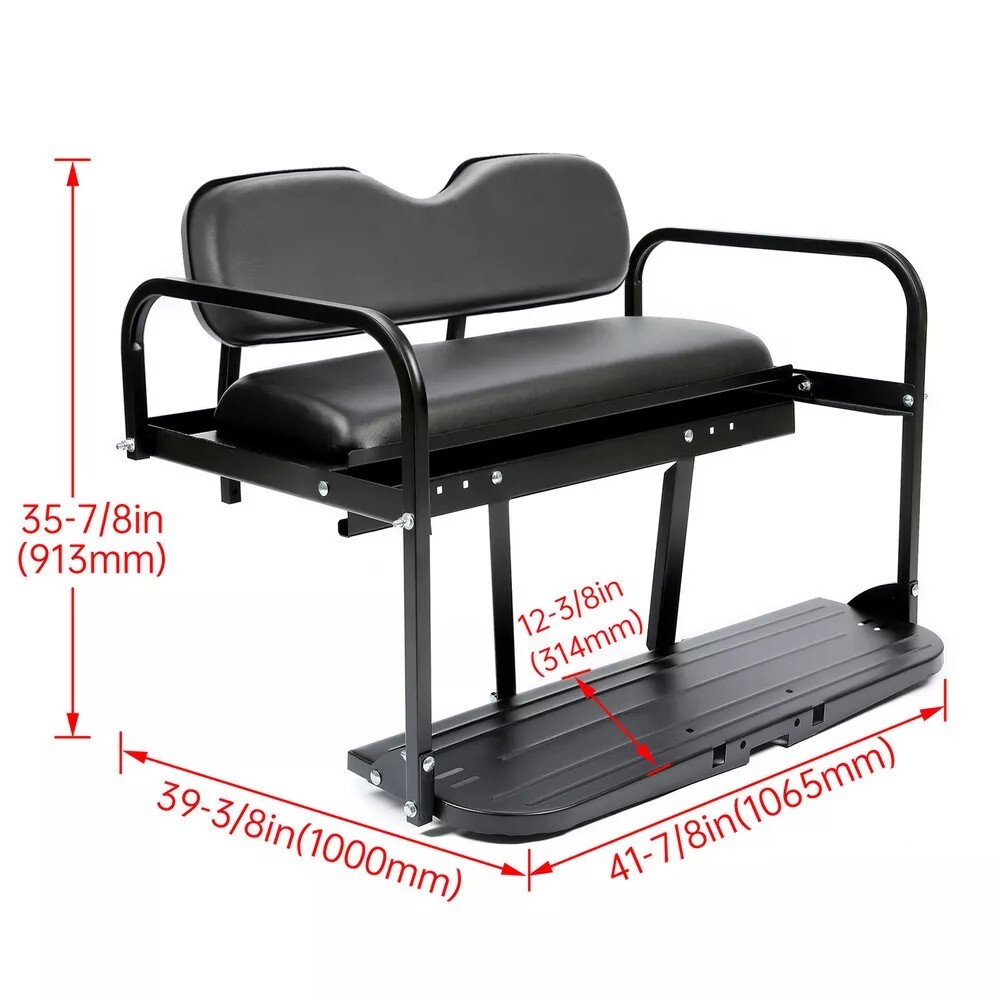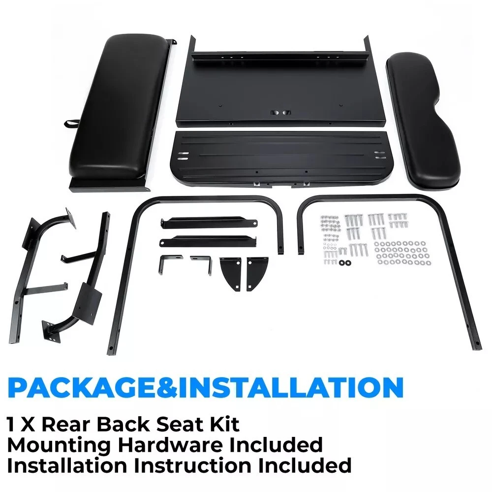 Specification: Condition: 100% Brand New Color:Black Material: Steel Frame+Synthetic Leather Seat Surface Finish:Powder Coated Installation Method: Screw Mounting Hardware Included: Yes Installation Instruction Included:Yes Size: L 41-7/8 (in) * W 39-3/8 (in) * H 36 (in) Features: HIGH PERFORMANCE: The unique design of the rear seat kit makes it have excellent safety and functionality. Made of high-quality materials, the frame is covered by powder coating so that it is not easy to rust, strong and durable yet lightweight. FOLDING: The rear back seat kit can accommodate two adults, and can also hinge down to form a flat bed for hauling cargo. It features a steel frame construction for strength and durability, and faux leather cushions for comfort and easy maintenance. Package Includes: 1 X Rear Back Seat Kit Mounting Hardware Included Installation Instruction Included