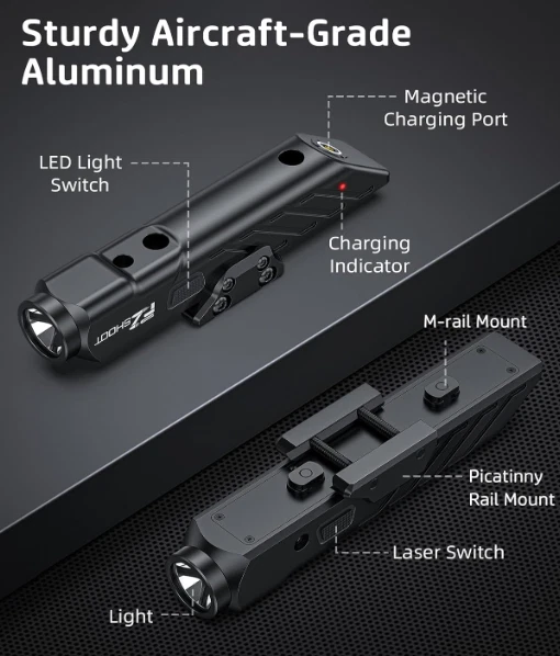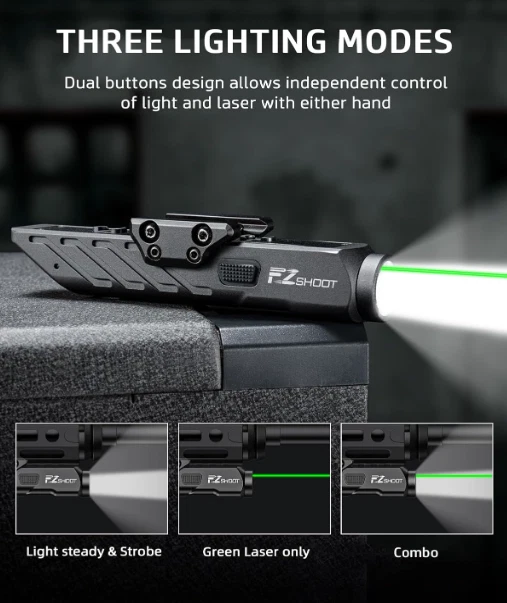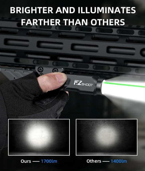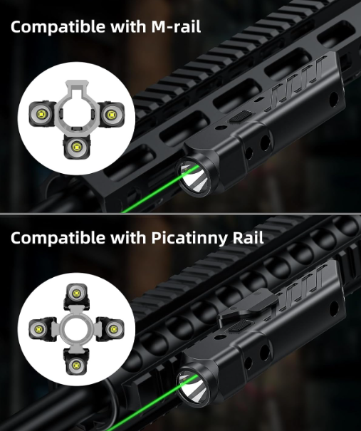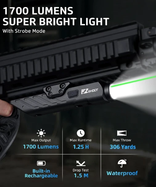 Get Fast! Free Fast 1-7 Day Delivery! [Powerful light] EZshoot Rifle light laser combo has 1700 lumens super bright light with a throw of 280m. The green laser output is <5mW, the laser class is IIIA. The laser beam reaches 200m during the day and 2000m at night. [Magnetic Rechargeable] EZshoot rifle light built-in magnetic rechargeable function, which can be fully charged in 1.5 hours. The Magnetic charging is more economical and green than the traditional baterry, saves lots of battery replacement costs. The working time is about 1.2h for flashlight only; 1h for flashlight and laser; 20hrs for laser only. [Better compatibility and stability] EZshoot laser light combo is compatible with both Picatinny and M-rail. The New version of rail mount is equipped with 2 precision metal screws to enhance the stability, effectively resist recoil and avoid falling.. [Multiple Lighting Modes] EZshoot ar laser light combo is equiped with two ambidextrous buttons for independent control with LED and Green Laser by either hand. Easily switch between Steady light, Strobe light, GL beam only, Steady lights & GL, Strobe light & GL. [Solid Structure] This Picatinny flashlight is cast from high-strength aircraft aluminum and Type III hard anodized coating. The flashlight laser combo passed the 1.5m drop test, which is more sturdy and keeps zero better than plastic gun lights. [Comfortable Hold] Featuring a low-profile and compact design, the rifle flashlight laser combo only rises 0.9 inches above the the rail surface and doesn't block your sight. This rifle laser light combo adopts ergonomic design and anti-slip groove design, giving you a better holding feel. [Stable Performance] No superfluous and fancy features, its superior stability ensures that it can play its due role in the face of accidents. This ar flashlight is great for home defense, farm defense, night hunting, security guard, etc.