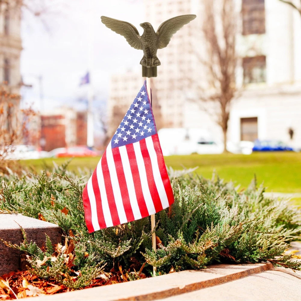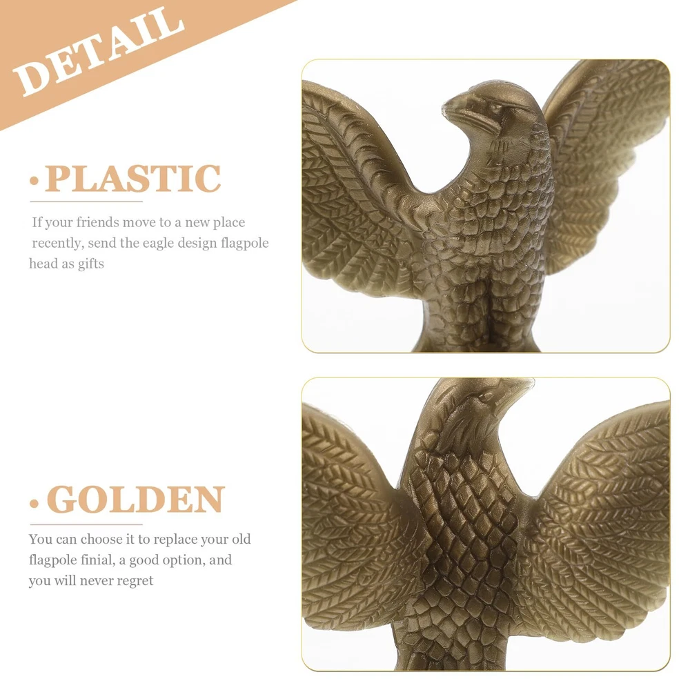 Description It will do not rust, not easy to . You can use the flagpole top ornament to replace your old or broken ones. The flagpole top ornament design is unique and creative, adding a good decoration for your outdoor garden. Choose it and you will not regret. Features -Color:Golden -Material:Plastic -Size: 4.32X2.55X0.75in Package Including 2 x Flag Pole Finial Ornament The is also flexible, the classic eagle shape perfectly replaces the ball headgear. The unique and creative eagle design of the flagpole top ornament make it look elegant and beautiful, eye-catching. If your friends move to a new place recently, send the eagle design flagpole head as . You can choose it to replace your old flagpole finial, a good option, and you will never regret. They are enough, not easily deformed or broken, and .