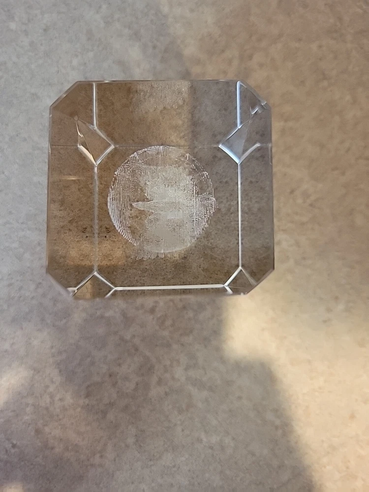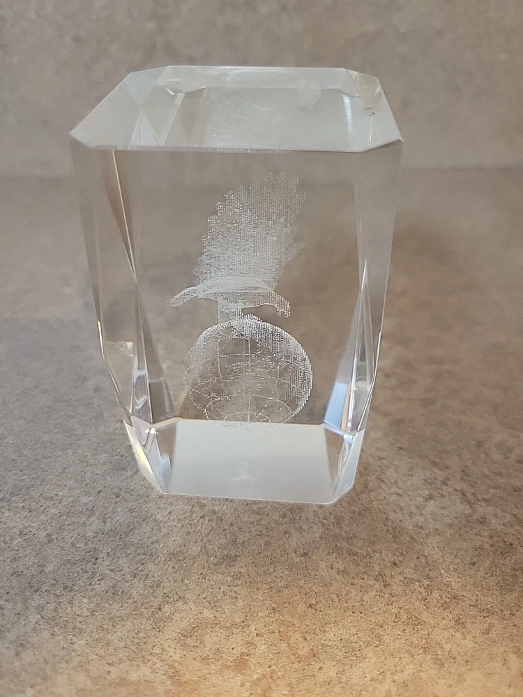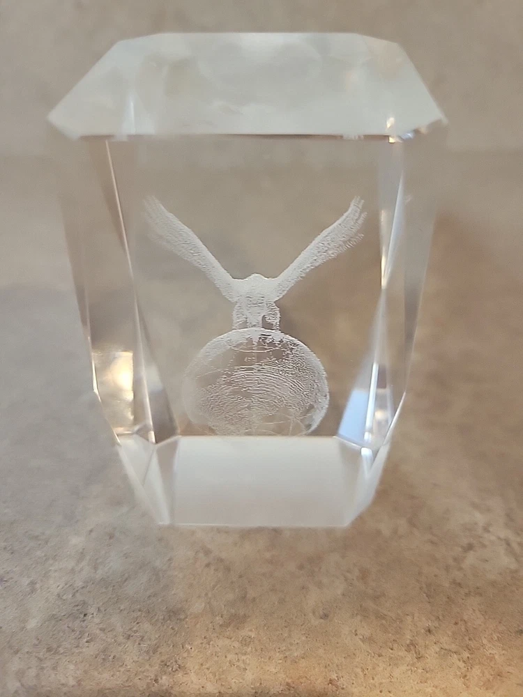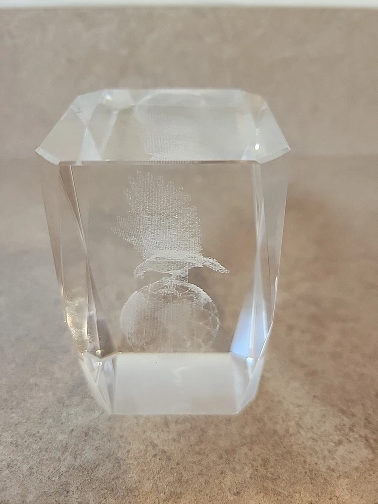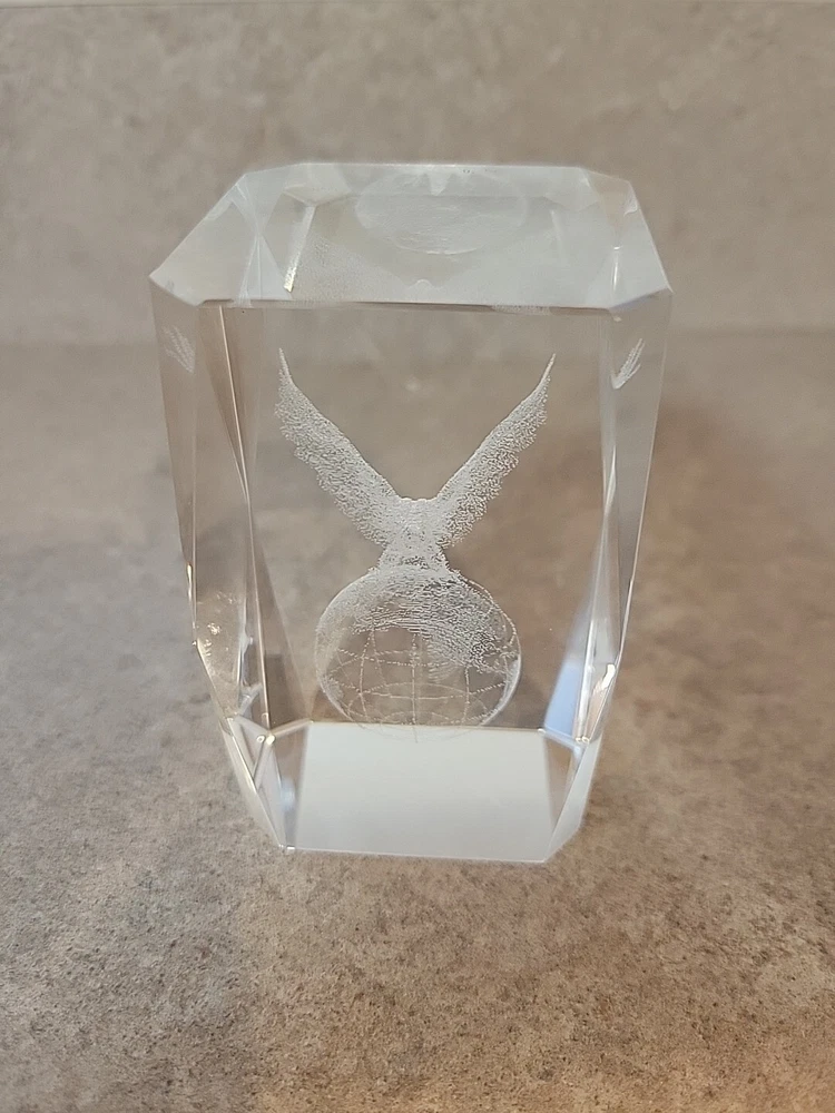 Add a touch of patriotic flair to your desk with this Eagle on Globe Glass Paperweight. Featuring a 3D laser-etched hologram effect, this clear glass paperweight showcases a detailed image of an eagle perched on a globe, making it a unique and eye-catching addition to your collection. Crafted from high-quality glass, this paperweight is both durable and elegant, making it the perfect gift for any collector or office worker. With its intricate design and hologram effect, this paperweight is sure to impress anyone who sees it.