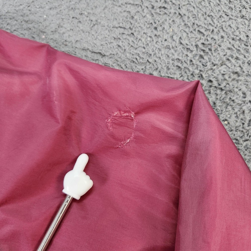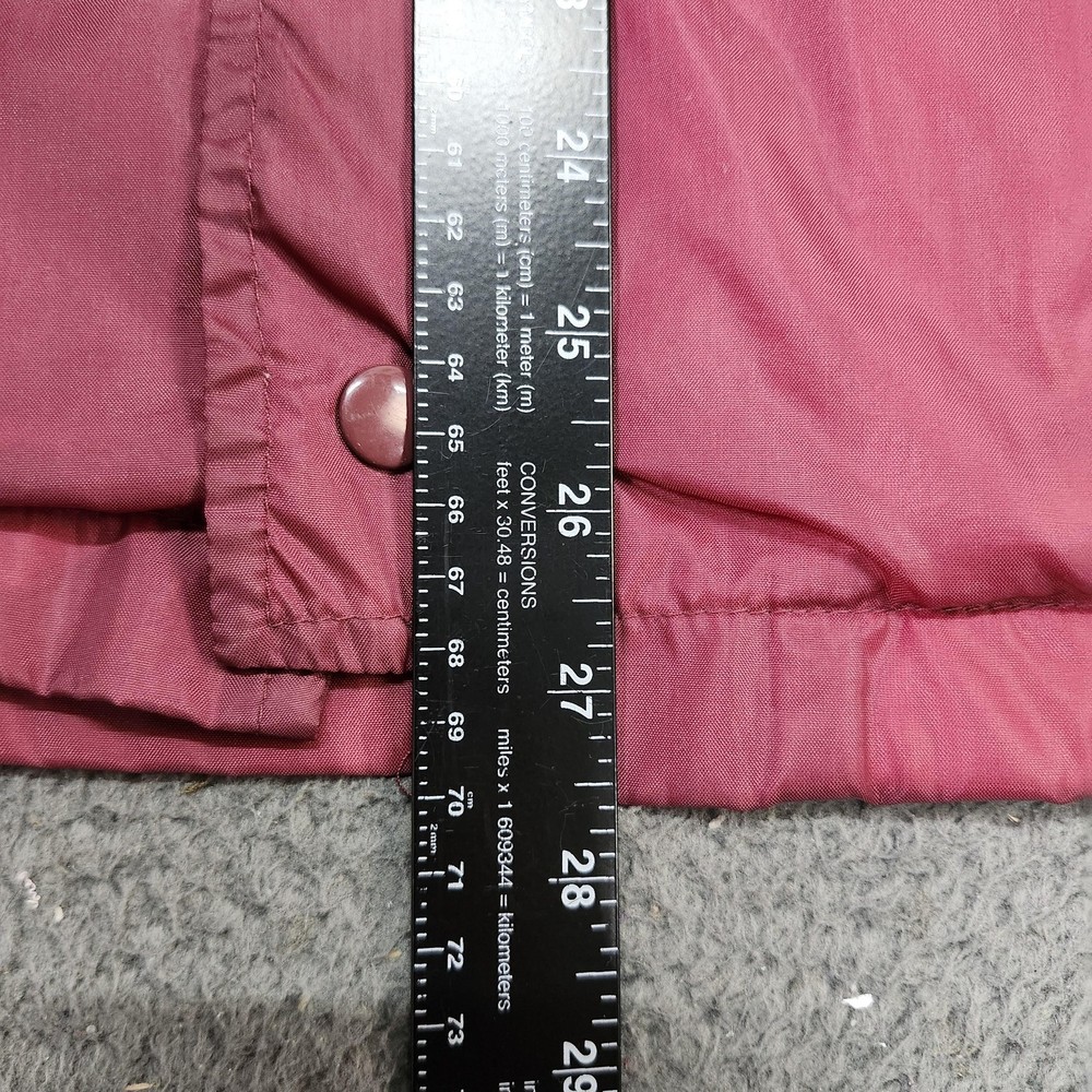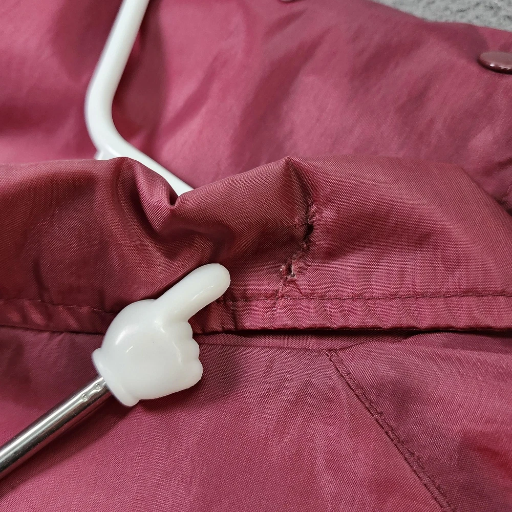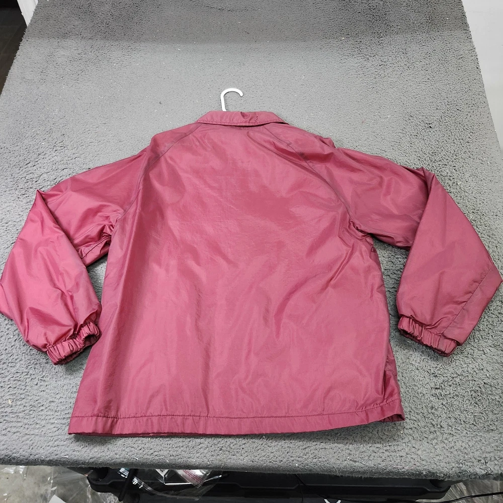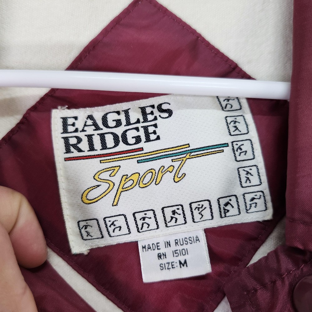Brand: Eagles Ridge (Sport line). Style: Mens lightweight windbreaker jacket with snap-front closure and classic collared neckline. Color: Solid red / burgundy tone. Size: Mens Medium (size M on interior neck tag). Material: Nylon shell with soft light-colored lining; exact fiber content tag not visible in photos. Country of origin: Made in Russia (interior tag marked Made in Russia RN 15101). Design details: Point collar, front snap placket with matching snaps, elastic cuffs, straight hem with slight elastic, and two slanted front hand pockets. Branding and accents: Eagles Ridge Sport woven neck label with multicolor stripe graphic, sport icon border, and secondary size/country tag at the neckline. Features and use: Lined, lightweight snap-front windbreaker suitable for casual everyday wear, layering in transitional seasons, and light outdoor activities.