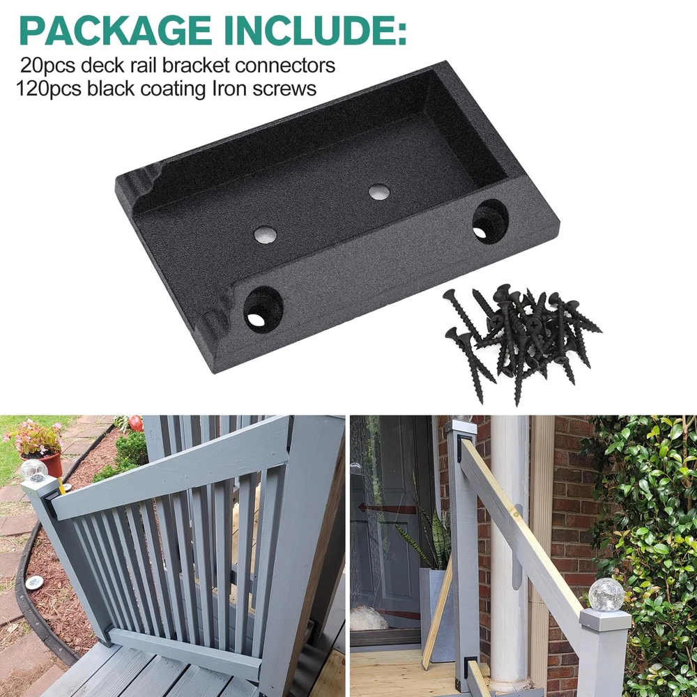 20pcs Deck Railing Brackets Connectors for 2x4 Railing Wood Post with 120pcs Wood Screws Pre-drilled Nylon Material -- Made of high quality nylon that will never corrode or break. Thickness up to 3cm, railing connectors create a strong and effective support to the deck rail 90 Degree Railing Connector makes attaching 2" X 4"(true measurement of 1-3/8" x 3-3/8") or 2" X 6" (true measurement of 1-1/2" x 5-3/8")railings to posts quick and easy. Makes for a super easy install of railings, even stair railings Package Included -- 20 pcs deck rail bracket connectors,120pcs black coating Iron screws Note -- The material of these connectors are nylon, so take care in screwing them in. When you use the square drive bit, please set your driver to the lowest torque. Do that, and you'll be fine If you find that there are not enough parts,just contact us through amazon message system, we will send you the parts as oon as possible