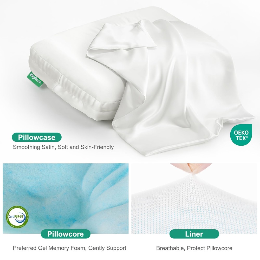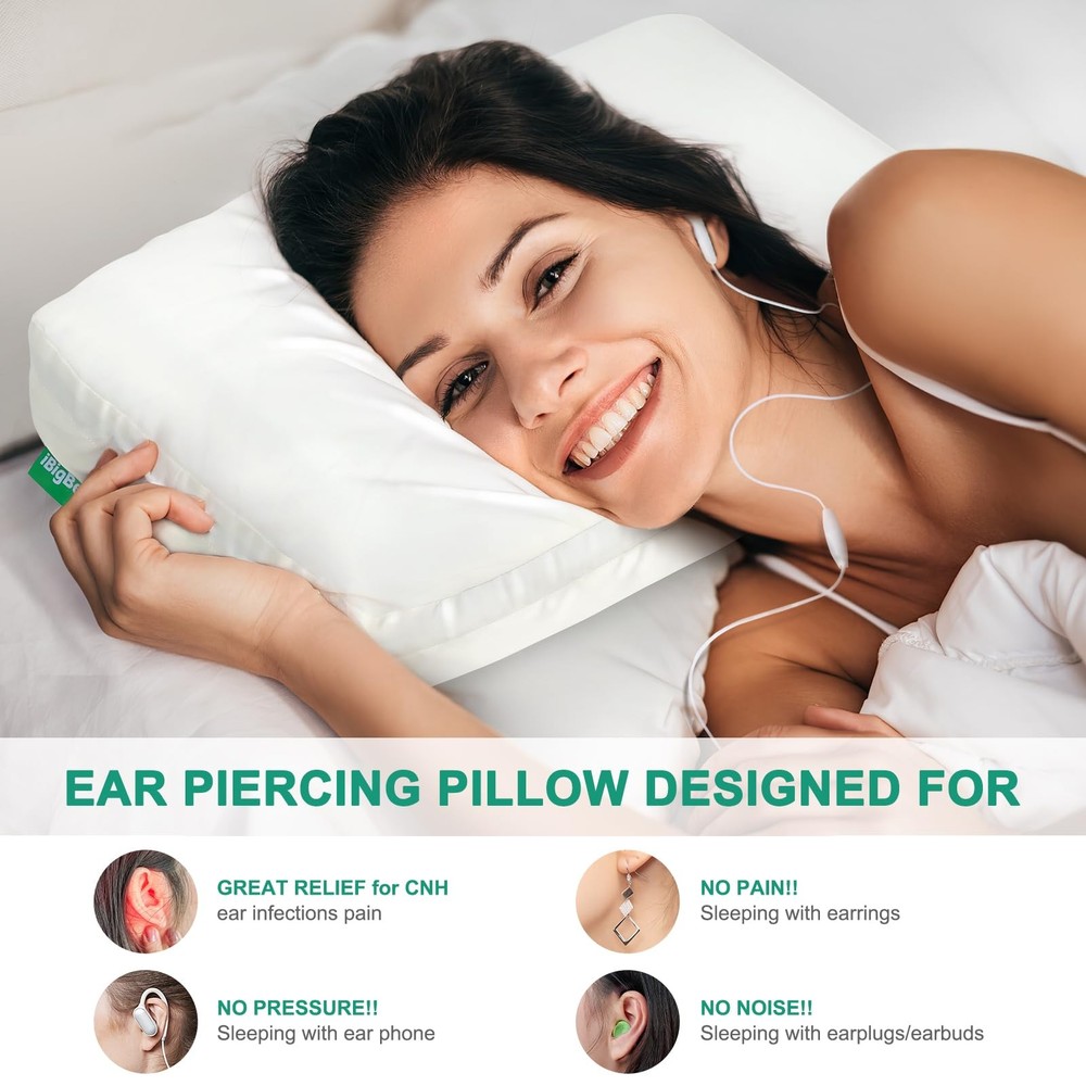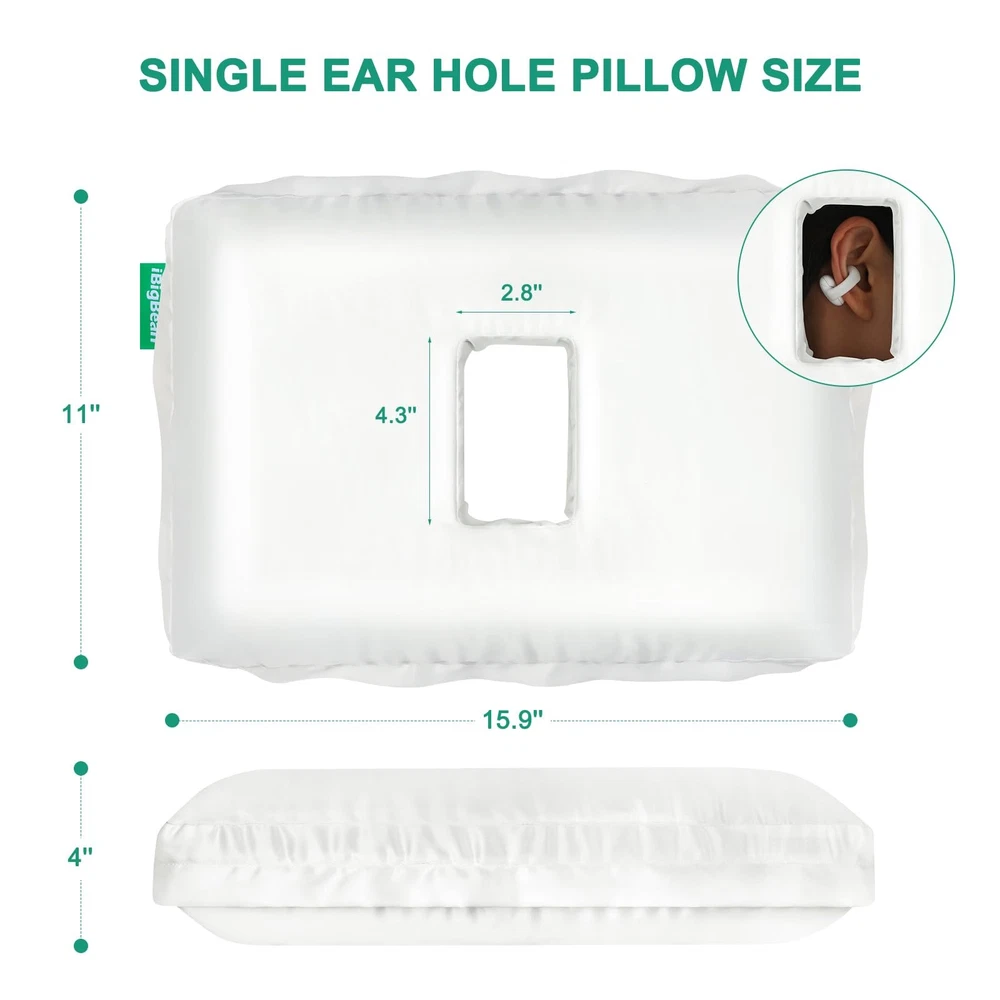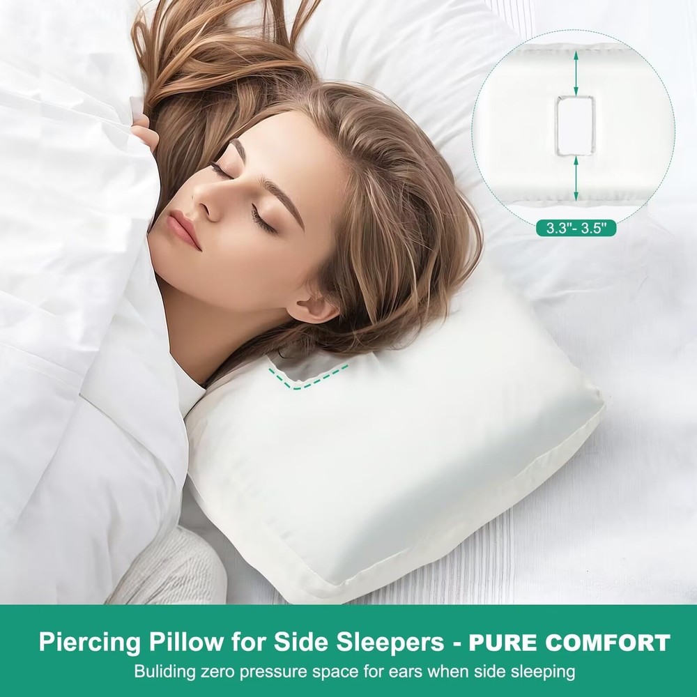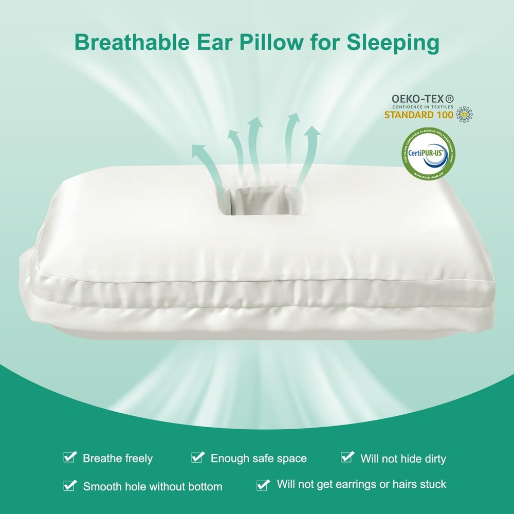 ORIGINAL INTENTION OF DESIGNING THE EAR PILLOW - Give ears safe zero-pressure space, saying goodbye to any pain caused by squeezing the ear during sleep. Let you sleep comfortably without ear pains. ORIGINAL INTENTION OF DESIGNING THE EAR PILLOW - Give ears safe zero-pressure space, saying goodbye to any pain caused by squeezing the ear during sleep. Let you sleep comfortably without ear pains. MEDICAL CARE EAR PAIN PILLOW FOR COMFORT SLEEP - When you are ear-piercing or injured, this piercing pillow is very helpful for ear pain relief during sleeping. When you are used to wearing earplugs or headphones to sleep, far away from noise or your partner snoring, this pillow with ear hole is a special surprise for you, giving you quiet sleep or falling asleep to music without any ear pains. COMFORTABLE MATERIAL - The soft smooth texture satin pillowcase & gel memory foam pillow core, supply comfortable support and keep your skin and hair cozy during a night's sleep. Make you sleep soundly & cool all night. BREATHABLE SINGLE EAR HOLE PILLOW - 15.9''L x 11''W x 4''H with breathable broad ear hole(4.3''x2.8'') without bottom, which can completely protect your ear from being squeezed when sleeping on the side, and will not get earrings and hairs stuck or hide dirty. You'll wake up without ear troubles every morning. PIERCING PILLOW FOR SIDE SLEEPERS - People who like to sleep on their side for a long time, choose this ear pressure relief pillow, soothing ear pressure, and giving them a more comfortable side sleeping.
