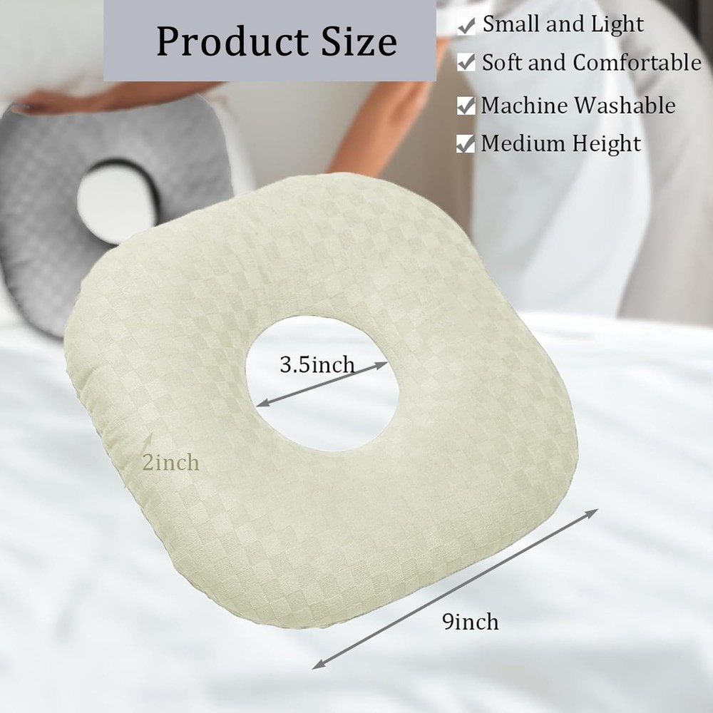 About this item PERFECT SIZE: The piercing pillow measures 9" the hole in the middle is a 3.5" circle. The hole in the middle of the pillow fits your ear perfectly, giving your painful ear a place to rest without the pain of pressure and rubbing. And this height is also suitable, you can use it alone or put it on other pillows, so you can find your comfort zone. SOFT AND COMFORTABLE: Our perforated pillows are made of 100% cotton breathable fabric and down and polyester mixed filling, down filling is better than regular cotton, reusable, you can machine wash and dry normally. ADJUSTABLE: The perforated pillow has an invisible zipper. Take some padding out of the pillow when it feels too hard, or add some padding when it feels too soft. EAR PAIN RELIEF: The pillow with a hole is helpful to reduce ear pressure while side sleeping, relieving ear pain, ear inflammation and pressure sores. APPLICABLE PEOPLE: Our pillow is great for anyone with multiple ear piercings, chondrodermatitis nodularis helicis new piercing, earrings/hearing amplifier/noise cancelling earbuds/headphones/earache/pain/tinnitus/vertigo. Great for piercing comfort. Fresh cartilage piercings pillows can eliminate the pain! Suits for those who had ear surgery work great for heals from surgery. Perfect for the piercing addict and a side sleeper. Suits for those who used to fall asleep is with earplugs.