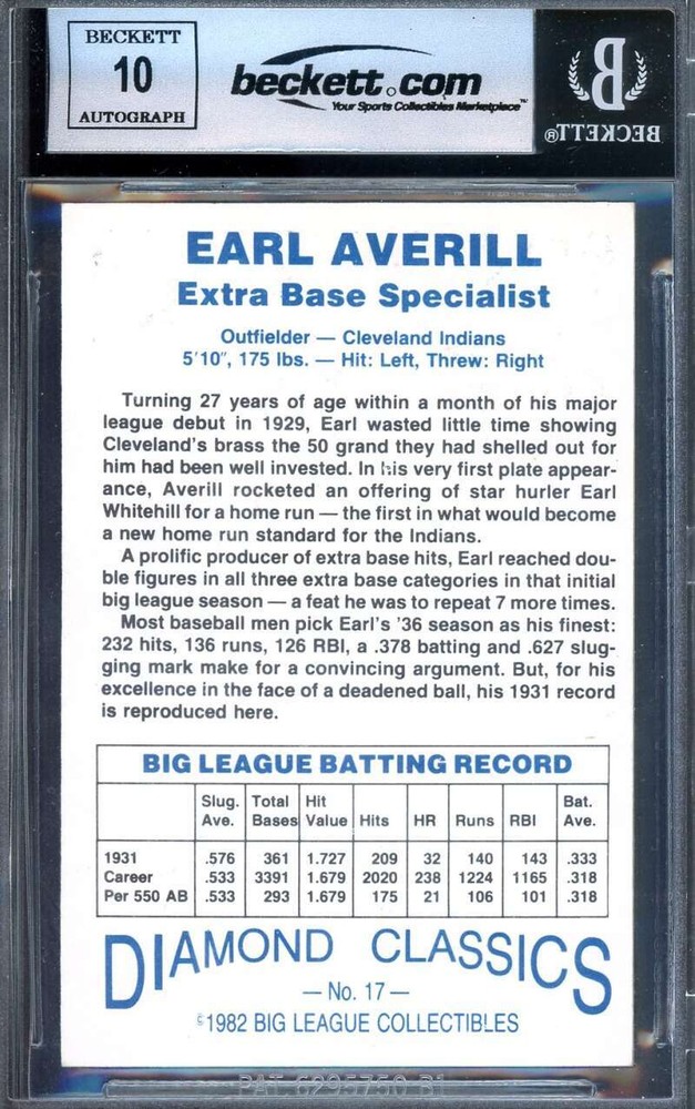 Earl Averill Gem Mint 10 Beckett BAS Signed 1982-83 Diamond Classics Autograph PHOTO: DESCRIPTION: FULLY CERTED BECKETT SLABBED AUTHENTIC SIGNED SPORTSCARD FROM THE INTERNETS #1 SELLER OF AUTHENTIC SIGNATURES SHIPPING & PAYMENT: thanks for looking. All items are mailed within 24 hrs of payment , most within a few hours.We combine shipping so if you have more than one item request total when done.We combine shipping at about .50 extra a piece to point then free.Feel free to ask . International shipping rates have gone up this year, we will ship at the cost we pay.Most will be between 6-12.00 for like slabbed cards to a baseball. Feel free to email any questions about items or to talk collectibles, thanks always!!!! This listing created with GLETech Multiple Selling Channel tools.