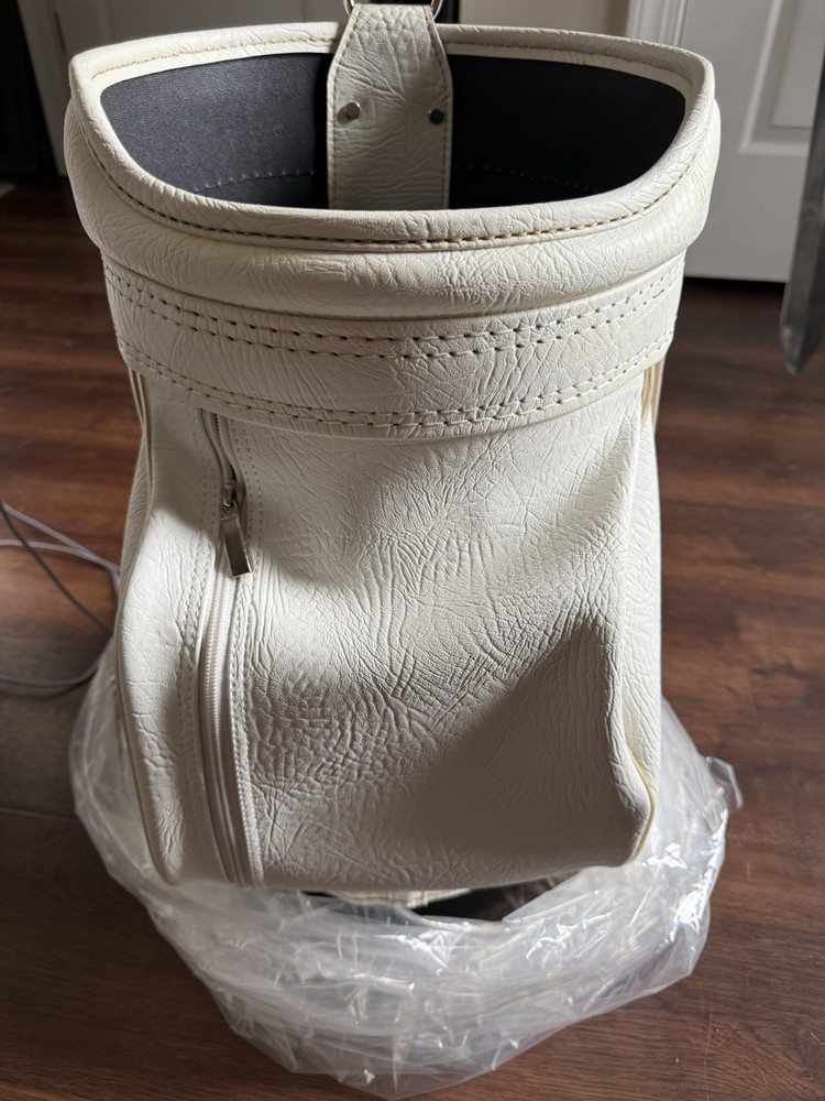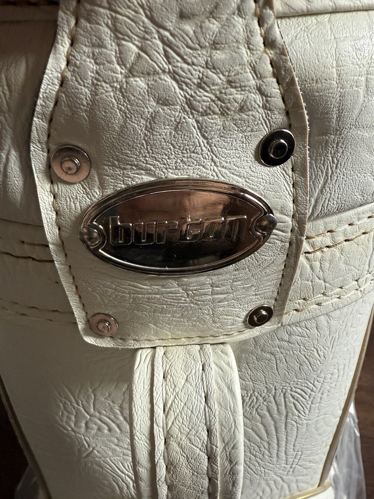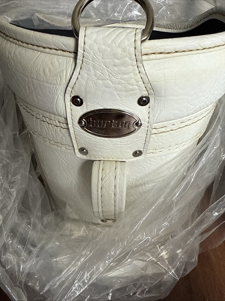 The Early 2000 New Leather Burton Den Caddy is a vintage men's carry bag made by the brand Burton. It features a white leather exterior with a zip closure and two pockets. Made in China, this unique piece combines classic design with high-quality materials, making it a stylish and functional choice for any golfer looking for a timeless accessory.