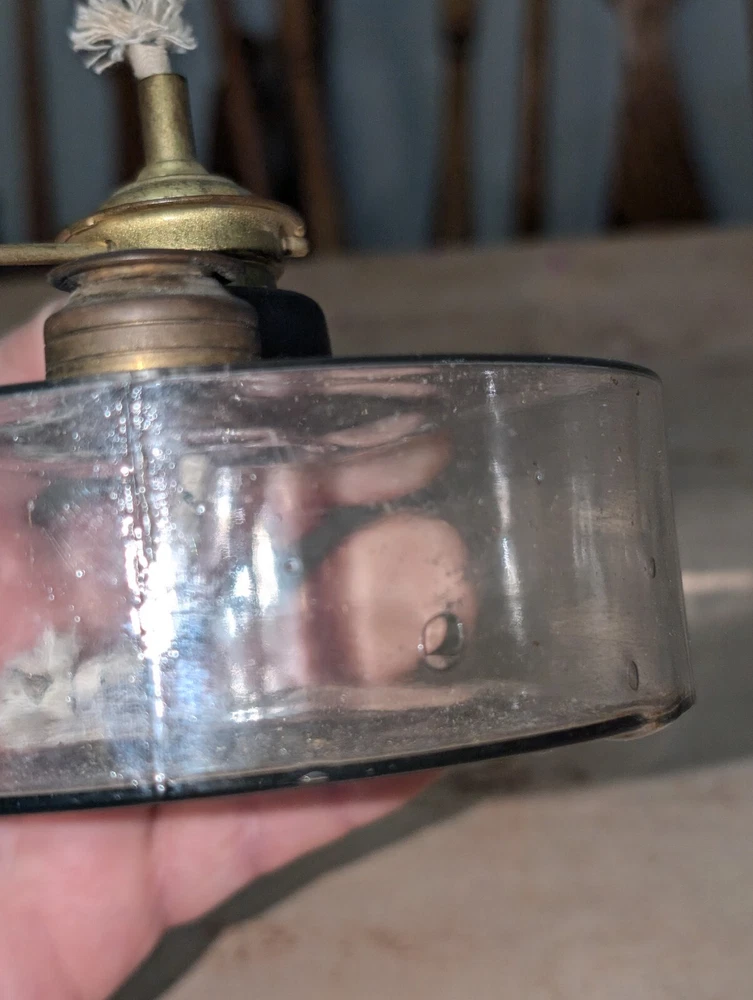 Two nice early glass mold Blown lamp bases. Have molded feet on the bottom. Great Air bubbles or seeds throughout. Got the nice primitive early glass look. One has brass burner. One is regular metal. Both have brass fuel caps. All in good condition and parts moving work as they should. Please make sure to follow my store by clicking the heart button. We add great items daily. To combine shipping, use the cart function and you should be able to combine at checkout. Otherwise message before paying and I can add reduced shipping on an invoice on items that can be combined into one package