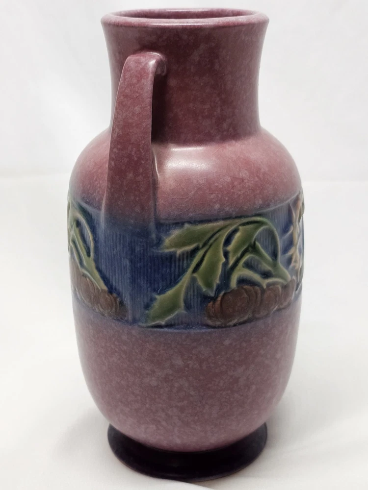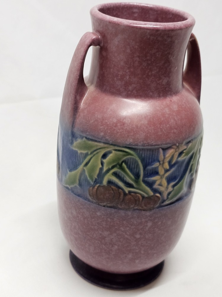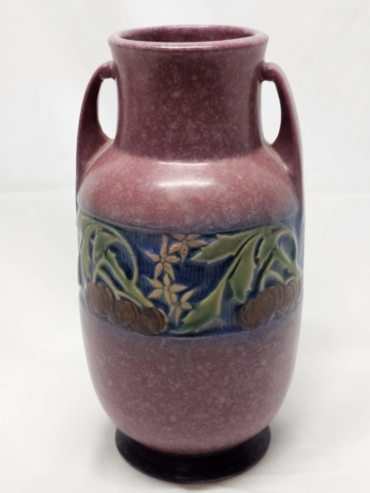 A beautifully rounded 9" Baneda vase, showcasing raised banded fruit and floral detail. Unmarked, but a clear spot where the foil label once was confirms its authenticity. A prized form for collectors.