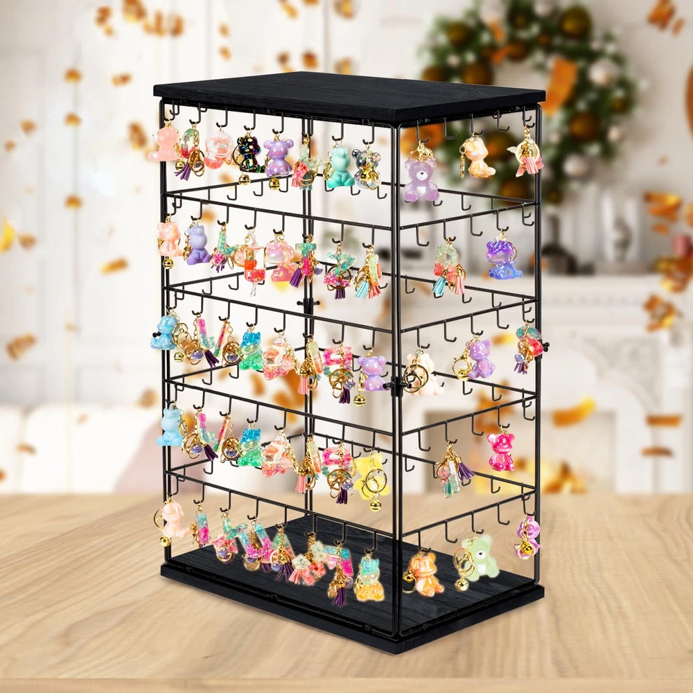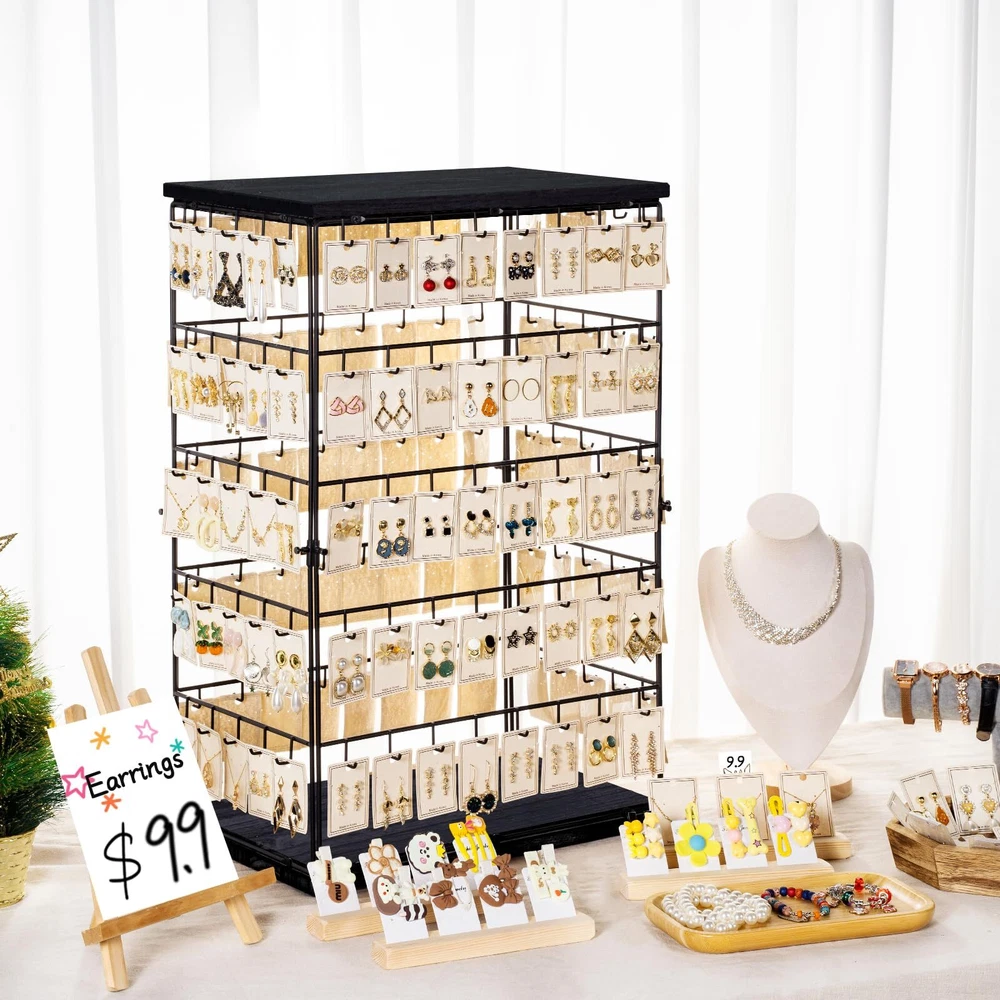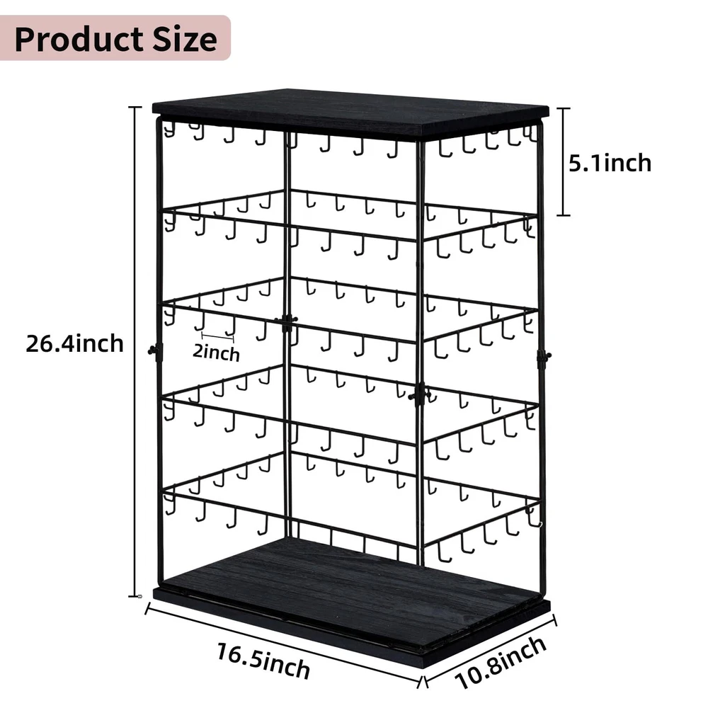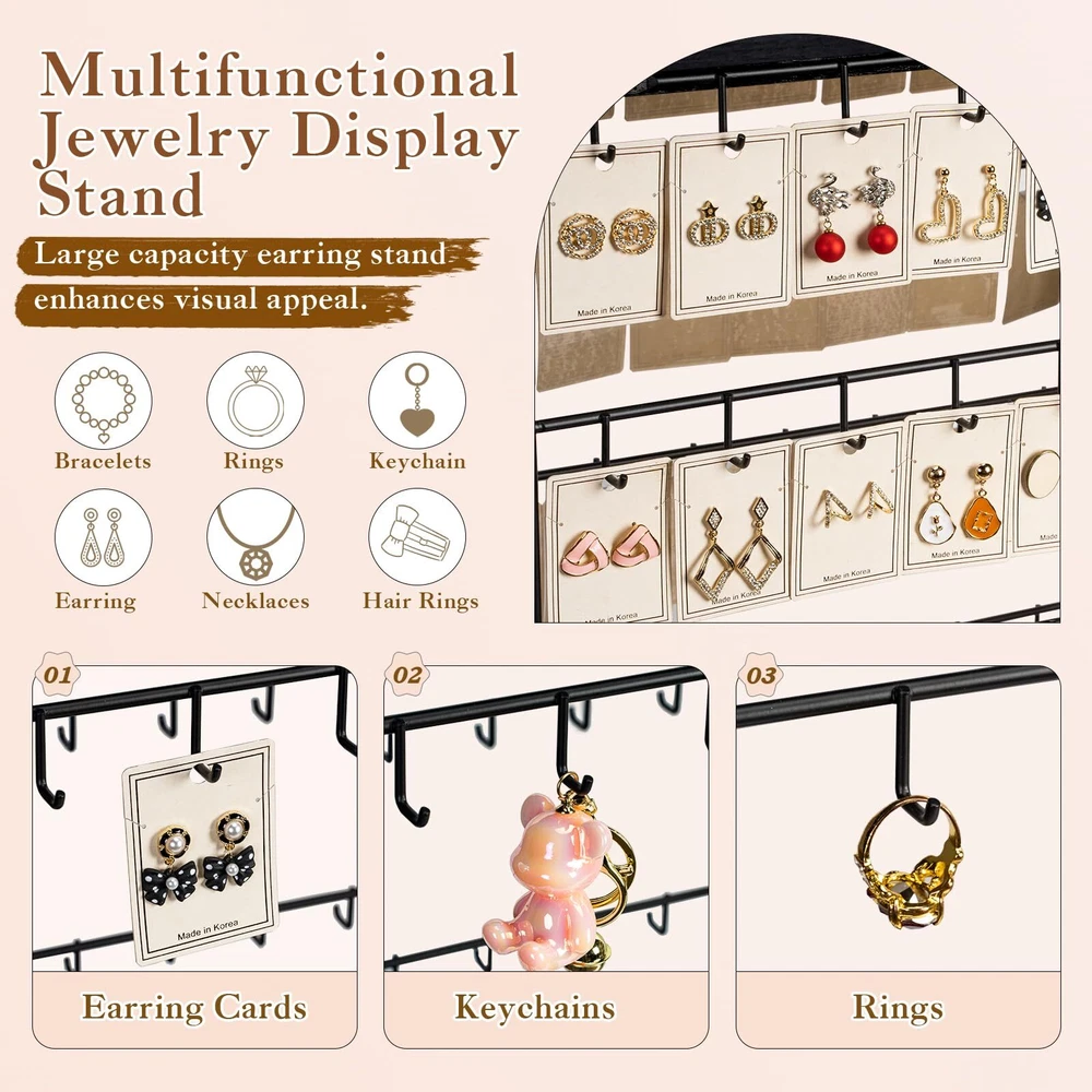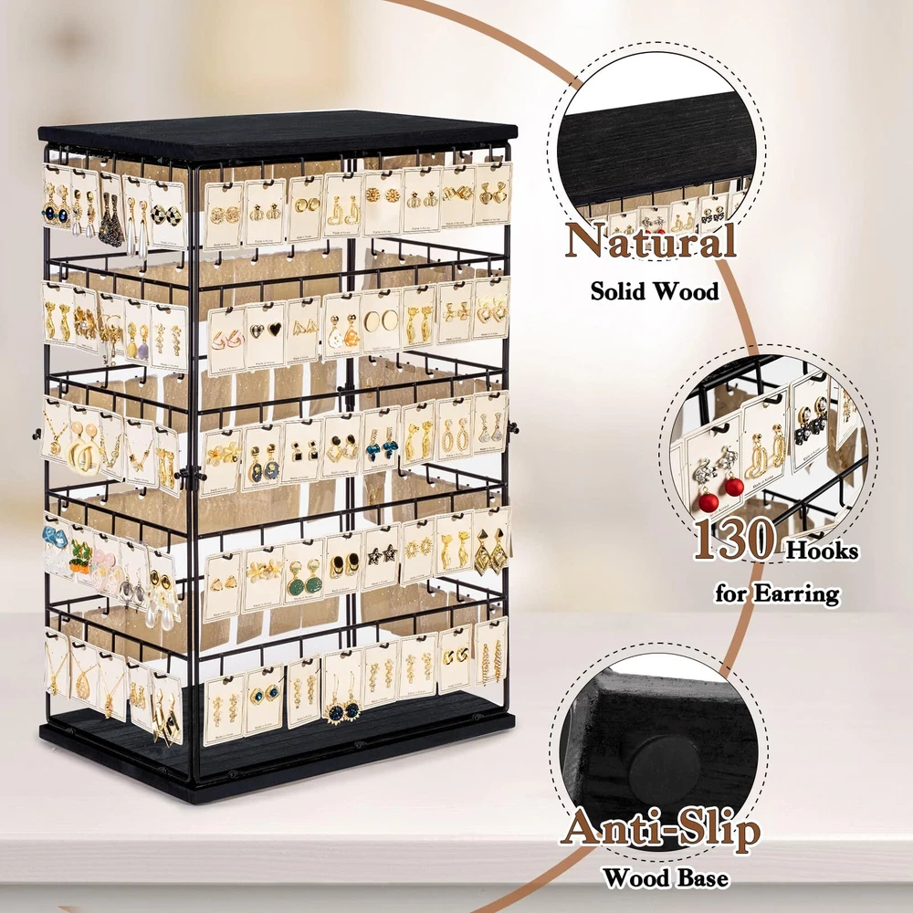 ✨Jewelry Display Stand for Vendors: This jewelry earring display for selling has 5-tier and 130 hooks, which can display up more earrings and earring cards. Display your earrings in four sides, increasing display opportunities. ✨Large Capacity Size: 16.5"W x 10.8"D x 26.4"H. Widened and thickened tower design provides excellent visibility and makes your store or boutique an awesome focal point. Our jewelry display stand are perfect for showcasing your beautiful jewelry and attracting your customers' attention. ✨Attractive and Sturdy: This earring holder is made out of solid wood and strong metal. The sturdy metal structure and padded bottom ensure stability while protecting surfaces from scratches, the combination of rustic look and black finish look aesthetically pleasing. ✨Easy to Install: It's so easy to put this earring storage organizer together, all you need to do is just screw the 4 metal parts between the 2 wood parts, then you are done with your installation and can start displaying all your jewelry or keychains right away. ✨Jewelry Display and Storage: Earring organizer allows you to display and store your earring, bracelets, and necklaces or any kind of jewelry pieces nicely, you will be able to appreciate your favorite jewelry at a glance and easy to pick which piece of jewelry you want to wear for the day. All of your jewelry is well organized, visible and not getting tangle up any more.