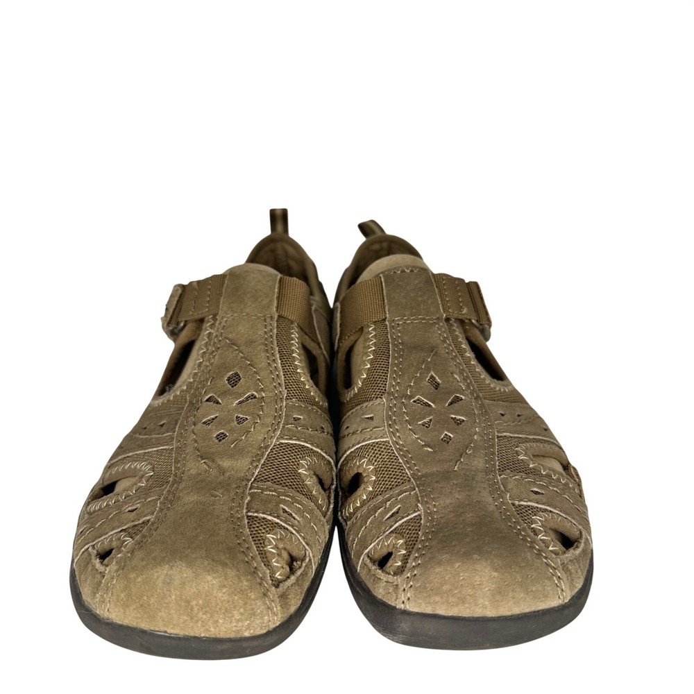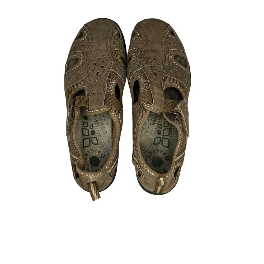 Outsole Material: Rubber Department: Women Theme: Outdoor Accents: Logo, Embroidered Brand: Earth Origins Type: Sandal Occasion: Casual, Activewear, Travel Season: Summer, Spring, Fall Color: Brown Shoe Width: M Features: Adjustable Strap, Breathable, Comfort, Cushioned Customized: No Closure: Hook & Loop Heel Style: Flat Insole Material: Fabric Style: Fisherman US Shoe Size: 7.5 Model: Taye Pattern: Solid Heel Height: Flat (Under 1 in) Lining Material: Fabric Vintage: No Upper Material: Leather Country of Origin: China