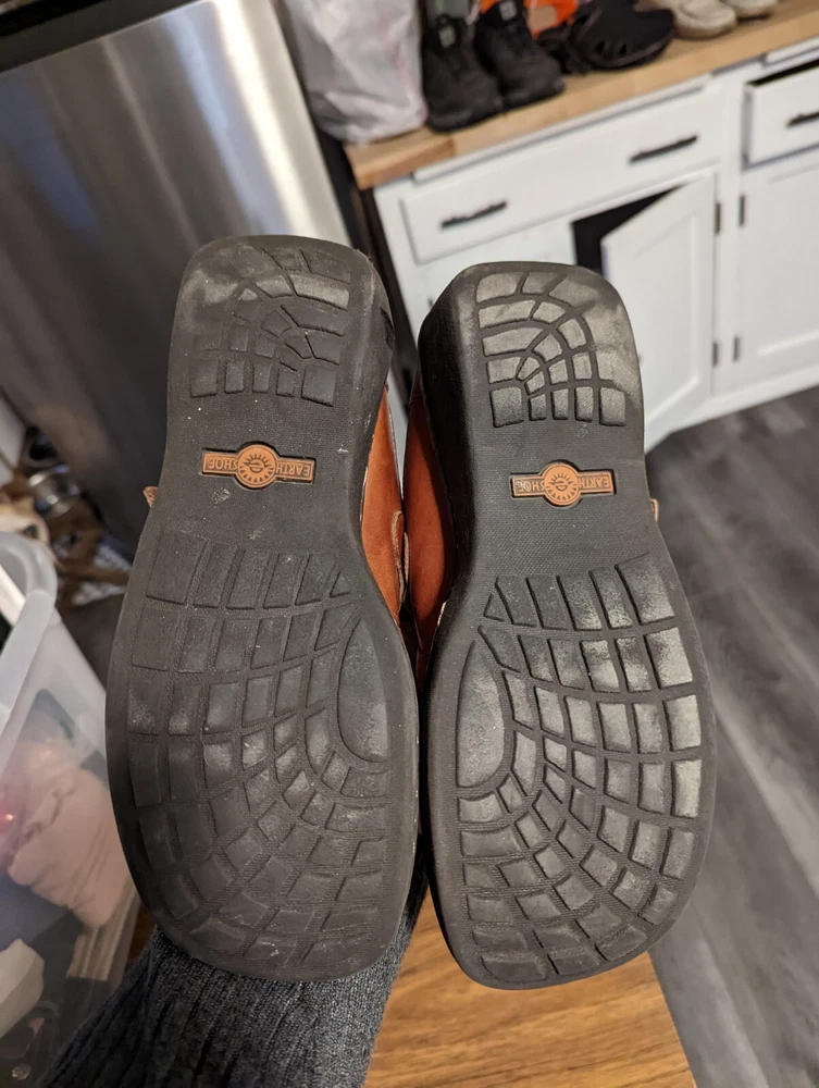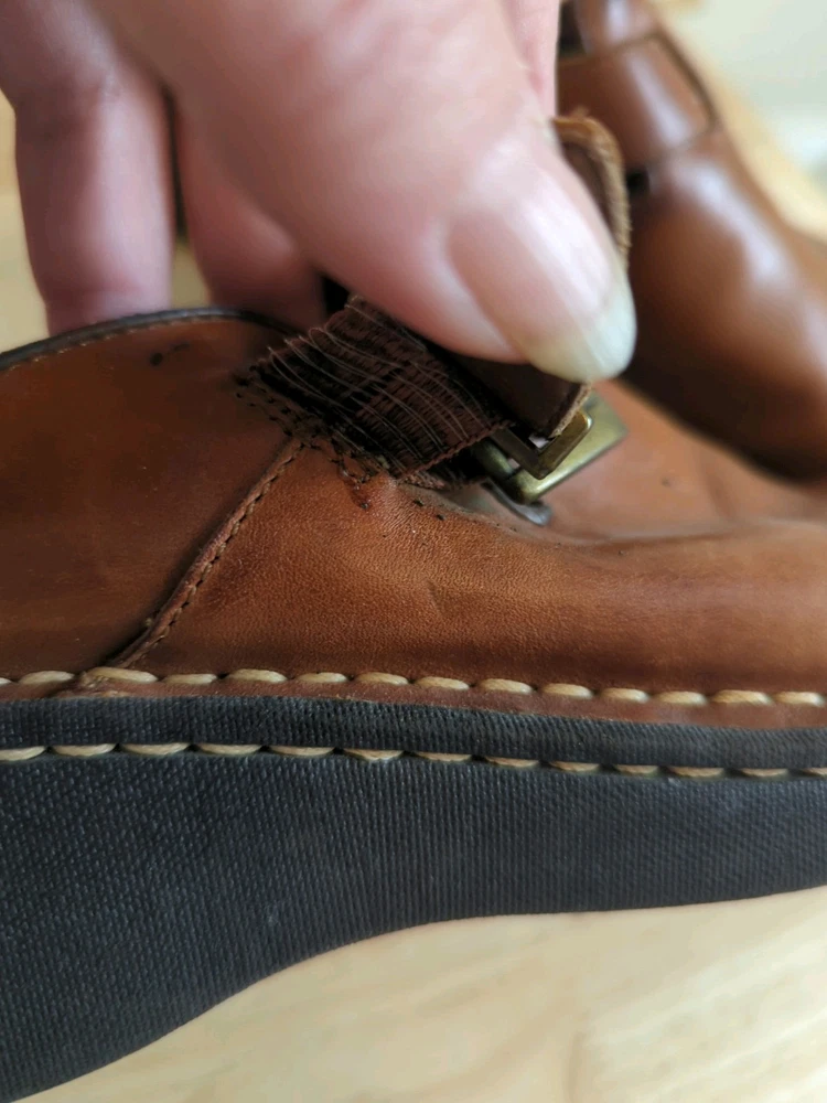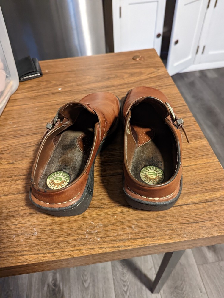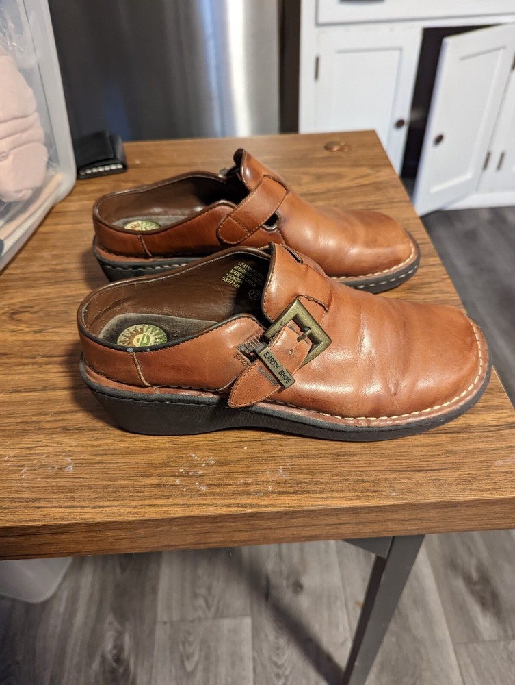The elastic on one buckle is cracking on one shoe. Slit in heel shown in pics. Step into comfort and style with these Earth Shoe Hickory clog mules. Crafted from high-quality leather, these shoes feature a buckle accent and a square toe design. The low wedge heel provides a comfortable fit, while the cushioned insole and leather lining ensure all-day wearability. These brown clogs have a retro hippie vibe that's perfect for any casual occasion. The standard shoe width and US size 7.5 make them a great addition to any wardrobe. Whether you're going for a bohemian look or simply want to add some comfort to your day, these Earth Shoe Hickory clogs are the perfect choice.
