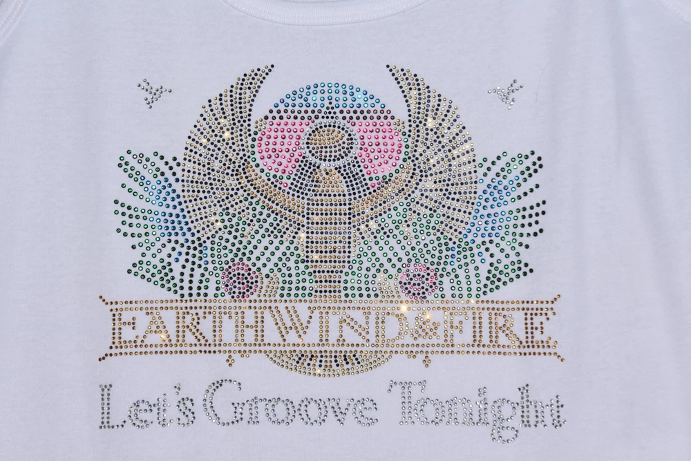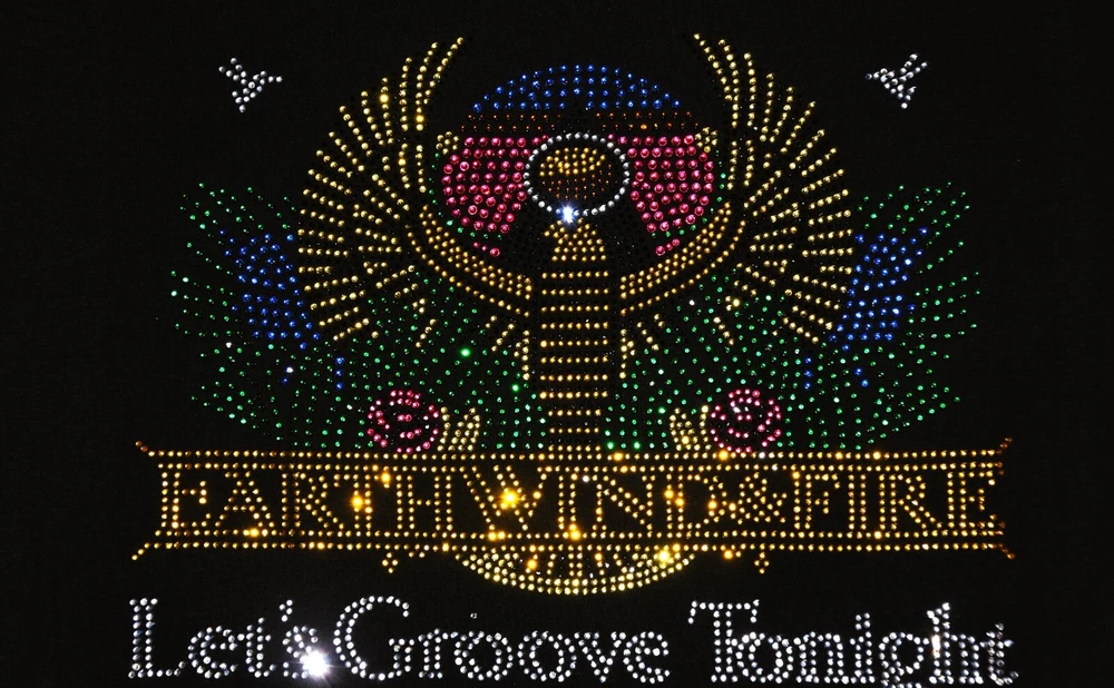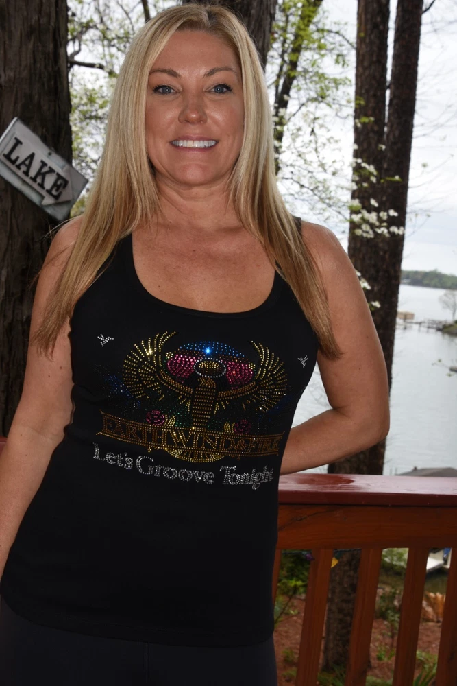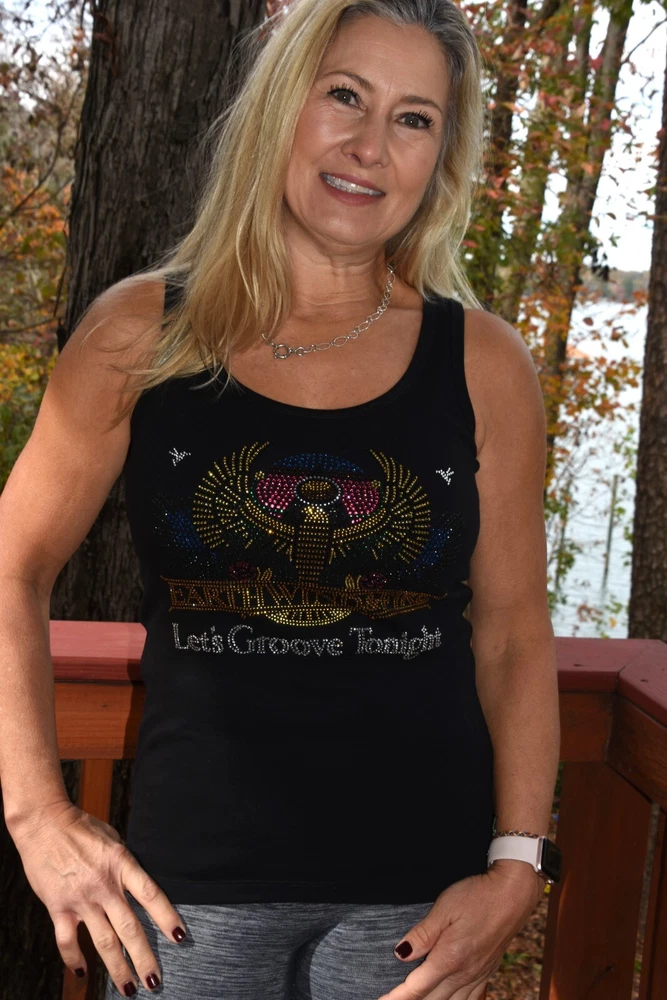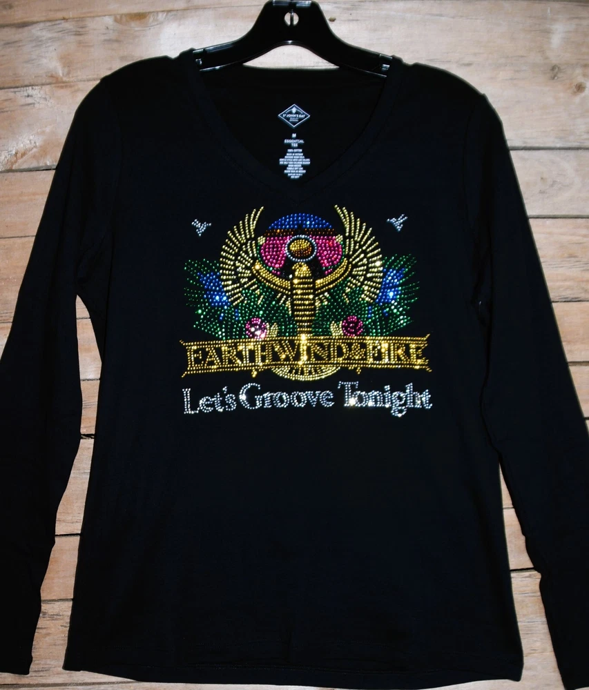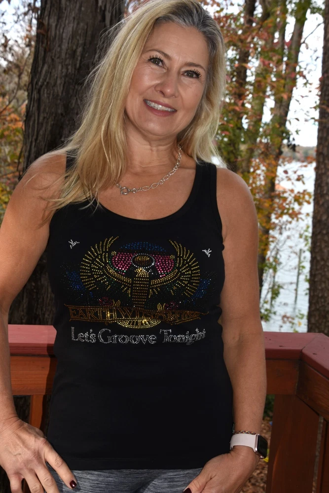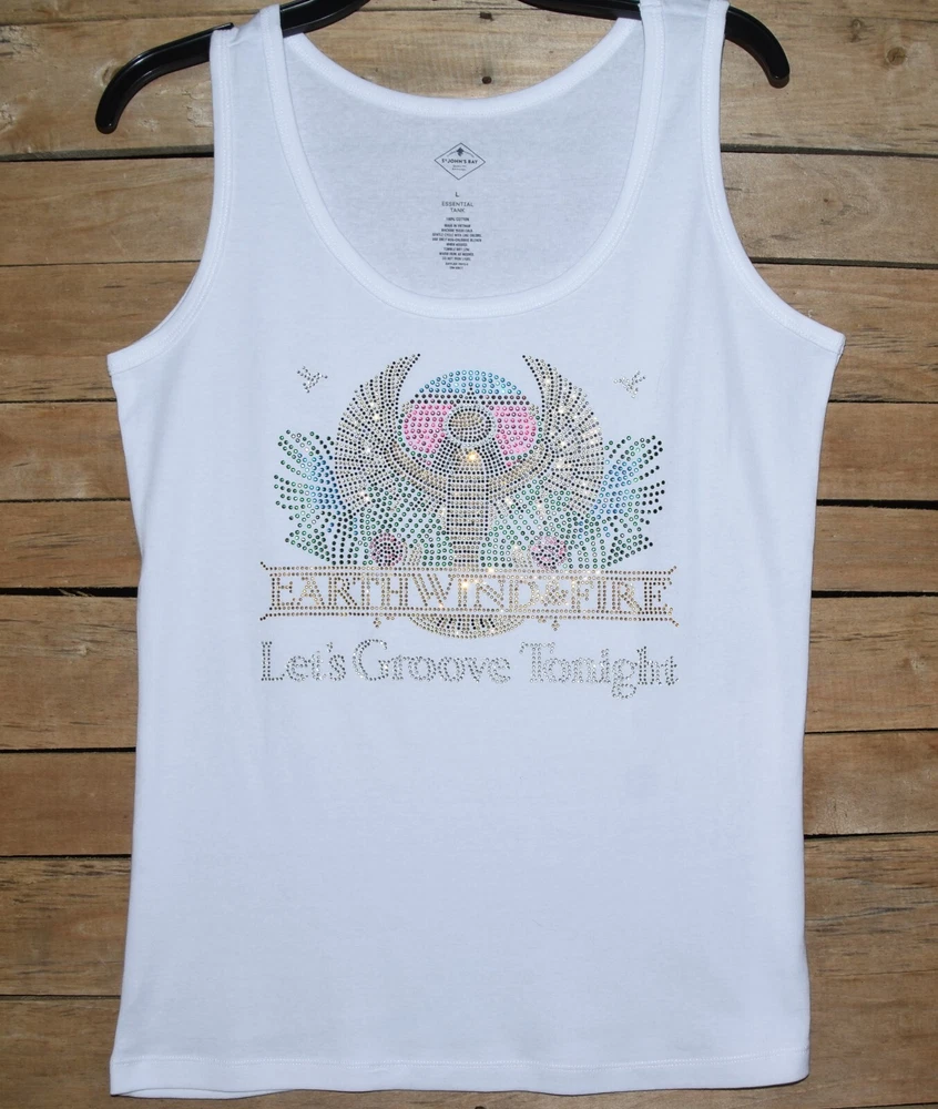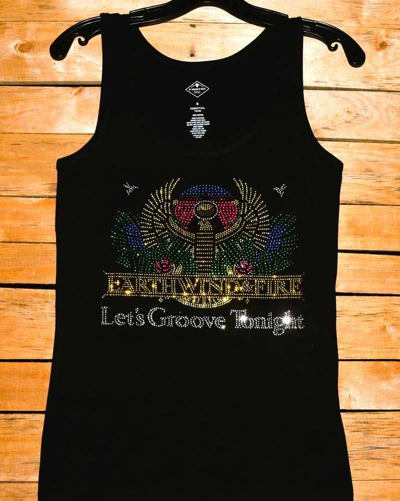 Earth Wind and Fire! Let's Groove Tonight! Show off your fun style in this first quality custom made to order rhinestone bling shirt. This is a gorgeous design featuring colorful rhinestones with lots of sparkle. Shirts used are first quality retail shirts that run true to size. They do not fit too tightly and run large in fit. It between sizes, order down a size. These are boutique quality shirts that are sure to impress your friends, family and other fans for years to come. Easy to care for shirt and little to no shrinkage! Shirts are primarily St. Johns Bay 100 percent cotton shirts. Quality is always exceptional. Tanks are only available in black or white and are round neck. Size chart: XS - sz 0/2 -Bust 31-33, Waist 23-25 S - sz 4/6- Bust 34-35, Waist 26-27 M - sz 8/10-Bust 36-37, Waist 28-29 L - sz 12/14-Bust 38.5-40.5, Waist 30.5-32.5 XL - sz 16/18-Bust 42.5 - 45, Waist 34.5 - 37 XXL - sz 20- Bust 47.5, Waist 39.5 Plus Size Chart 1X Bust 42 Waist 35 Hips 45 Dress size 16 2X Bust 46 Waist 39 Hips 49 Dress size 18-20 3X Bust 50 Waist 43 Hips 53 Dress size 22-24 4X Bust 54 Waist 47 Hips 56 Dress size 26-28 5X Bust 58 Waist 51 Hips 61 Dress size 30-32 Recommended care is gentle wash inside out, dry for 5 minutes to remove wrinkles and allow to completely dry on a hanger. The rhinestones are attached using almost 400 degrees and should not come off. Rhinestones used are first quality rhinestones with LOTS of sparkle and can rival Swarovski rhinestones!! Returns are not allowed as each shirt is custom made. Exchanges allowed. Allow up to 3 business days for shirts to be made prior to shipment. Rhinestone designs are exactly as pictured. No changes allowed. Custom orders available. Allow 3-4 weeks for from design creation to completion of final product. Contact me for more details on custom orders or to see examples of custom designs used for dance, high school teams, dance teams, cheer moms, dance moms, etc.