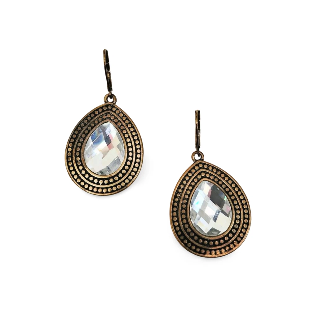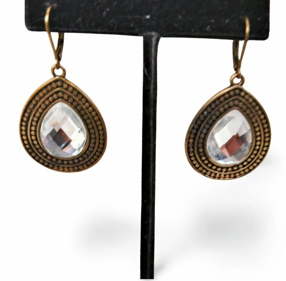Earthy Chic Faceted Crystal Teardrop Dangle Oxidized Gold Tone Drop Earrings JW1531 Inspired by nature, these gold-tone clear crystal teardrop earrings with intricate oxidized detailing in a chic drop style. Their 2-inch dangle design is perfect for elevating both casual and formal outfits. Every piece of jewelry you wear has a story to tell, make yours unforgettable. Treasure Vault's vintage and statement collections let you channel power, grace, and edge, no matter the occasion. Perfect for the woman who isn't afraid to shine, our pieces are curated to elevate your style, day or night. Ready to write the next chapter? Bundle & Save: One treasure is never enough. Add a little more to your story and save while building your perfect collection. All purchases are final; exchanges are considered case-by-case. Packaging is eco-friendly, using mostly recycled materials. #GoldToneEarrings #DangleEarrings #CrystalJewelry #ChicStyle #ElegantAccessories