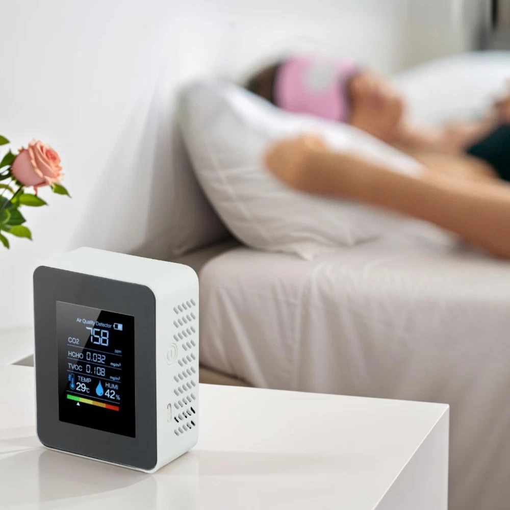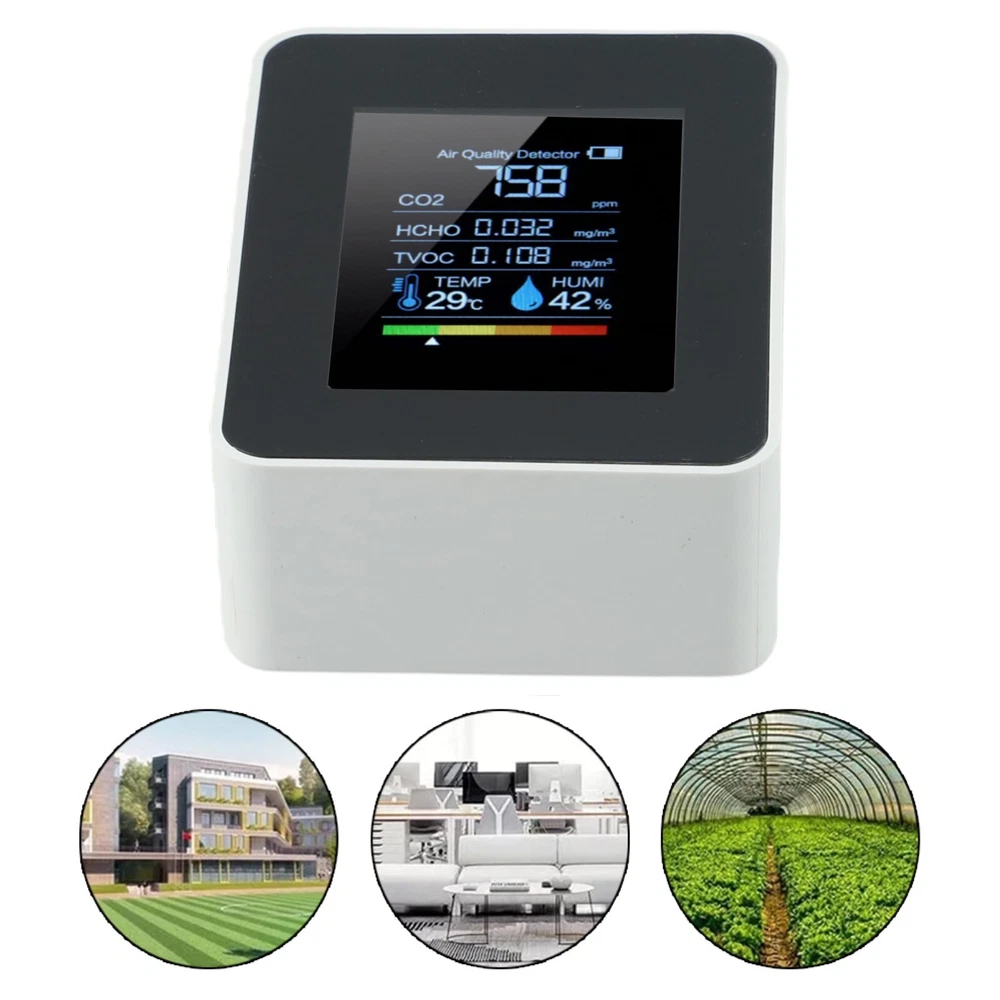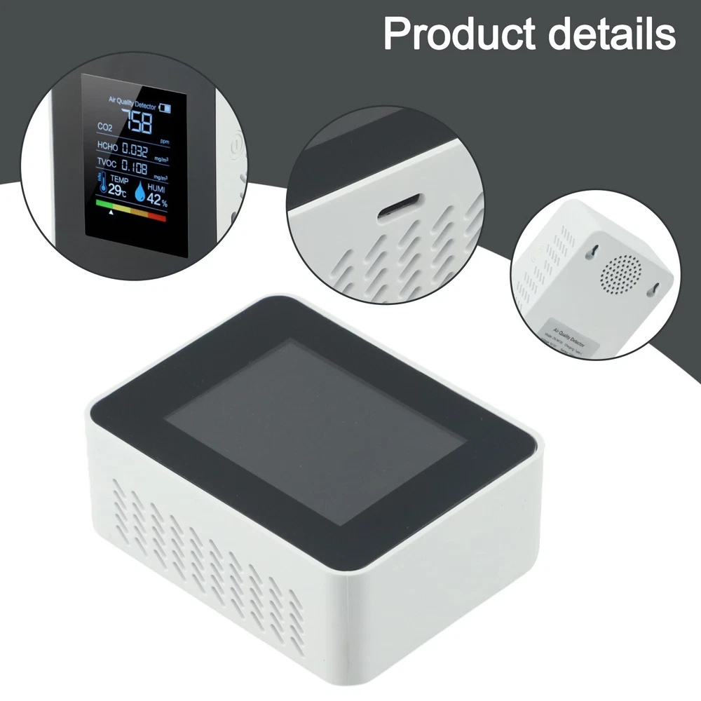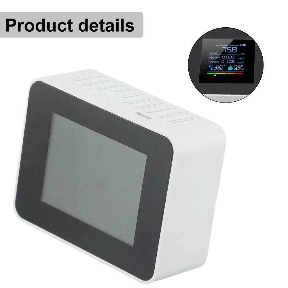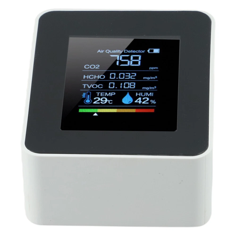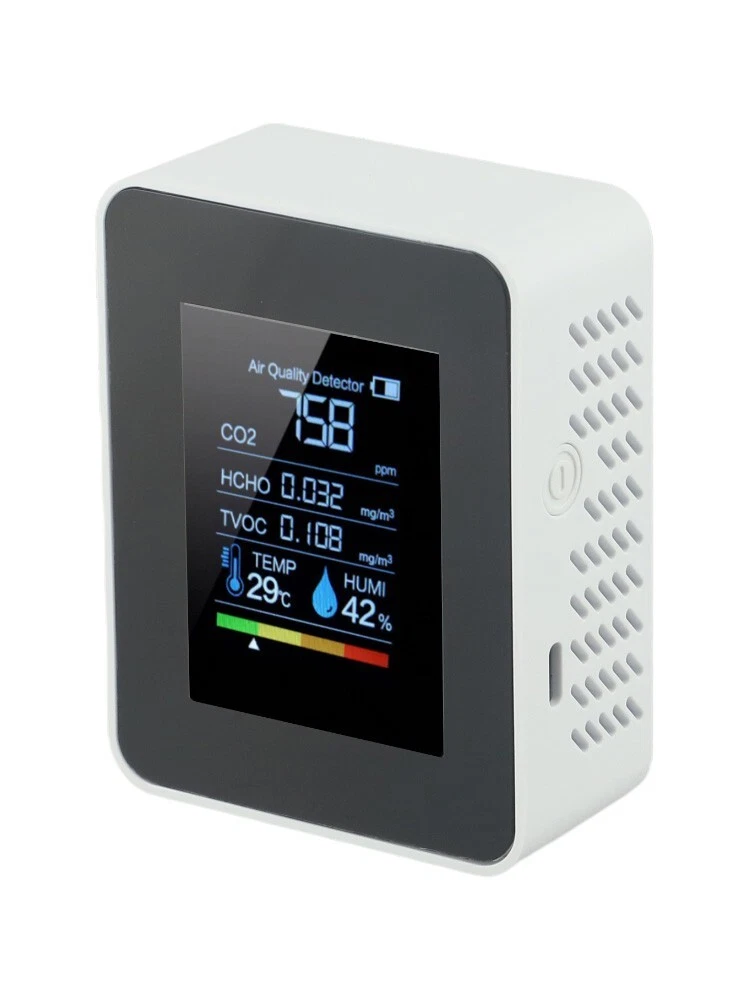Easily Portable 5 in 1 Indoor Air Tester with Rechargeable Lithium Battery DESCRIPTION Features: * Since clean air is important to everyone,a 5-in-1 air quality monitor will be your choice.This multi-function air detector can not only accurately detect carbon dioxide, HCHO, TVOC, in the air in real time,but also comprehensively detect the temperature and humidity in the air. * Equipped with a 1.9 inch ultra-high definition LED display,the data monitored by the indoor air quality monitor is clearly visible.The concentration of carbon dioxide is different,the flashing light color of the carbon dioxide monitor is different,an audible alarm will be issued when the concentration is above 1500 PPM. * The shell of the air quality detector adopts a multi-mesh design,with 4-sided openings to increase air circulation,prevent the device from getting hot,and more accurate measurement data.The service life of air quality monitor for home will be greatly extended. * With just a button,you can easily turn the air quality tester for home on or off to observe various data.Built-in 4-color LED lights conveniently indicate air quality levels,from healthy to unhealthy. * Equipped with a heavy-duty 1200 mAh rechargeable lithium-ion battery, the portable air quality monitor is designed to carry around and monitor your air quality for hours on a single charge.Plus a 5V USB cable,never be anxious about low power. Specifications: Part Name: Air Quality Detector Model: 5 in 1 Battery Capacity: 1200mAh Material: ABS Color: White Size: 90*70*35mm/3.54*2.75*1.37in Carbon Dioxide Detection Range: 400 ~ 5000 PPM Humidity Measurement Range: 0 ~ 99%RH Temp Measurement Range: 0 ~ 50℃ TVOC Detection Range: 0 ~ 2.0mg/m³ HCHO Detection Range: 0 ~ 0.6mg/m³ Package Contents: 1 x Air Quality Detector 1 x USB WIRE 1 x MANUAL Note: 1.The real color of the item may be slightly different from the pictures shown on website caused by many factors such as brightness of your monitor and light brightness. 2.Please allow slight manual measurement deviation for the data. POLICES Shipping Payment WARRANTY We only ship to confirmed ebay Order addresses. Please comfirm that your Order address is in line with your shipping address. Please kindly note that the c ombined shipping is not provided because the shipping fee is calculated by weight. Also, the each additional item means exactly the the same color and size. It takes about 7 -15 working days to US; about 10-30 working days to other countries. Transit time may be a little delayed because of the bad weather and customs inspection . If you do not receive your item within 30 working days since payment finished, please contact us immediately for further assistance. Payment must be completed within 5 days. If you have any problems about payment, please contact us via ebay message. We strive for 100% customer satisfaction! Positive Feedback is very important to us. If you have any questions, p lease feel free to contact us via "Ask seller a question" . We will reply your email within 24 working hours.