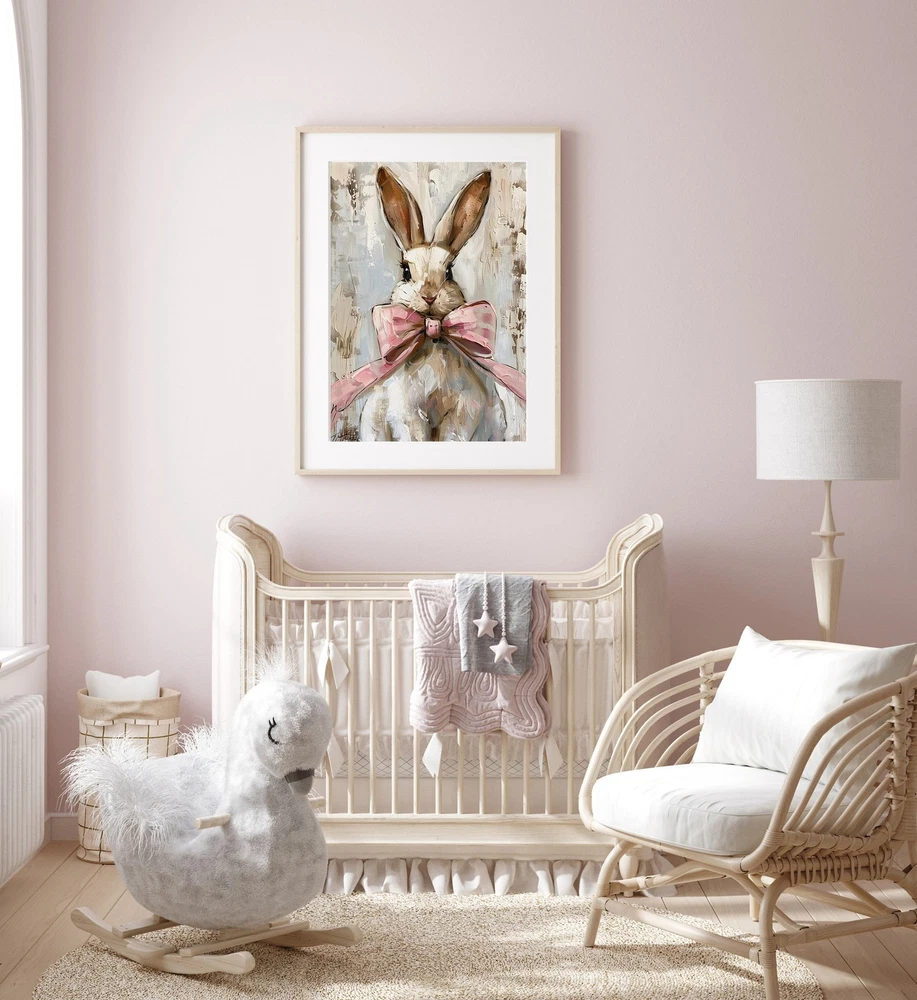 Easter Bunny Rabbit With Pink Bow Painting Spring Nursery Decor Grandmillenial Prints Granny Chic Poster Trendy Coquette Wall Art Aesthetic Material: Premium luster photo paper Print type: Inkjet printing One side printed + The finish provides the highest possible resolution and color saturation + Lasts up to 200 years in color and 400 years in black-and-white + Printed on high-quality resin-coated photo base paper medium + Posters can be hung with double-sided tape, tacks, or framed + Hand washing with a gentle cry cloth is recommended for extended durability I will hand select the best choice of paper for your chosen design to ensure top quality results for a beautiful, bright and luxurious print. All prints are sealed in cellophane slips for protection during transportation, and are shipped in a protective cardboard envelope.