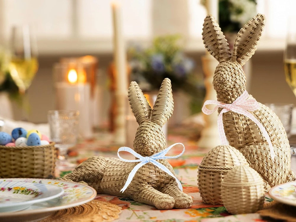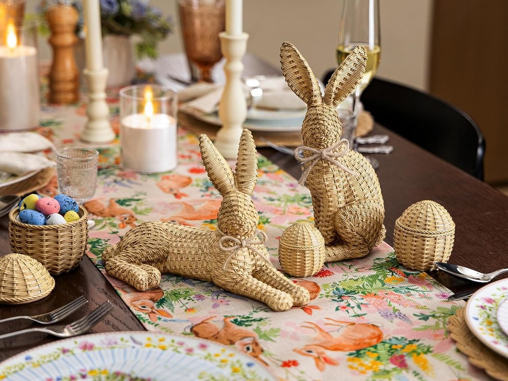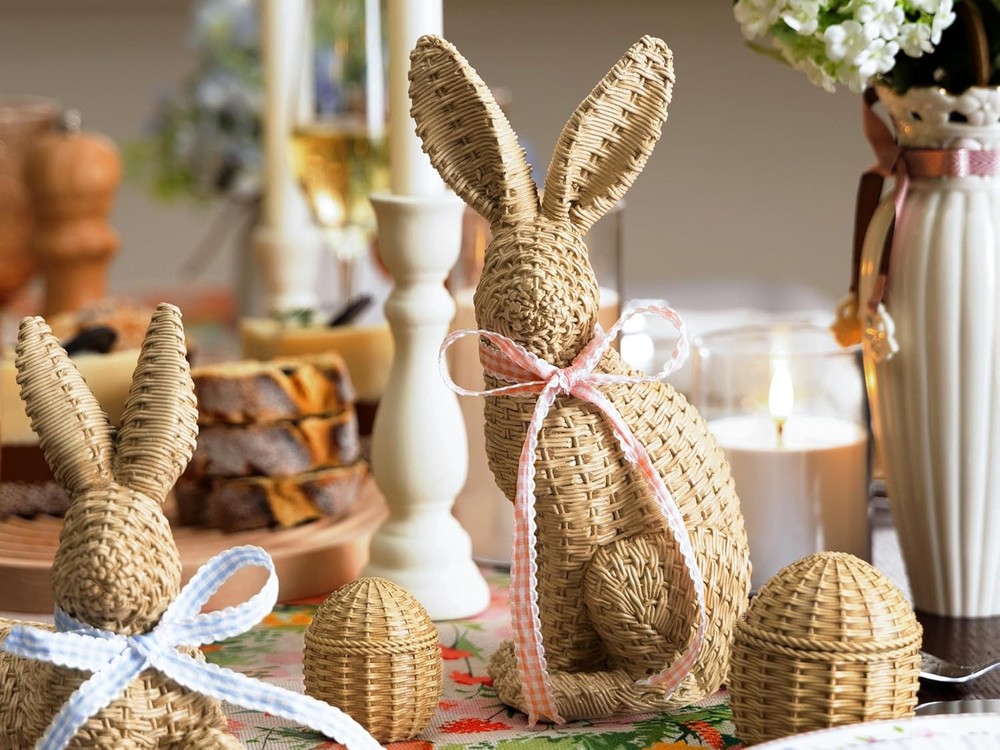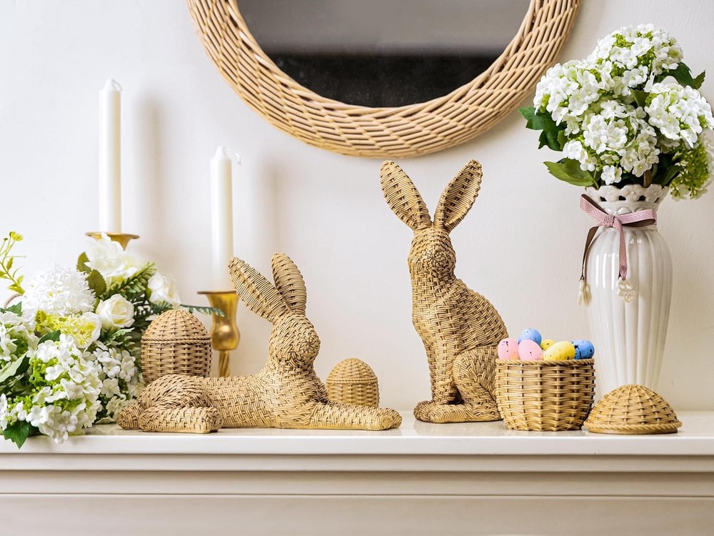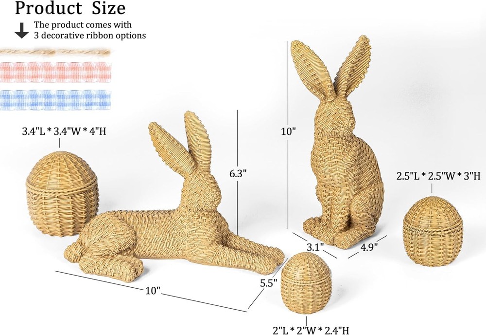 【Package Included】Includes 2 rattan-style Easter bunnies and 3 matching rattan eggs, designed to create a warm and natural Easter bunny decor look. The woven rattan effect adds texture and charm, making these Easter bunny figurines perfect for everyday home decor and seasonal displays. 【Durable Resin Material】 Made from high-quality resin, these bunny decorations feature a realistic rattan weaving texture while remaining sturdy and colorfast; More durable and resistant to humidity, making it ideal for long-lasting Easter home decor. 【Easter Home Decor】 Designed with a more substantial scale than typical small bunny figurines, both bunnies measure around 10 inches in height or length, offering a refined and balanced presence for tabletop styling without overpowering the space. 【Ideal Easter Gift】 With a rattan-style woven design, this Easter bunny decoration combines the natural charm of rattan with the durability of resin, making it a thoughtful and long-lasting Easter gift. 【Perfect Size for Easter Table】Bunny A: 10"L*5.5"W*6.3"H. Bunny B: 3.1"L*4.9"W*10"H. Three Eggs: 3.4"L*3.4"W*4"H. ; 2.5"L*2.5"W*3"H. ; 2"L*2"W*2.4"H. An ideal size for a tabletop bunny decor.