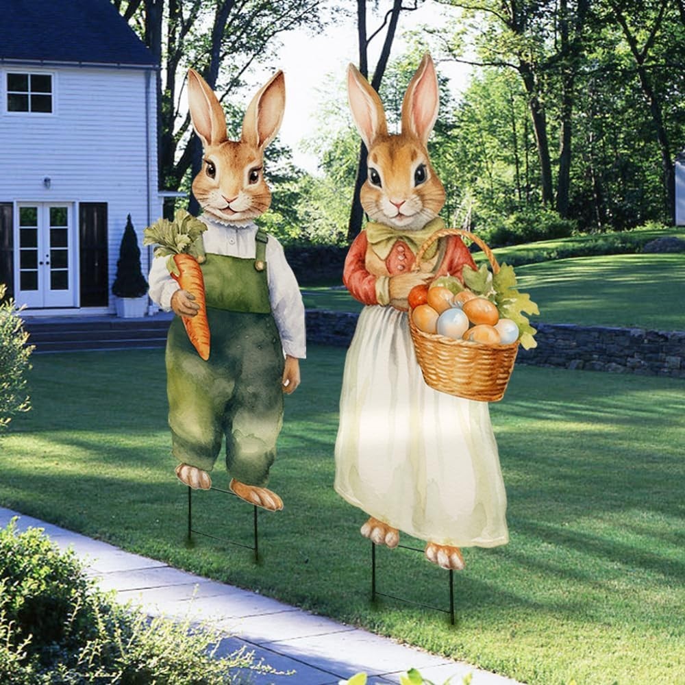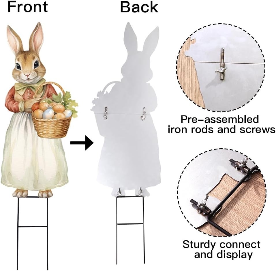About this item PACKAGE INCLUDES: 2 pcs extra large metal Easter bunny yard decorations outdoor. Each vintage bunny is about 32 inches high. Please confirm the size before purchase. Not very big but stand stably due to the quality metal. Setting the festival mood for Easter and spring. HIGH-QUALITY: Our large Easter rabbits lawn decorations are made of premium metal. Sturdy and durable as Easter outdoor decorations. Waterproof and withstands weather well, no matter wind or rain. The colors are vibrant and not easy to fade. NEW DESIGN: These farmhouse rustic Easter rabbit yard signs are designed in vintage style with carrots and eggs. Both adults and kids will find these rabbits adorable and put a smile on their face. Make your Easter party impressed. EASY TO SET UP: Each bunny is made of 2 parts. Use the pre-assembled iron rods and screws to connect the parts together. Then simply insert the "H" metal stakes into each sign and press into the ground to display. Easily make a fun addition to your Easter decor. MULTI-USE: The Easter yard decorations are designed into unique vintage rustic rabbits. Great lovely and eye-catching outside Easter decorations for the front yard, porch, lawn, garden, home, pathways, etc. Also a suitable gift for baby showers and birthday parties. This product is a set of two large metal vintage bunny yard signs, perfect for outdoor Easter decorations. The signs feature a modern style with a matte finish, depicting a happy bunny character design. Easy to care for, these signs are made of durable metal and weigh 1 lb each. The vintage design adds a touch of nostalgia to your home's décor, making them a charming addition to any room or outdoor space. Made in the United States, these yard signs are sure to bring a festive and inviting atmosphere to your Easter celebrations.