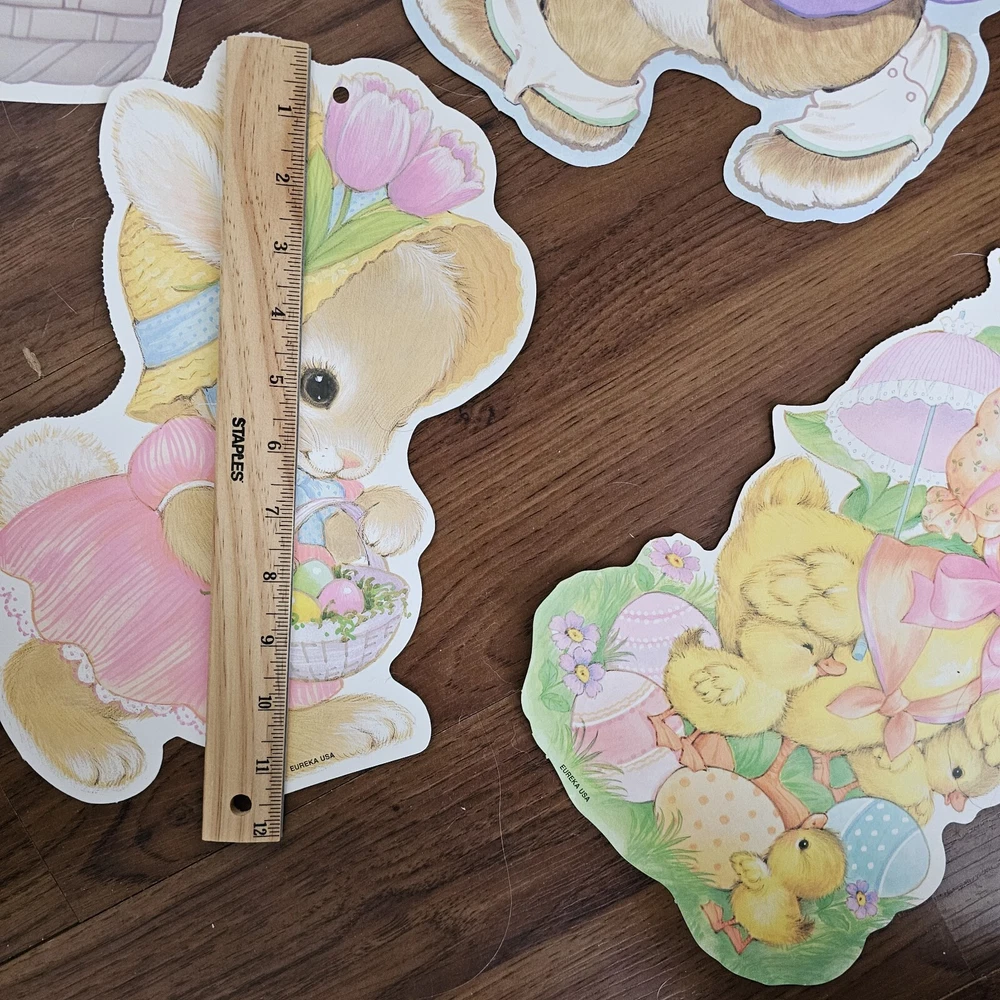 The product is a set of 5 vintage Easter die cuts featuring designs of bunnies, ducks, and lamps. These die cuts are made of paper and are two-sided. They are manufactured by Eureka in the United States. The designs are colorful and suitable for Easter decorations or crafts. See photos for some wear sold as is