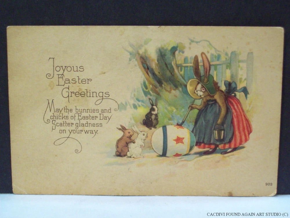 Easter Greeting Postcard Dressed Bunny Humanized Mother Rabbit Paints Big Egg This listing is for the postcard pictured only. Please check the pictures to examine the detail, checking the pictures and item description for condition. DESCRIPTION: This holiday greetings postcard features a mother or grandmother rabbit wearing a pink and red skirt, a blue bonnet with a matching apron. She is painting stars on a big colored Easter egg. Next to her three little kid bunnies looking on. MESSAGE: No CAPTION: Joyous Easter Greetings PUBLISHER: Not listed STAMP: No CANCEL: No CONDITION & TERMS By bidding / purchasing buyers understand & accept that: items are represented to the best of my ability, are used or aged, and may contain unseen faults the buyer will take full responsibility for. All items are as found and I do not sell reproductions. This item is preowned, not new, and contains imperfections. Due to age, history, use, there is surface wear with dark spots. The corners are bumped rounded with creases. Due to variations between computers, color may vary. The postcard is a dark almond color from age with spots. Please contact me prior to bidding to clarify any questions or concerns. SHIPPING Shipments start at USPS Ground Advantage. This rate allows me to use extra packing material and safely ship your item quickly. Items that are 250.00 or more will require signature confirmation. Free shipping when you choose USPS Ground Advantage when shipped within the USA. Delivery time is a estimate that does not consider weather delays, holidays, or unexpected events. Note to Florida Residents State Sales Tax will be added to purchases. International purchasers it is your responsibility to be aware of any import or customs fees your country may apply to your incoming packages. I will not falsify information on the customs forms. International purchasers will make payment by Paypal only. The International Shipping I offer is First Class Package International or Priority Mail International. Please click on to the shipping and payment tab to use the international postage calculator. If you wish your item to be shipped, Registered Mail, this will be an additional charge added to the postage rate. I AM HAPPY TO COMBINE LISTINGS! USA SHIPMENTS ARE POSTED WITH A TRACKING NUM BER! COMMUNICATION If you have any questions, please contact me via eBay messaging system early before the listing nears its end. Thank you for Looking! inkfrog terapeak