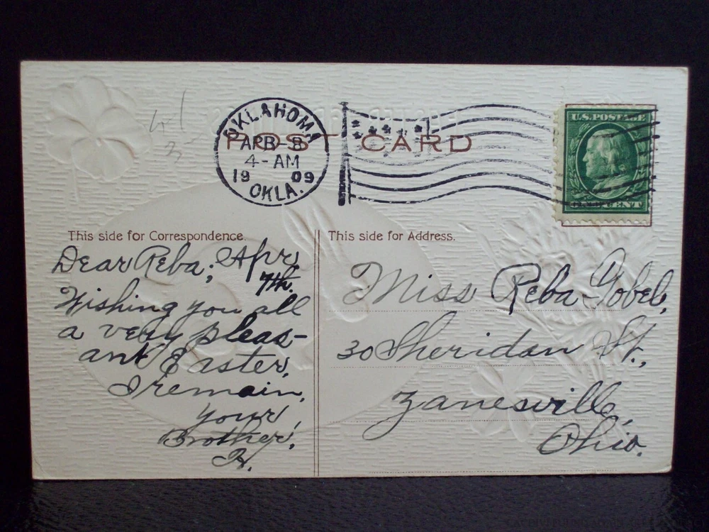Easter Greetings Postcard Bunny Rabbit Giant Egg Flowers Four Leaf Clover Pansy DESCRIPTION: This listing is for the preowned embossed Old Antique Vintage Bunny Rabbit Large Egg Flowers Four Leaf Clover Pansy Easter Greetings Postcard pictured only. This postcard features a view of a brown bunny rabbit sits by a large egg. To the right there is a purple pansy flower, to the left there is a lucky four leaf clover with pink and red carnations. MESSAGE: Yes CAPTION: Easter Greetings PUBLISHER: Copyright 1908 P. Sander N. Y. STAMP: Yes CANCEL: Oklahoma Okla 1909 / Flag Review the photos closely as they are a necessary essential part of the description. Please take in consideration that I sell preowned antique and collectible items that are rarely pristine. This postcard may show some form of use with wear due to age, it is as found. The corners are lightly bumped with chipping. This postcard is an almond color with spots. Due to variations between computers, color may vary. If you have any questions or concerns, please a message me through eBay. See my other listings for more great items! All shipments start at First Class Package Rate. This rate is higher than First Class Envelope but it allows me to use extra packing material and safely ship your item quickly. Items that are 250.00 or more will require signature confirmation. Free shipping via USPS First Class Package when shipped within the USA. Delivery time is a estimate that does not consider weather delays, holidays, or unexpected events. International purchasers it is your responsibility to be aware of any import or customs fees your country may apply to your incoming packages. I will not falsify information on the customs forms. First Class Package International rate can be expensive. Please click on to the shipping and payment tab to use the international postage calculator. If you wish your item to be shipped Registered Mail, this will be an additional charge added to the postage rate. Thank you for looking! inkfrog terapeak