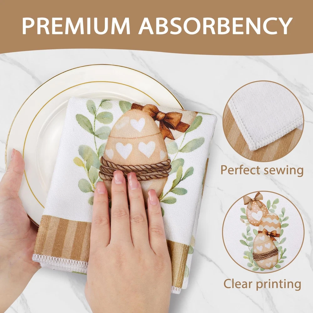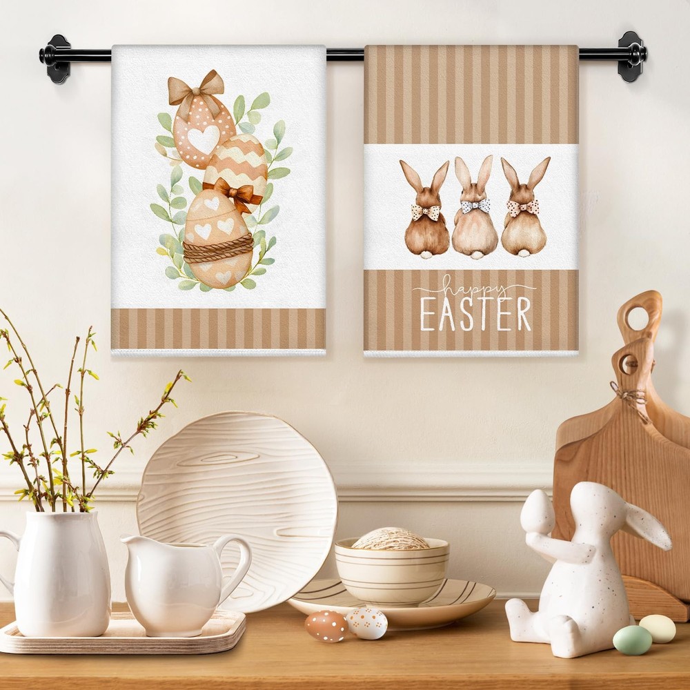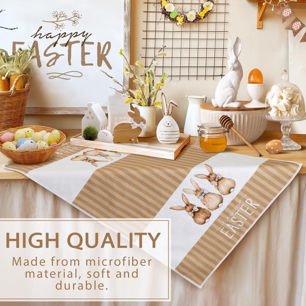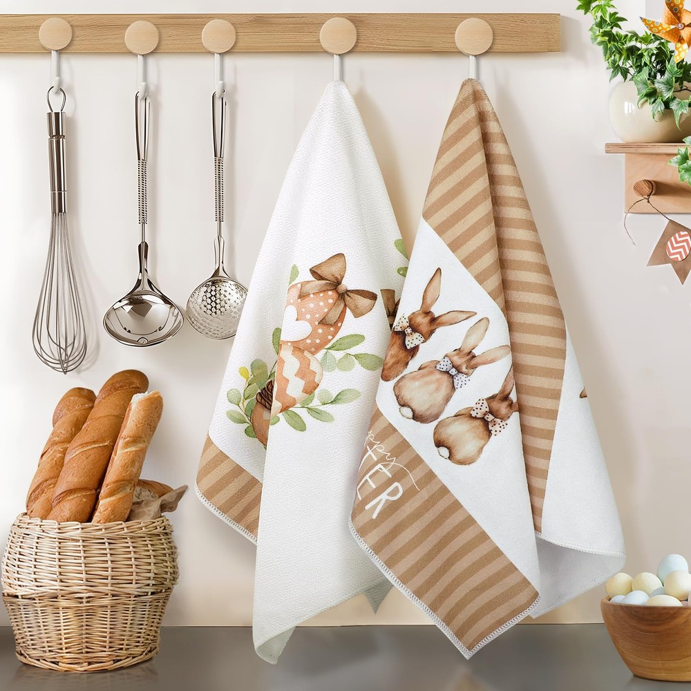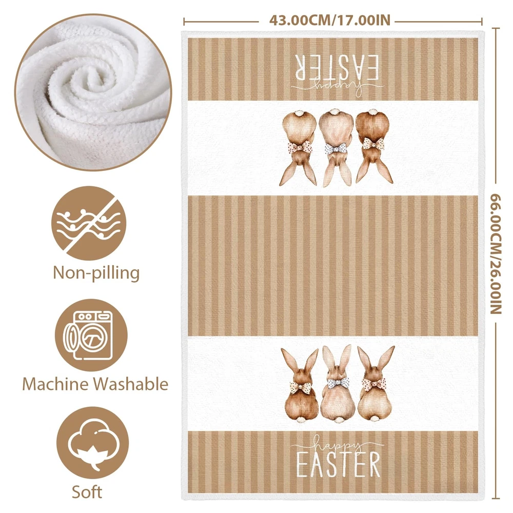 Easter towels for bathroom are the perfect additions to your kitchen decor! Crafted from Soft, absorbent material, these easter bathroom towels not only enhance your kitchen's aesthetic but also serves a practical purpose for all your cooking and baking needs.  Featuring vibrant colors and cute bunny designs, our easter tea towels are designed to bring joy to your family. The easter bath towels can decorate your kitchen. You can hang it on the drawer handles, oven handles or hanging racks in the kitchen, which is easy to access and creates a strong festive atmosphere. And it can also be used as a gift for friends, family members or people who like cooking to express the blessing and care.  In addition to the beautiful appearance, these easter bath hand towels have excellent water absorption and durability. It absorbs water quickly and is very practical when washing hands, wiping dishes or cleaning the kitchen. At the same time, after special treatment, the easter towel has a high degree of color firmness, even after repeated washing, it can still maintain the original bright color.  Durable and easy to care for, our easter hand towel is machine washable, ensuring it remains fresh and vibrant throughout the season. Whether you're drying dishes, wiping down countertops, or adding a decorative touch to your kitchen, this towel is the ideal companion for all your culinary activities.  Transform your kitchen into a beautiful garden with our easter kitchen towel—where style meets functionality. Embrace the season and let this charming accessory embody your love for Easter! Easter Kitchen Decor: These easter dish towels are specially designed for Easter, featuring exquisite Easter patterns such as bunnys, leaves and eggs, decorating your kitchen to create a festive atmosphere. High Quality Materials: Easter towels are made of soft and durable materials with good water absorption and breathability, which can efficiently absorb moisture and stains, ensuring the cleanliness of your kitchen. Multi Functional: The easter towels kitchen are of moderate size and suitable for most occasions. They can be used as hand towels, dish towels, as well as for cleaning workbenches, appliances, and tabletops in kitchens, homes, bathrooms, farmhouses, and other places. It can also be placed under a hot tea cup, teapot, or plate to protect the tabletop. Easy to Clean: This easter hand towels are easy to clean, just add a small amount of detergent and gently rub to make it clean, and can withstand multiple washes to maintain its bright color and soft texture. Easter Hostess Gift Ideas: The easter dish towel for kitchen is a good gift choice that will come in handy when you visit your neighbors and friends during Easter. It is also suitable as a housewarming gift for daughters, sons, granddaughters, grandsons who have just started a new family.