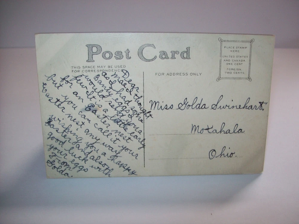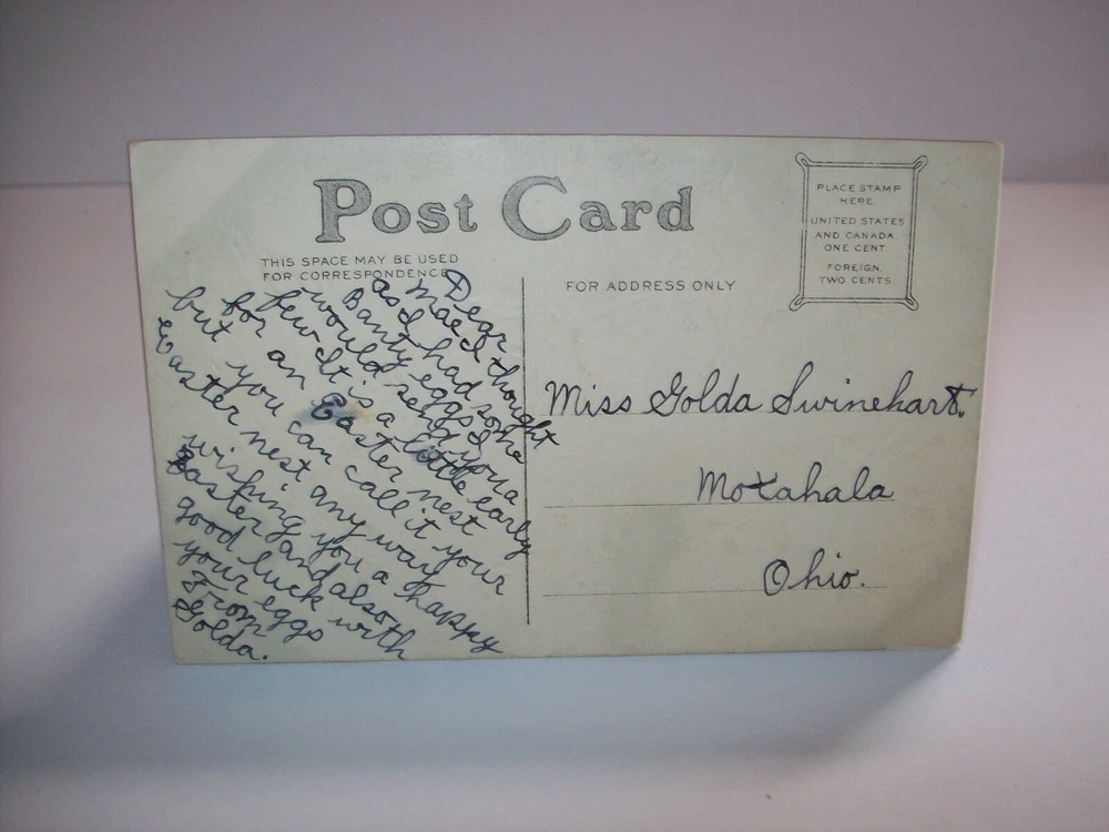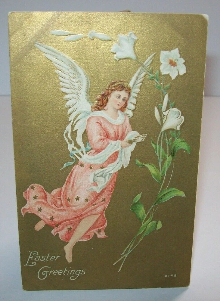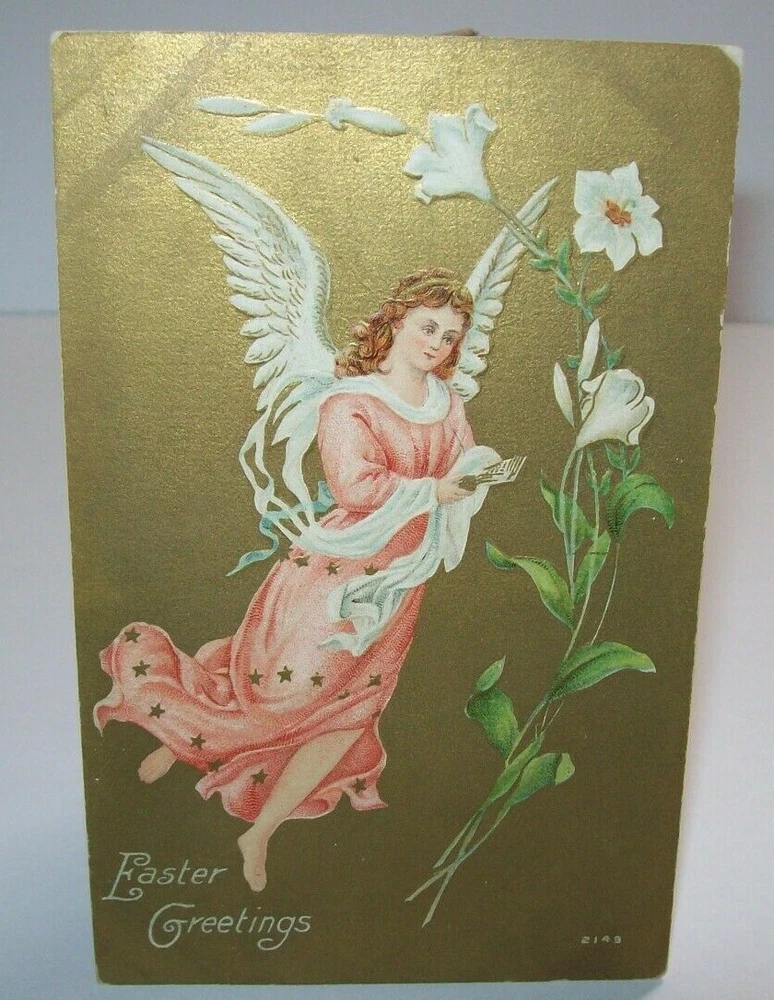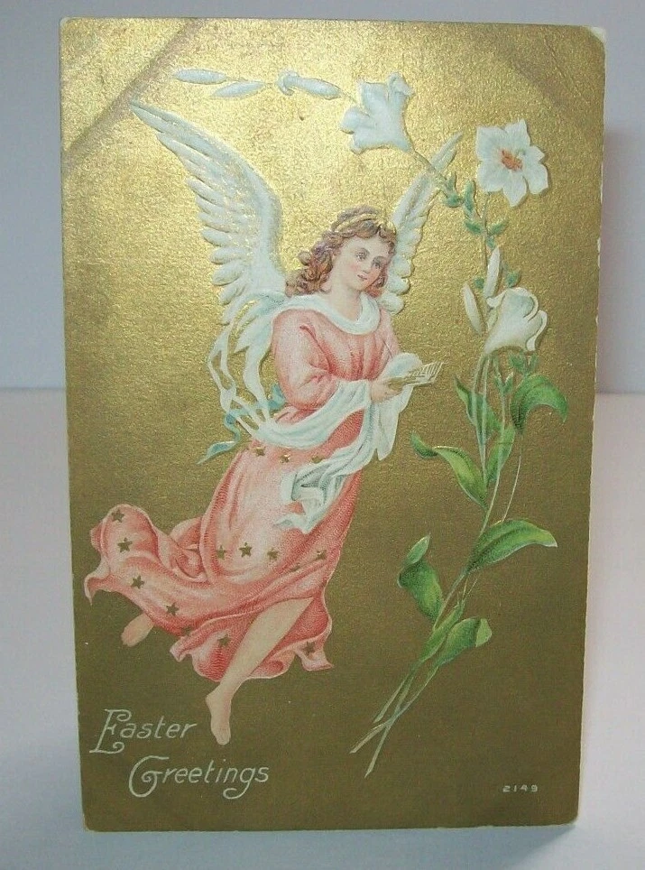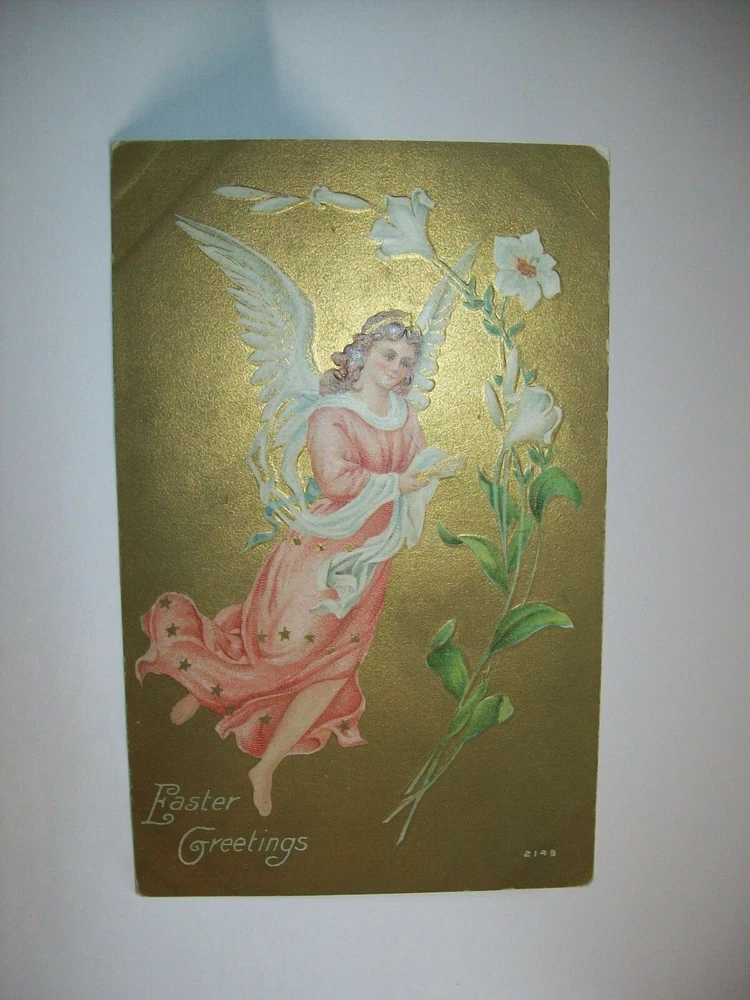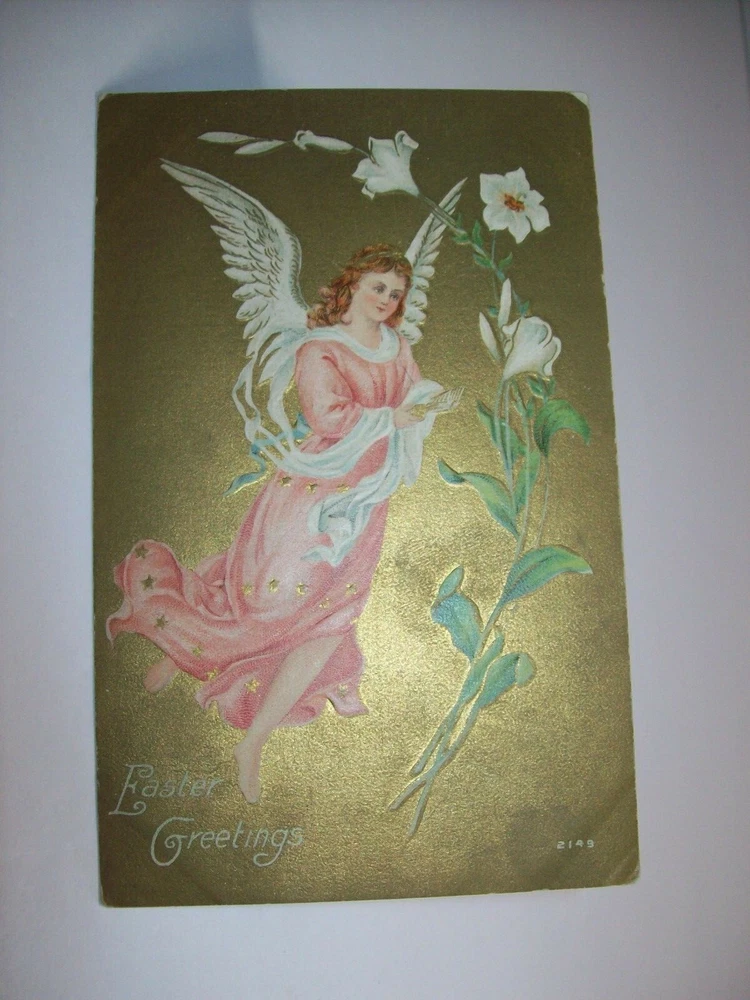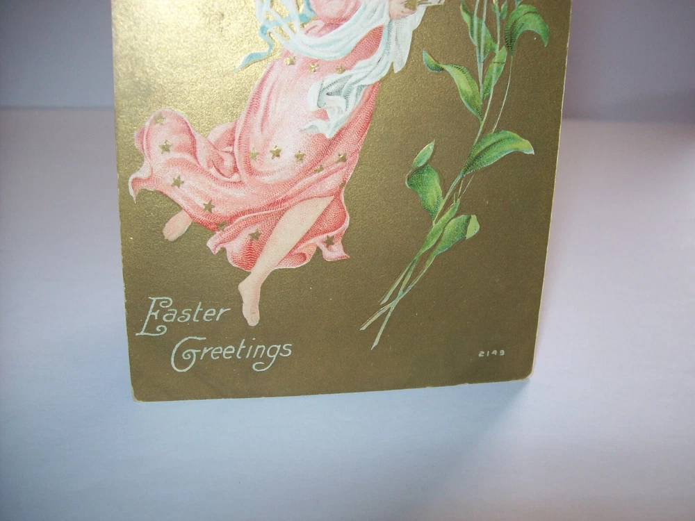 Many more vintage holiday postcards for sale in our store. Antique vintage original Easter greetings postcard. Series 2149 on front. Corners have some dings from being pressing into a postcard book. Gold effect has some discoloring. Light corner creases. Writing on back but never posted. See photos. SHIPPING Buyer pays shipping and handling. Bundle and save. Additional items will be discounted when cart is used. Add all items to cart and make a single payment to get promo offers and discounts if offered. ABOUT US Seller of antique Halloween, holiday and vintage postcards, collectibles, old advertising, artwork, original pinball flyers, video arcade flyers, pinball machine translites, magazines, Christmas items, Mad magazines, super hero memorabilia, horror themed art. Check our feedback. INTERNATIONAL BUYERS ONLY Import fees/taxes are the buyers responsibility if applicable. These fees are from your countries customs department. Value will be disclosed on customs form. Items can not be marked as gift. Bundle and save by using the cart.