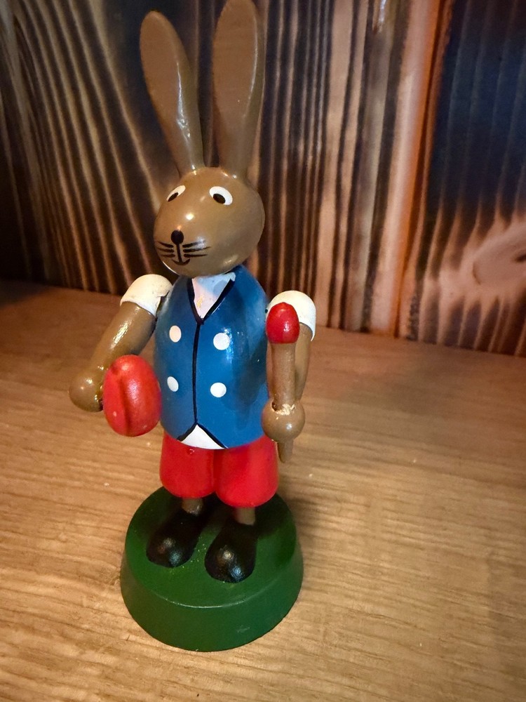 Langohr Osterhase – handbemalte Holzfigur mit Charme Dieser freundliche Osterhase mit langen Ohren bringt sofort Frühlingsstimmung ins Zuhause. Mit seiner klassischen Haltung, den kräftigen Farben und den liebevollen Details wirkt er wie ein kleines Stück vergangener Osterzeit. Der Hase ist aus Holz gefertigt und sorgfältig bemalt. In den Pfoten hält er ein rotes Ei und ein weiteres kleines Detail, was ihm einen besonders verspielten Ausdruck verleiht. Ideal als Tischdekoration, für das Fensterbrett oder als Teil einer Osterlandschaft. Durch seine zeitlose Gestaltung passt er sowohl zu nostalgischer Osterdekoration als auch zu moderner Frühlingsdeko. Details: Motiv: Osterhase mit langen Ohren Material: Holz Farbe: Mehrfarbig, handbemalt Höhe: ca. 9–10 cm (geschätzt) Zustand: Gebraucht, gut erhalten (siehe Fotos) Hinweis: Die Herkunft des Hasen ist unbekannt und wird daher bewusst nicht angegeben. Es handelt sich um einen dekorativen Osterartikel ohne Herstellerzuordnung. Ein liebevolles Stück für alle, die klassische Osterfiguren und gemütliche Frühlingsdeko mögen.